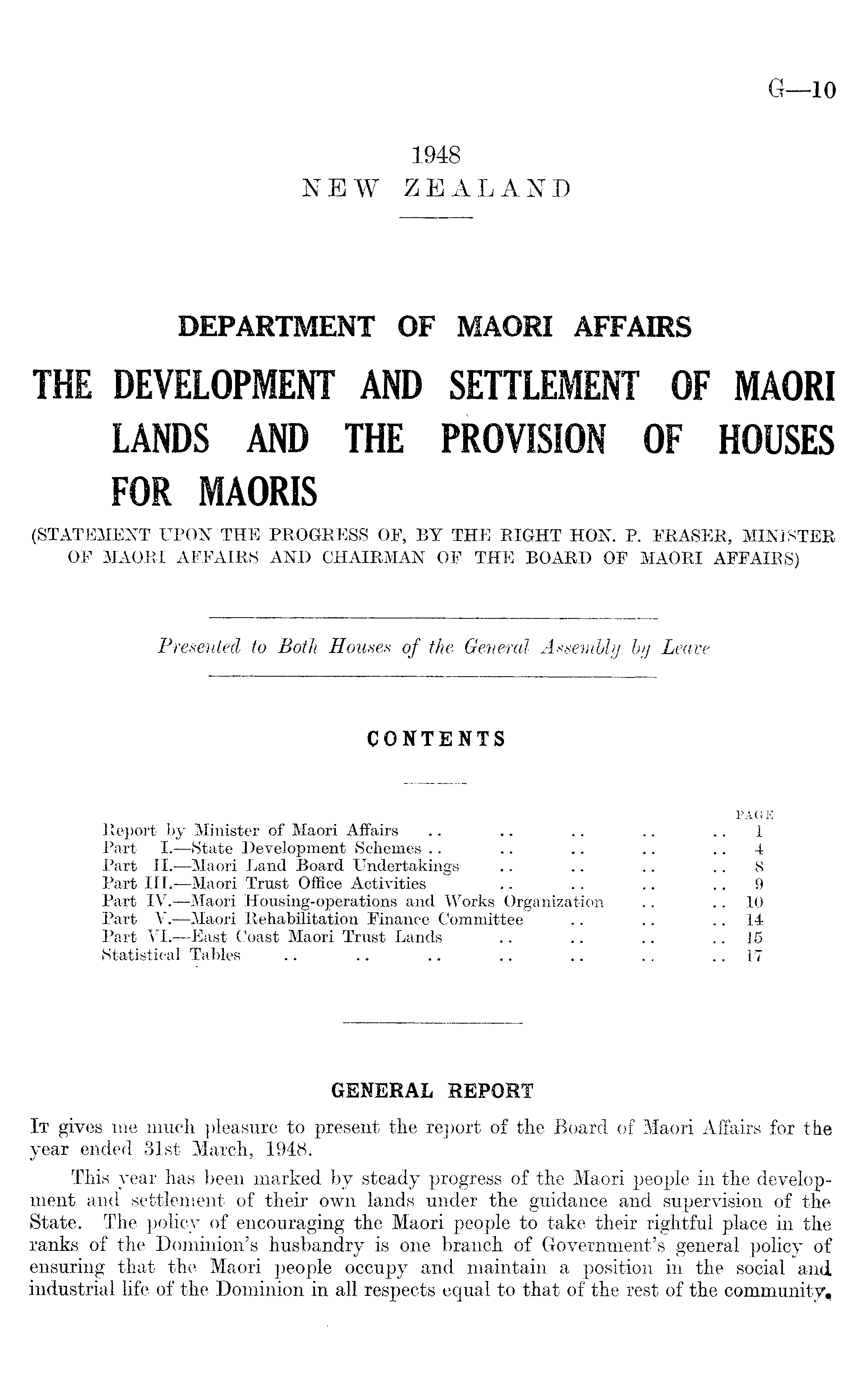 DEPARTMENT OF MAORI AFFAIRS THE DEVELOPMENT AND SETTLEMENT OF MAORI LANDS AND THE PROVISION OF HOUSES FOR MAORIS (STATEMENT UPON THE PROGRESS OF, BY THE RIGHT HON. P. FRASER, MINISTER OF MAORI AFFAIRS AND CHAIRMAN OF THE BOARD OF MAORI AFFAIRS)