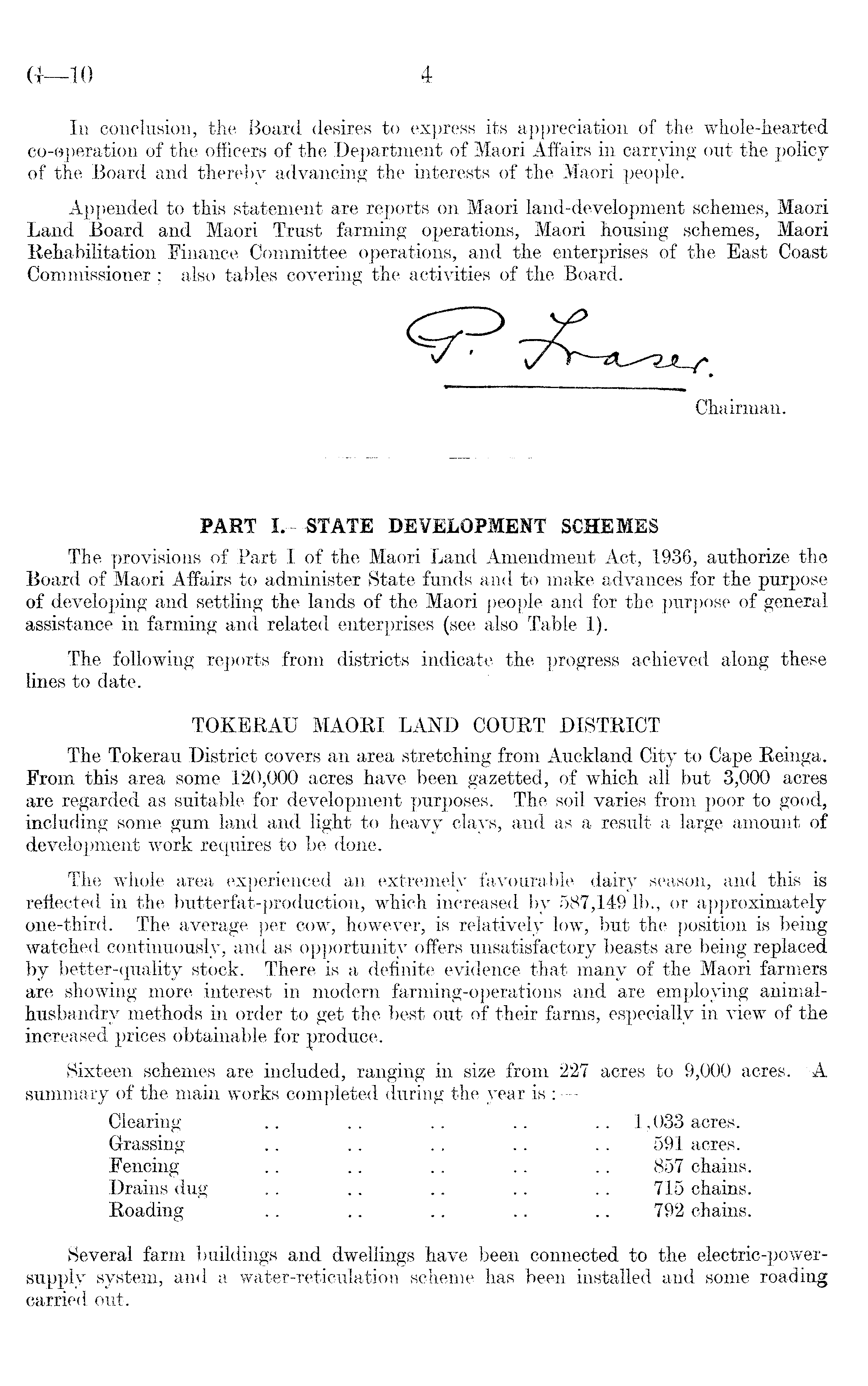 PART I. —STATE DEVELOPMENT SCHEMES The provisions of Part I of the Maori Land Amendment Act, 1936, authorize the Board of Maori Affairs to administer State funds and to make advances for the purpose of developing and settling the lands of the Maori people and for the purpose of general assistance in farming and related enterprises (see also Table 1). The following reports from districts indicate the progress achieved along these lines to date. TOKERAU MAORI LAND COURT DISTRICT The Tokerau District covers an area stretching from Auckland City to Cape Reinga. From this area some 120,000 acres have been gazetted, of which all but 3,000 acres are regarded as suitable for development purposes. The soil varies from poor to good, including some gum land and light to heavy clays, and as a result a large amount of development work requires to be done. The whole area experienced an extremely favourable dairy season, and this is reflected in the butterfat-production, which increased by 587,149 lb., or approximately one-third. The average per cow, however, is relatively low, but the position is being watched continuously, and as opportunity offers unsatisfactory beasts are being replaced by better-quality stock. There is a definite evidence that many of the Maori farmers are showing more interest in modern farming-operations and are employing animalhusbandry methods in order to get the best out of their farms, especially in view of the increased prices obtainable for produce. Sixteen schemes are included, ranging in size from 227 acres to 9,000 acres. A summary of the main works completed during the year is : Clearing .. .. .. .. .. 1,033 acres. Grassing .. .. .. .. .. 591 acres. Fencing .. .. .. .. .. 857 chains. Drains dug . . .. .. .. .. 715 chains. Roading .. .. .. .. .. 792 chains. Several farm buildings and dwellings have been connected to the electric-power-supply system, and a water-reticulation scheme has been installed and some roading carried out.