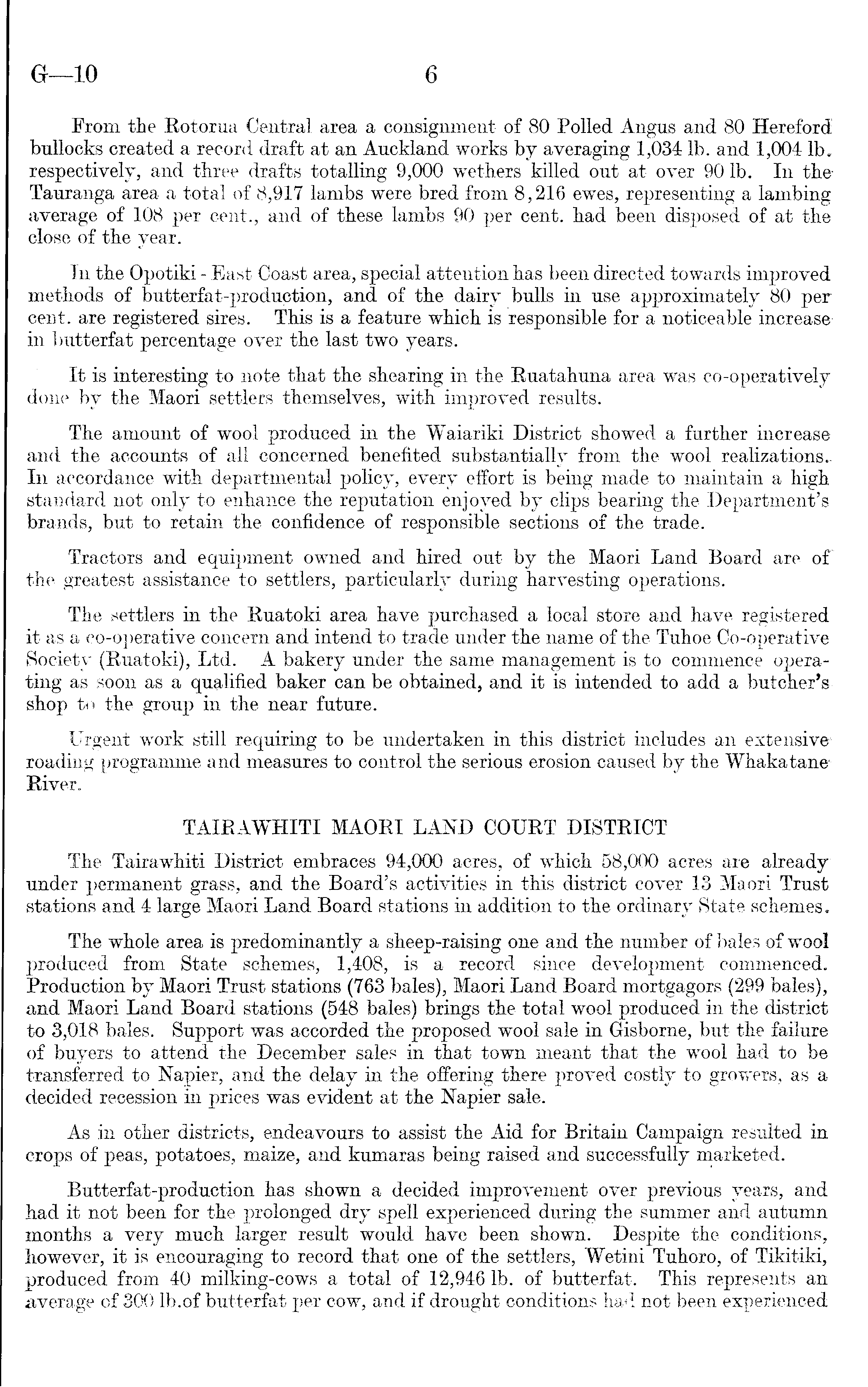 From the Rotorua Central area a consignment of 80 Polled Angus and 80 Hereford bullocks created a record draft at an Auckland works by averaging 1,034 lb. and 1,004 lb. respectively, and three drafts totalling 9,000 wethers killed out at over 90 lb. In theTauranga area a total of 8,917 lambs were bred from 8,216 ewes, representing a lambing average of 108 per cent., and of these lambs 90 per cent, had been disposed of at the close of the year. In the Opotiki - East Coast area, special attention has been directed towards improved methods of butterfat-production, and of the dairy bulls in use approximately 80 per cent, are registered sires. This is a feature which is responsible for a noticeable increase in butterfat percentage over the last two years. It is interesting to note that the shearing in the Ruatahuna area was co-operatively done by the Maori settlers themselves, with improved results. The amount of wool produced in the Waiariki District showed a further increase and the accounts of all concerned benefited substantially from the wool realizations .- In accordance with departmental policy, every effort is being made to maintain a high, standard not only to enhance the reputation enjoyed by clips bearing the Department's brands, but to retain the confidence of responsible sections of the trade. Tractors and equipment owned and hired out by the Maori Land Board are of" the greatest assistance to settlers, particularly during harvesting operations. The settlers in the Ruatoki area have purchased a local store and have registered it as a co-operative concern and intend to trade under the name of the Tuhoe Co-operative Society (Ruatoki), Ltd. A bakery under the same management is to commence operating as soon as a qualified baker can be obtained, and it is intended to add a butcher's shop to the group in the near future. Urgent work still requiring to be undertaken in this district includes an extensiveroading programme and measures to control the serious erosion caused by the Whakatane' River. TAIRAWHITI MAORI LAND COURT DISTRICT The Tairawhiti District embraces 94,000 acres, of which 58,000 acres are already under permanent grass, and the Board's activities in this district cover 13 Maori Trust stations and 4 large Maori Land Board stations in addition to the ordinary State schemes. The whole area is predominantly a sheep-raising one and the number of bales of wool produced from State schemes, 1,408, is a record since development commenced. Production by Maori Trust stations (763 bales), Maori Land Board mortgagors (299 bales), and Maori Land Board stations (548 bales) brings the total wool produced in the district to 3,018 bales. Support was accorded the proposed wool sale in Gisborne, but the failure of buyers to attend the December sales in that town meant that the wool had to be transferred to Napier, and the delay in the offering there proved costly to growers, as a decided recession in prices was evident at the Napier sale. As in other districts, endeavours to assist the Aid for Britain Campaign resulted in crops of peas, potatoes, maize, and kumaras being raised and successfully marketed. Butterfat-production has shown a decided improvement over previous years, and had it not been for the prolonged dry spell experienced during the summer and autumn months a very much larger result would have been shown. Despite the conditions, however, it is encouraging to record that one of the settlers, Wetini Tuhoro, of Tikitiki, produced from 40 milking-cows a total of 12,946 lb. of butterfat. This represents an average of 300 lb.of butterfat per cow, and if drought conditions had not been experienced