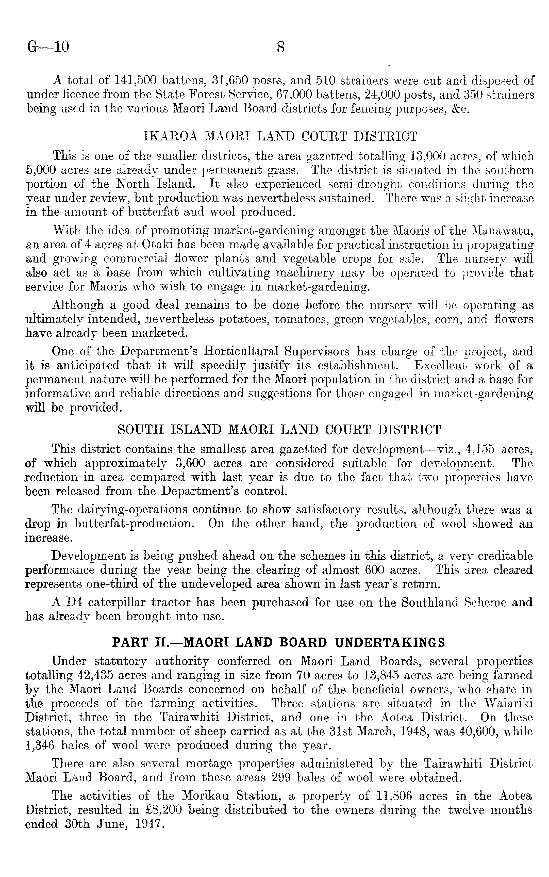 A total of 141,500 battens, 31,650 posts, and 510 strainers were cut and disposed of under licence from the State Forest Service, 67,000 battens, 24,000 posts, and 350 strainers being used in the various Maori Land Board districts for fencing purposes, &c. IKAROA MAOEI LAND COURT DISTRICT This is one of the smaller districts, the area gazetted totalling 13,000 acres, of which 5,000 acres are already under permanent grass. The district is situated in the southern portion of the North Island. It also experienced semi-drought conditions during the year under review, but production was nevertheless sustained. There was a slight increase in the amount of butterfat and wool produced. With the idea of promoting market-gardening amongst the Maoris of the Manawatu, an area of 4 acres at Otaki has been made available for practical instruction in propagating and growing commercial flower plants and vegetable crops for sale. The nursery will also act as a base from which cultivating machinery may be operated to provide that service for Maoris who wish to engage in market-gardening. Although a good deal remains to be done before the nursery will be operating as ultimately intended, nevertheless potatoes, tomatoes, green vegetables, corn, and flowers have already been marketed. One of the Department's Horticultural Supervisors has charge of the project, and it is anticipated that it will speedily justify its establishment. Excellent work of a permanent nature will be performed for the Maori population in the district and a base for informative and reliable directions and suggestions for those engaged in market-gardening will be provided. SOUTH ISLAND MAORI LAND COURT DISTRICT This district contains the smallest area gazetted for development—viz., 4,155 acres, of which approximately 3,600 acres are considered suitable for development. The reduction in area compared with last year is due to the fact that two properties have been released from the Department's control. The dairying-operations continue to show satisfactory results, although there was a drop in butterfat-production. On the other hand, the production of wool showed an increase. Development is being pushed ahead on the schemes in this district, a very creditable performance during the year being the clearing of almost 600 acres. This area cleared represents one-third of the undeveloped area shown in last year's return. A D 4 caterpillar tractor has been purchased for use on the Southland Scheme and has already been brought into use. PART lI.—MAORI LAND BOARD UNDERTAKINGS Under statutory authority conferred on Maori Land Boards, several properties totalling 42,435 acres and ranging in size from 70 acres to 13,845 acres are being farmed by the Maori Land Boards concerned on behalf of the beneficial owners, who share in the proceeds of the farming activities. Three stations are situated in the Waiariki District, three in the Tairawhiti District, and one in the Aotea District. On these stations, the total number of sheep carried as at the 31st March, 1948, was 40,600, while 1,346 bales of wool were produced during the year. There are also several mortage properties administered by the Tairawhiti District Maori Land Board, and from these areas 299 bales of wool were obtained. The activities of the Morikau Station, a property of 11,806 acres in the Aotea District, resulted in £8,200 being distributed to the owners during the twelve months ended 30th June, 1947.