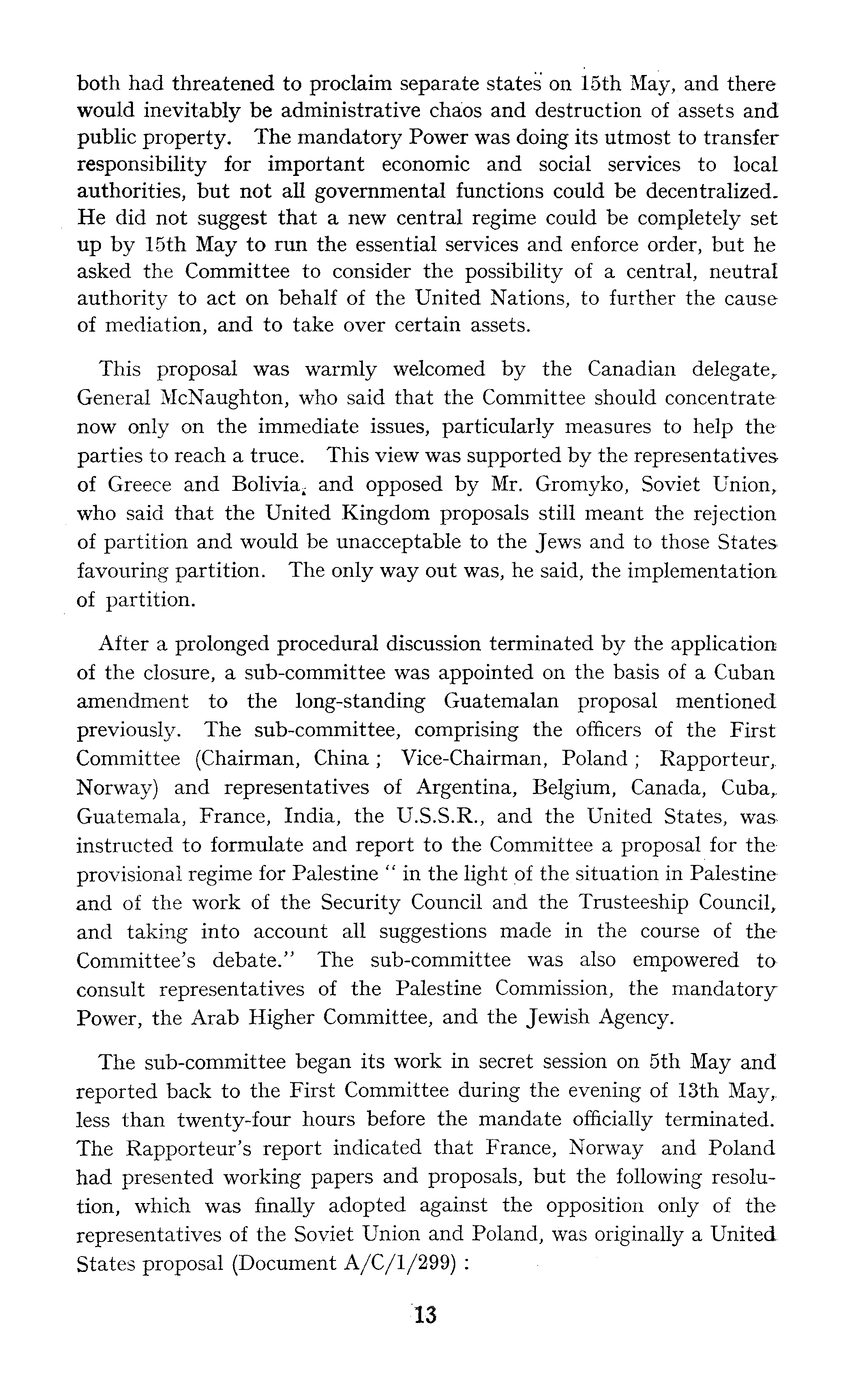 both had threatened to proclaim separate states on 15th May, and there would inevitably be administrative chaos and destruction of assets and public property. The mandatory Power was doing its utmost to transfer responsibility for important economic and social services to local authorities, but not all governmental functions could be decentralized. He did not suggest that a new central regime could be completely set up by 15th May to run the essential services and enforce order, but he asked the Committee to consider the possibility of a central, neutral authority to act on behalf of the United Nations, to further the cause of mediation, and to take over certain assets. This proposal was warmly welcomed by the Canadian delegate, General McNaughton, who said that the Committee should concentrate now only on the immediate issues, particularly measures to help the parties to reach a truce. This view was supported by the representatives of Greece and Bolivia ; and opposed by Mr. Gromyko, Soviet Union, who said that the United Kingdom proposals still meant the rejection of partition and would be unacceptable to the Jews and to those States favouring partition. The only way out was, he said, the implementation of partition. After a prolonged procedural discussion terminated by the application of the closure, a sub-committee was appointed on the basis of a Cuban amendment to the long-standing Guatemalan proposal mentioned previously. The sub-committee, comprising the officers of the First Committee (Chairman, China; Vice-Chairman, Poland; Rapporteur, Norway) and representatives of Argentina, Belgium, Canada, Cuba, Guatemala, France, India, the U.S.S.R., and the United States, was instructed to formulate and report to the Committee a proposal for the provisional regime for Palestine " in the light of the situation in Palestine and of the work of the Security Council and the Trusteeship Council, and taking into account all suggestions made in the course of the Committee's debate." The sub-committee was also empowered to consult representatives of the Palestine Commission, the mandatory Power, the Arab Higher Committee, and the Jewish Agency. The sub-committee began its work in secret session on sth May and reported back to the First Committee during the evening of 13th May, less than twenty-four hours before the mandate officially terminated. The Rapporteur's report indicated that France, Norway and Poland had presented working papers and proposals, but the following resolution, which was finally adopted against the opposition only of the representatives of the Soviet Union and Poland, was originally a United States proposal (Document A/C/l/299) :