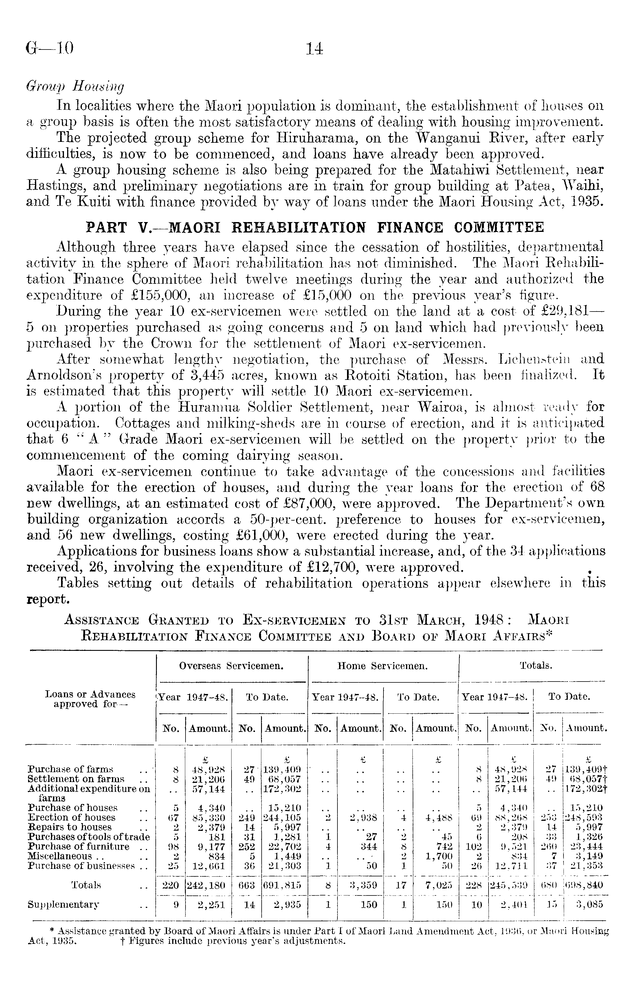 Group Housing In localities where the Maori population is dominant, the establishment of houses on a group basis is often the most satisfactory means of dealing with housing improvement. The projected group scheme for Hiruharama, on the Wanganui Eiver, after early difficulties, is now to be commenced, and loans have already been approved. A group housing scheme is also being prepared for the Matahiwi Settlement, near Hastings, and preliminary negotiations are in train for group building at Patea, Waihi, and Te Kuiti with finance provided by way of loans under the Maori Housing Act, 1935. PART V.—MAORI REHABILITATION FINANCE COMMITTEE Although three years have elapsed since the cessation of hostilities, departmental activity in the sphere of Maori rehabilitation has not diminished. The Maori Rehabilitation Finance Committee held twelve meetings during the year and authorized the expenditure of £155,000, an increase of £15,000 on the previous year's figure. During the year 10 ex-servicemen were settled on the land at a cost of £29,181 —■ 5 on properties purchased as going concerns and 5 on land which bad previously been purchased by the Crown for the settlement of Maori ex-servicemen. After somewhat lengthy negotiation, the purchase of Messrs. Lichenstein and Arnoldson's property of 3,445 acres, known as Eotoiti Station, has been finalized. It is estimated that this property will settle 10 Maori ex-servicemen. A portion of the Huramua Soldier Settlement, near Wairoa, is almost ready for occupation. Cottages and milking-sheds are in course of erection, and it is anticipated that 6 " A " Grade Maori ex-servicemen will be settled on the property prior to the commencement of the coming dairying season. Maori ex-servicemen continue to take advantage of the concessions and facilities available for the erection of houses, and during the year loans for the erection of 68 new dwellings, at an estimated cost of £87,000, were approved. The Department's own building organization accords a 50-per-cent. preference to houses for ex-servicemen, and 56 new dwellings, costing £61,000, were erected during the year. Applications for business loans show a substantial increase, and, of the 34 applications received, 26, involving the expenditure of £12,700, were approved. Tables setting out details of rehabilitation operations appear elsewhere in this report.