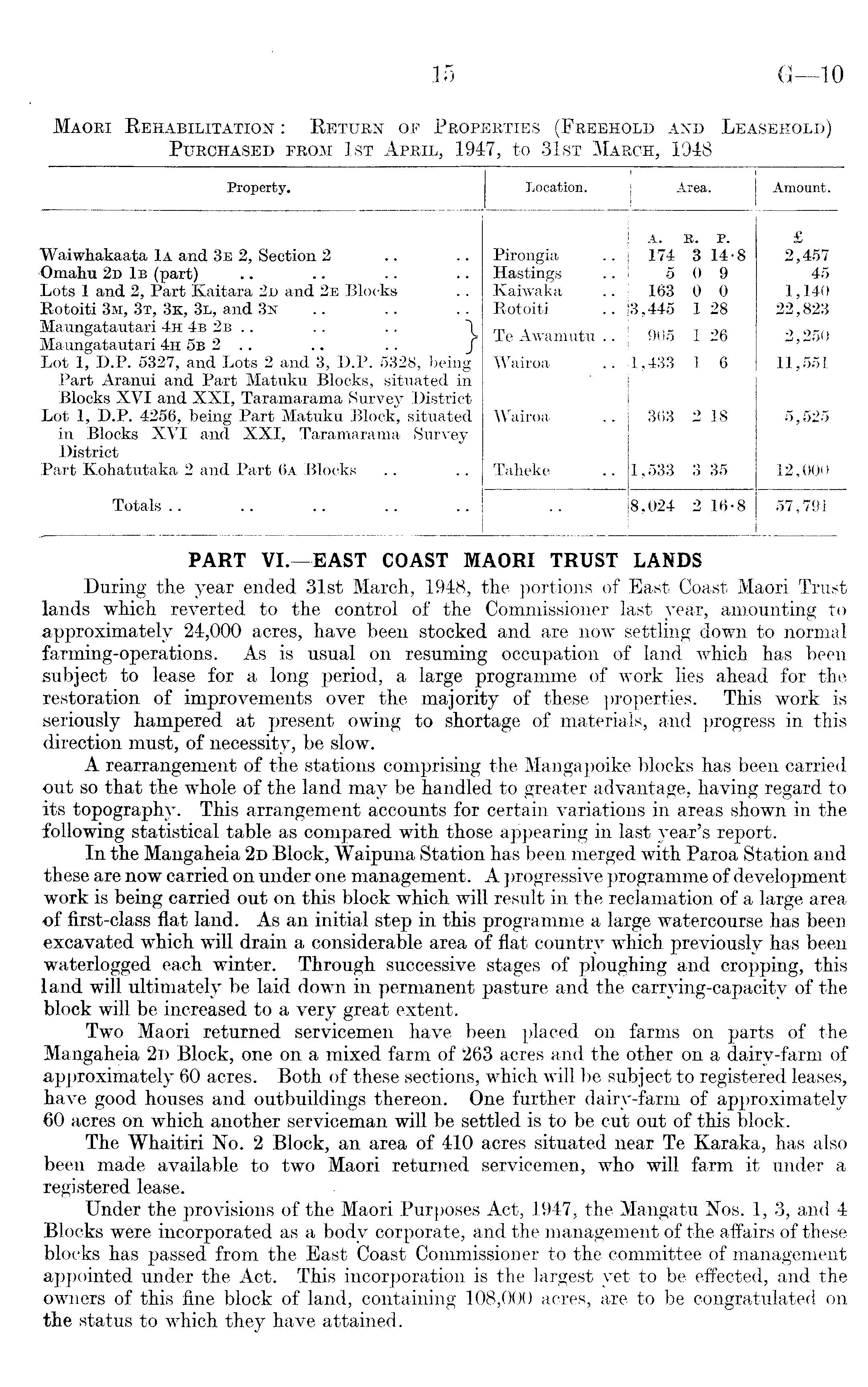 PART VI.—EAST COAST MAORI TRUST LANDS During the year ended 31st March, 1948, the portions of East Coast Maori Trust lands which reverted to the control of the Commissioner last year, amounting to approximately 24,000 acres, have been stocked and are now settling down to normal farming-operations. As is usual on resuming occupation of land which has been subject to lease for a long period, a large programme of work lies ahead for the restoration of improvements over the majority of these properties. This work is seriously hampered at present owing to shortage of materials, and progress in this direction must, of necessity, be slow. A rearrangement of the stations comprising the Mangapoike blocks has been carried out so that the whole of the land may be handled to greater advantage, having regard to its topography. This arrangement accounts for certain variations in areas shown in the following statistical table as compared with those appearing in last year's report. In the Mangaheia 2d Block, Waipuna Station has been merged with Paroa Station and these are now carried on under one management. A progressive programme of development work is being carried out on this block which will result in the reclamation of a large area of first-class flat land. As an initial step in this programme a large watercourse has been excavated which will drain a considerable area of flat country which previously has been waterlogged each winter. Through successive stages of ploughing and cropping, this land will ultimately be laid down in permanent pasture and the carrying-capacity of the block will be increased to a very great extent. Two Maori returned servicemen have been placed on farms on parts of the Mangaheia 2d Block, one on a mixed farm of 263 acres and the other on a dairy-farm of approximately 60 acres. Both of these sections, which will be subject to registered leases, have good houses and outbuildings thereon. One further dairy-farm of approximately 60 acres on which another serviceman will be settled is to be cut out of this block. The Whaitiri No. 2 Block, an area of 410 acres situated near Te Karaka, has also been made available to two Maori returned servicemen, who will farm it under a registered lease. Under the provisions of the Maori Purposes Act, 1947, the Mangatu Nos. 1, 3, and 4 Blocks were incorporated as a body corporate, and the management of the affairs of these blocks has passed from the East Coast Commissioner to the committee of management appointed under the Act. This incorporation is the largest yet to be effected, and the owners of this fine block of land, containing 108,000 acres, are to be congratulated on the status to which they have attained.