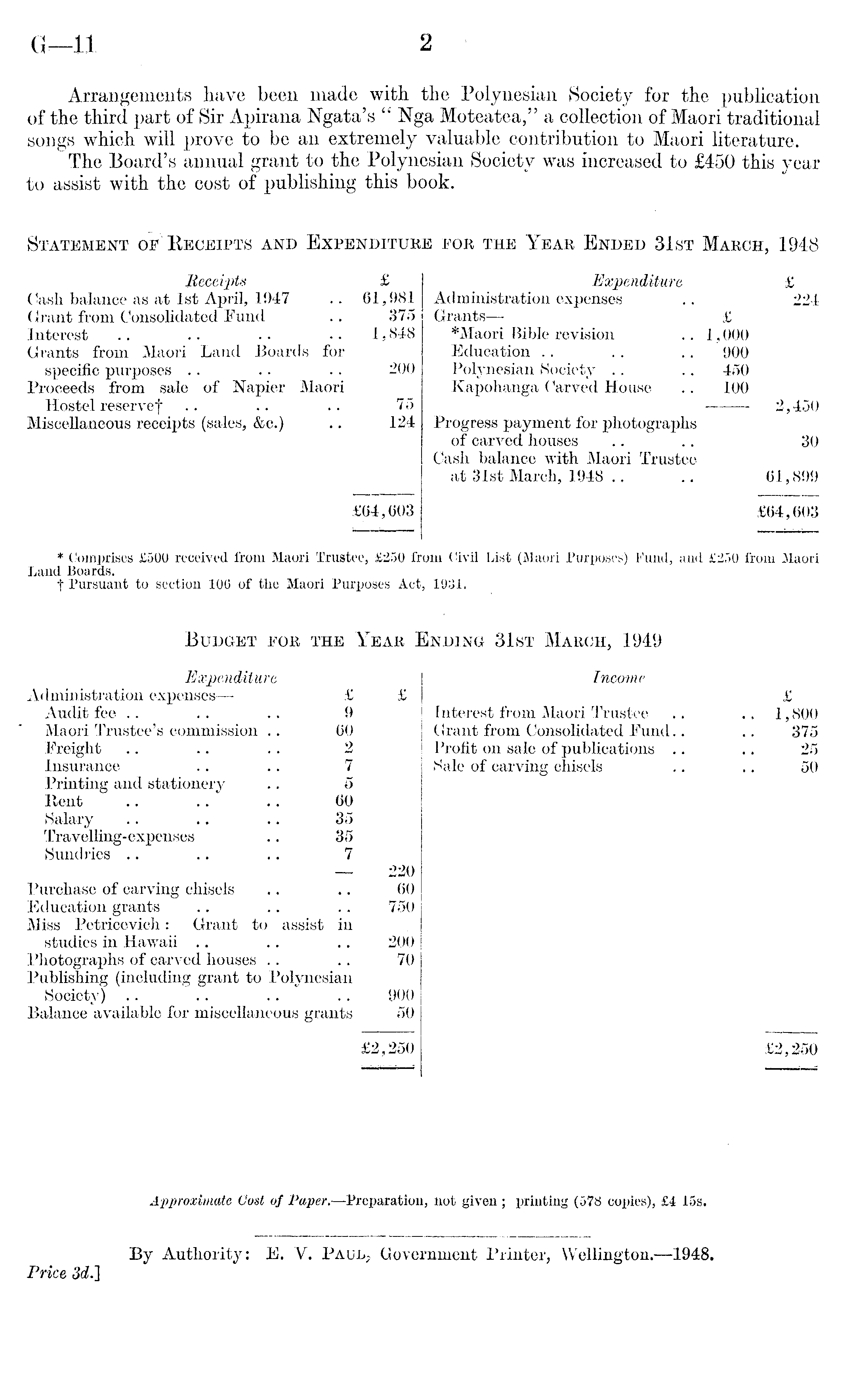 Arrangements have been made with the Polynesian Society for the publication of the third part of Sir Apirana Ngata's " Nga Moteatea," a collection of Maori traditional songs which will prove to be an extremely valuable contribution to Maori literature. The Board's annual grant to the Polynesian Society was increased to £450 this year to assist with the cost of publishing this book. Statement of Keceipts and Expenditure for the Year Ended 31st March, 1948 Receipts £ Expenditure £ Cash balance as at Ist April, 1947 .. 61,981 Administration expenses .. 22-1 ({rant from Consolidated Fund .. 375 Grants — £ Interest .. .. .. .. 1,848 *Maori Bible revision .. 1,000 Grants from Maori Land Boards for Education .. .. .. 900 specific purposes . . . . . . 200 Polynesian Society . . .. 450 Proceeds from sale of Napier Maori Kapohanga Carved House .. 100 Hostel reservef .. .. .. 75 2,450 Miscellaneous receipts (sales, &c.) .. 124 Progress payment for photographs of carved houses .. .. 30 Cash balance with Maori Trustee at 31st March, 1948 .. .. 01,899 £64,003 £64,603 * Comprises £5OO received from Maori Trustee, £250 from Civil List (Maori Purposes) Fund, and £250 from Maori Land Boards. f Pursuant to section 100 of the Maori Purposes Act, 1931. Budget for the Year Ending 31st March, 1949 Expenditure Income Administration expenses— £ £ £ Audit fee .. .. .. 9 Interest from Maori Trustee .. 1,800 Maori Trustee's commission .. 60 Crant from Consolidated Fund.. .. 375 Freight .. .. .. 2 Profit on sale of publications .. .. 25 Insurance .. .. 7 (Sale of carving chisels .. .. 50 Printing and stationery .. 5 Rent .. .. . . 60 Salary .. .. .. 35 Travelling-expenses .. 35 Sundries .. .. .. 7 220 Purchase of carving chisels .. .. 60 Education grants .. .. .. 750 Miss Petricevich: Grant to assist in studies in Hawaii .. .. .. 200 Photographs of carved houses . . .. 70 Publishing (including grant to Polynesian Society) .. .. .. .. 900 Balance available for miscellaneous grants 50 £2,250 £2,250 Approximate Cost of Paper. —Preparation, not given ; printing (578 copies), £4 15s. By Authority: E. V. Paui>; Government Printer, Wellington.—l94B. Price 3d.]