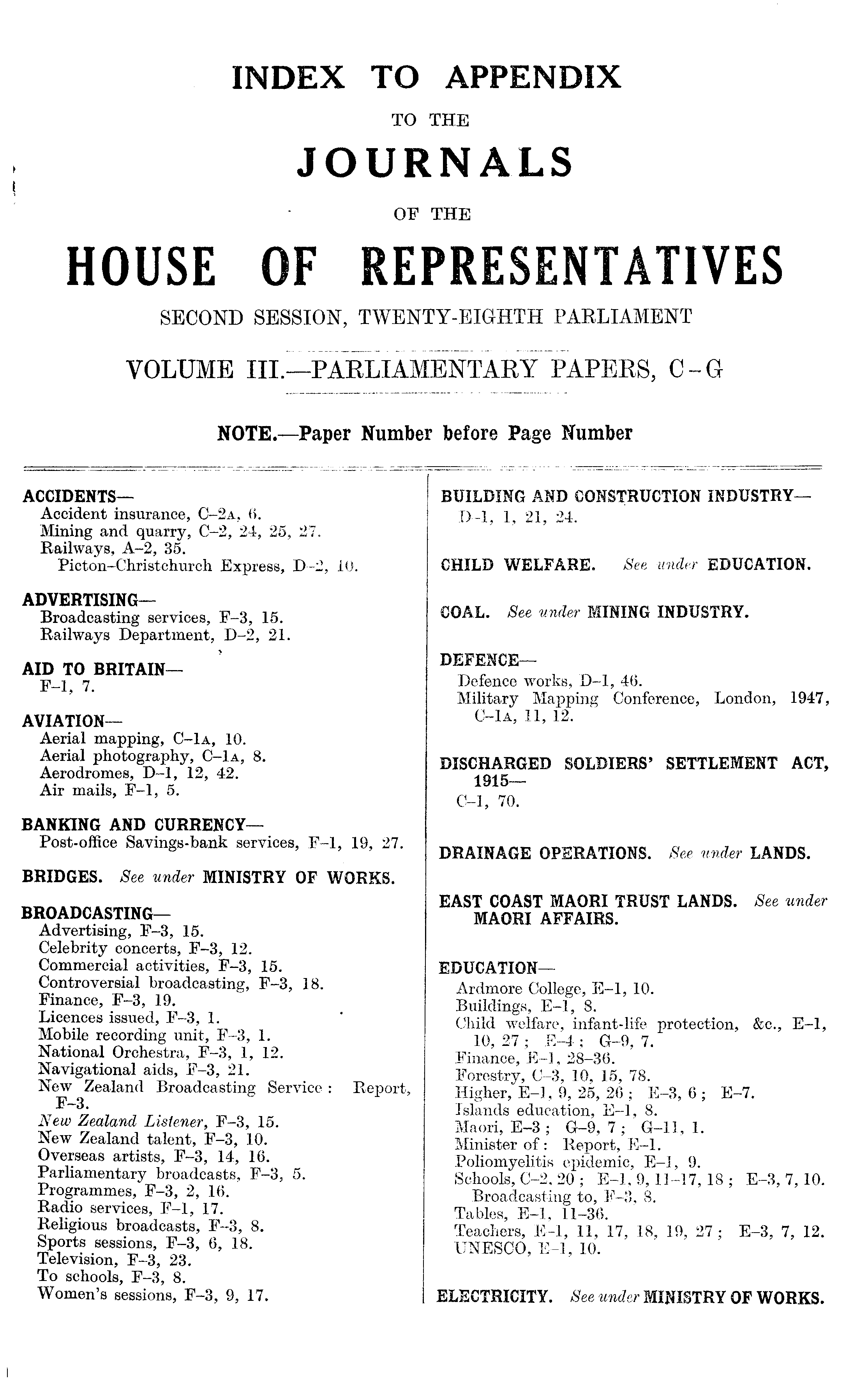 INDEX TO APPENDIX TO THE JOURNALS OF THE HOUSE OF REPRESENTATIVES SECOND SESSION, TWENTY-EIGHTH PARLIAMENT