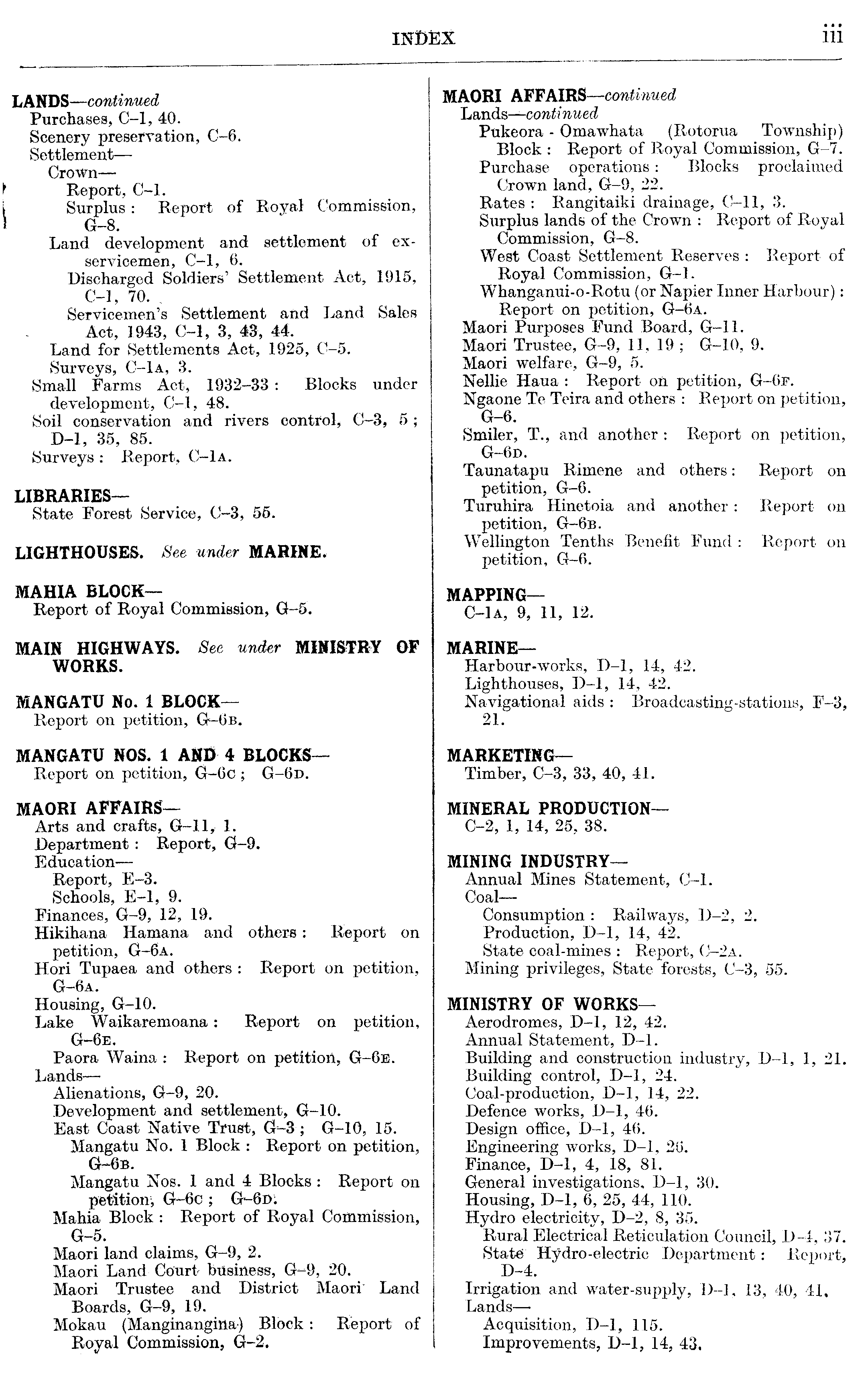 LANDS —continued MAORI AFFAlRS—continued Purchases, C-l, 40. hands—continued Scenery preservation, C-6. Pukeora - Omawhata (Rotorua Township) Settlement Block : Report of Royal Commission, G-7. CfQtm - Purchase operations: Blocks proclaimed f Report, 0-1. Crown land, G-9, 22. [ Surplus : Report of Royal Commission, Rates : Rangitaiki drainage, C-11, 3. | G-8. Surplus lands of the Crown: Report of Royal Land development and settlement of eX- Commission, G-8. servicemen C-l 6. West Coast Settlement Reserves : Report of Discharged Soldiers' Settlement Act, 1915, Royal Commission, G-l. @_l 70. Whanganui-o-Rotu (or Napier Inner Harbour): Servicemen's Settlement and Land Sales Report on petition, G-6a. Act 1943 C-*l 3 43 44. Maori Purposes Fund Board, G-11. Land for Settlements Act,' 1925, C-5. Maori Trustee, G-9, 11,19; G-10, 9. Surveys, C-la, 3. Maori welfare, G-9, 5. Small Farms Act, 1932-33 : Blocks under Nellie Haua: Report on petition, G-6*. development, C-l, 48. Ngaone Te Teira and others : Report on petition, Soil conservation and rivers control, C-3,- 5 ; G-6. D-l 35 85. Smiler, T., and another : Report on petition, Surveys: Report, C-la. G-6d. Taunatapu Rimene and others: Report on LIBRARIES petition, G—6. State Forest Service, C-3, 55. Turuhira Hinetoia and another : Report on petition, U-ob. . ci 7 uAi-tTui-i Wellington Tenths Benefit Fund: Report on LIGHTHOUSES. See under MARINE. petition, G-6. MAHIA BLOCK— MAPPING— Report of Royal Commission, G-5. C-l a, 9, 11, 12. MAIN HIGHWAYS. See under MINISTRY OF MARINEWORKS. Harbour-works, D-l, 14, 42. Lighthouses, D-l, 14, 42. MANGATU No. 1 BLOCK— Navigational aids : Broadcasting-stations, F-3, Report on petition, G-6b. 21. MANGATU NOS. 1 AND 4 BLOCKS— MARKETING— Report on petition, G-6c ; G-6d. Timber, C-3, 33, 40, 41. MAORI AFFAIRS— MINERAL PRODUCTION— Arts and crafts, G-11, 1. C-2, 1, I#, 25, 38. Department : Report, G-9. Education— MINING INDUSTRY— Report, E-3. Annual Mines Statement, C-1 1 . Schools, E-l, 9. Coal— Finances, G-9, 12, 19. Consumption : Railways, D-2,2. Hikihana Hamana and other-s: Report oft Production, D-l, 14, 42. petition, G-6a. State coal-mines : Report, C-2a. Hori Tupaea and others : Report on petition, Mining privileges, State forests, C-3; 55. G-6 a. Housing, G-10. MINISTRY OF WORKS— Lake Waikaremoana: Report on petition, Aerodromes, D-l, 12, 42. G—6b. Annual Statement, D-l. Paora Waina : Report on petition, G-6E. Building and construction industry, D-l, 1, 21. Lands— Building control, D-l, 24. Alienations, G-9, 20. Coal-production, D-l, 14, 22. Development and settlement, G-10. Defence works, D-l, 46. East Coast Native Trust, ; G-10, 15. Design office, D-l, 46. Mangatu No. 1 Block : Report on petition, Engineering works, D-l, 28. GM)®. Finance, D-l, 4, 18, 81. Mangatu Nos. 1 and 4 Blocks : Report on General investigations, D-l, 30. petit-ion 1 , G-6c ; GMjiV. Housing, D-l, 6, 25, 44, 110. Mahia Block : Report of Royal Commission, Hydro electricity, D-2, 8, 35. G-5. Rural Electrical Reticulation Council, D-4, 37. Maori land claims, G-9, 2. State Hydro-electric Department: Report, Maori Land- Court business, G-=9; 20. D-4. Maori Trustee and District Maori' Land Irrigation and water-supply, D-l, 13, 40, 41, Boards, G-9, 19. Lands— Mokau (Manginangitta-) Block: Report of Acquisition, D-l, 115. Royal Commission, G-2. Improvements, D-l, 14, 43,