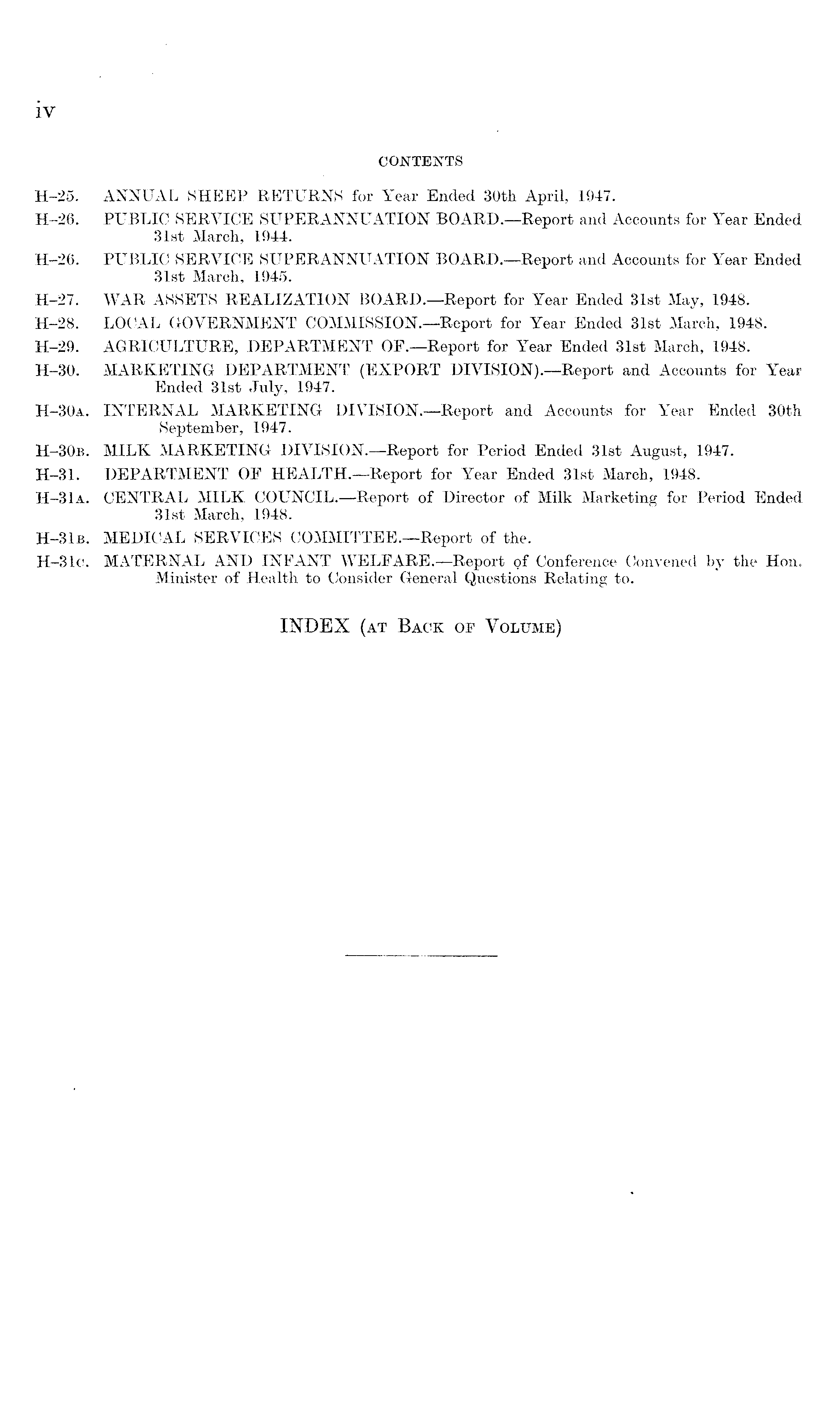 CONTENTS H-25. ANNUAL SHEEP RETURNS for Year Ended 30th April, 1947. H-26. PUBLIC SERVICE SUPERANNUATION BOARD.—Report and Accounts for Year Ended 31st March, 1944. H-26. PUBLIC SERVICE SUPERANNUATION BOARD.—Report and Accounts for Year Ended 31st March, 1945. H-27. WAR ASSETS REALIZATION BOARD.—Report for Year Ended 31st May, 1948. H-28. LOCAL GOVERNMENT COMMISSION.—Report for Year Ended 31st March, 1948. H-29. AGRICULTURE, DEPARTMENT OF.—Report for Year Ended 31st March, 1948. H-30. MARKETING DEPARTMENT (EXPORT DIVISION).—Report and Accounts for Year Ended 31st July, 1947. H-30a. INTERNAL MARKETING DIVISION.—Report and Accounts for Year Ended 30th September, 1947. H-30b. MILK MARKETING DIVISION.—Report for Period Ended 31st August, 1947. H-31. DEPARTMENT OF HEALTH.—Report for Year Ended 31st March, 1948. H-31a. CENTRAL MILK COUNCIL.—Report of Director of Milk Marketing for Period Ended 31st March, 1948. H-31b. MEDICAL SERVICES COMMITTEE.—Report of the. H-31c. MATERNAL AND INFANT WELFARE. —Report of Conference Convened by the Hon. Minister of Health to Consider General Questions Relating to. INDEX (at Back of Volume)