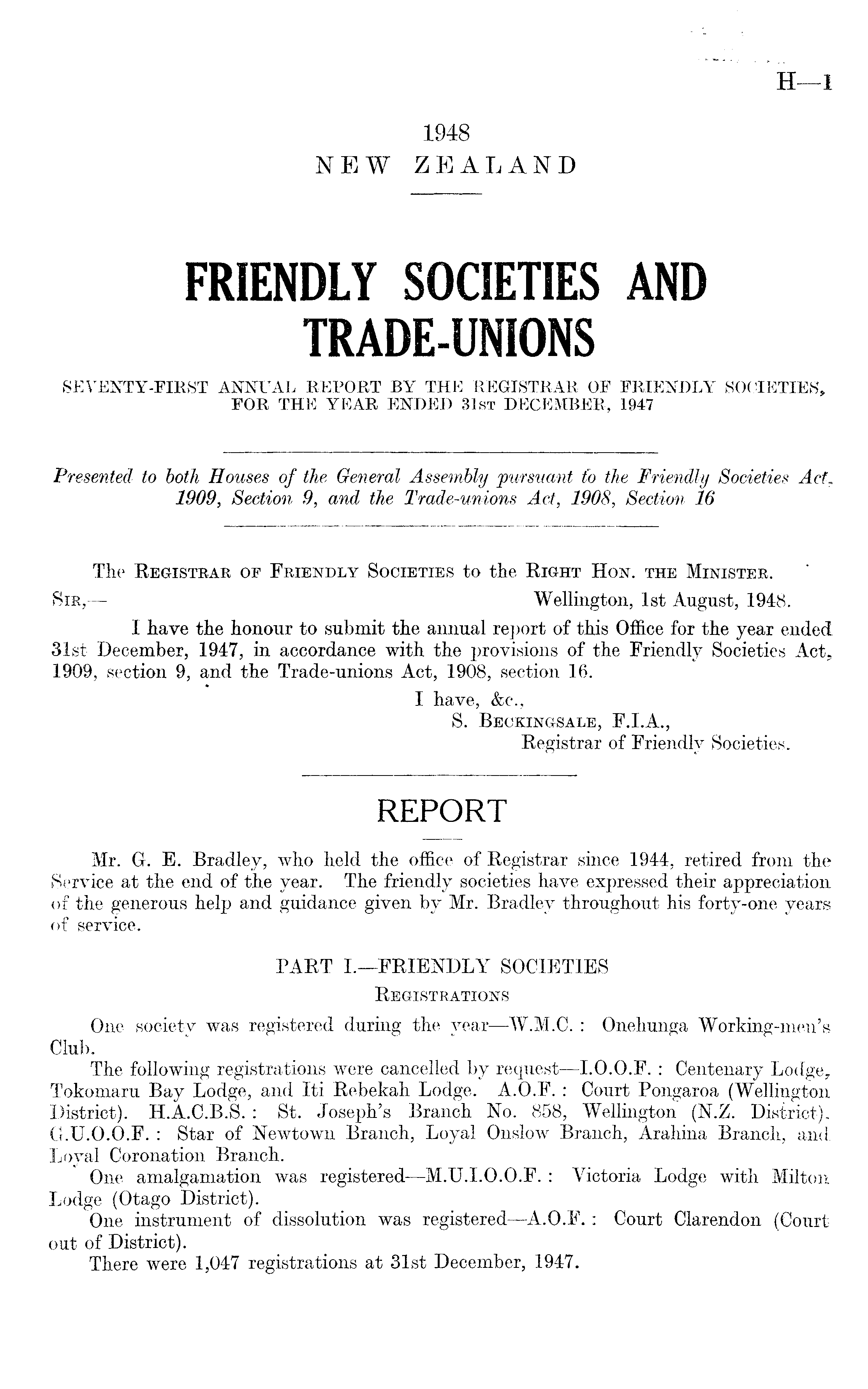 The Registrar of Friendly Societies to the Right Hon. the Minister. Sir, — Wellington, Ist August, 1948. I have the honour to submit the annual report of this Office for the year ended 31st December, 1947, in accordance with the provisions of the Friendly Societies Act, 1909, section 9, and the Trade-unions Act, 1908, section 16. I have, &c, S. Beckingsale, F.1.A., Registrar of Friendly Societies.