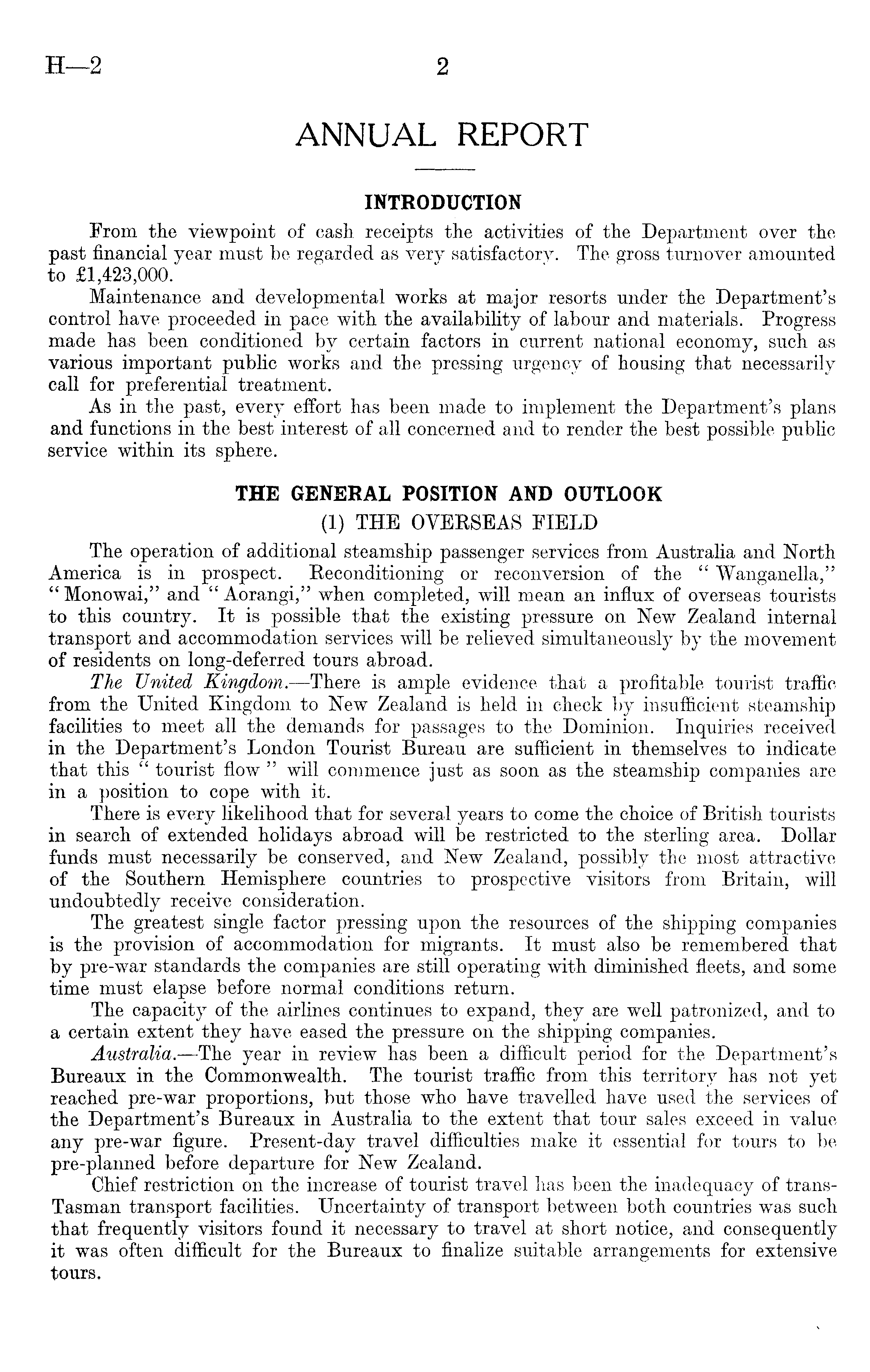 INTRODUCTION From tlie viewpoint of cash, receipts the activities of the Department over the past financial year must be regarded as very satisfactory. The gross turnover amounted to £1,423,000. Maintenance and developmental works at major resorts under the Department's control have proceeded in pace with the availability of labour and materials. Progress made has been conditioned by certain factors in current national economy, such as various important public works and the pressing urgency of housing that necessarily call for preferential treatment. As in the past, every effort has been made to implement the Department's plans and functions in the best interest of all concerned and to render the best possible public service within its sphere. THE GENERAL POSITION AND OUTLOOK (1) THE OVERSEAS FIELD The operation of additional steamship passenger services from Australia and North America is in prospect. Reconditioning or reconversion of the " Wanganella," " Monowai," and " Aorangi," when completed, will mean an influx of overseas tourists to this country. It is possible that the existing pressure on New Zealand internal transport and accommodation services will be relieved simultaneously by the movement of residents on long-deferred tours abroad. The United Kingdom.—There is ample evidence that a profitable tourist traffic from the United Kingdom to New Zealand is held in check by insufficient steamship facilities to meet all the demands for passages to the Dominion. Inquiries received in the Department's London Tourist Bureau are sufficient in themselves to indicate that this " tourist flow " will commence just as soon as the steamship companies are in a position to cope with it. There is every likelihood that for several years to come the choice of British tourists in search of extended holidays abroad will be restricted to the sterling area. Dollar funds must necessarily be conserved, and New Zealand, possibly the most attractive of the Southern Hemisphere countries to prospective visitors from Britain, will undoubtedly receive consideration. The greatest single factor pressing upon the resources of the shipping companies is the provision of accommodation for migrants. It must also be remembered that by pre-war standards the companies are still operating with diminished fleets, and some time must elapse before normal conditions return. The capacity of the airlines continues to expand, they are well patronized, and to a certain extent they have eased the pressure on the shipping companies. Australia. —The year in review has been a difficult period for the Department's Bureaux in the Commonwealth. The tourist traffic from this territory has not yet reached pre-war proportions, but those who have travelled have used the services of the Department's Bureaux in Australia to the extent that tour sales exceed in valueany pre-war figure. Present-day travel difficulties make it essential for tours to be pre-planned before departure for New Zealand. Chief restriction on the increase of tourist travel has been the inadequacy of transTasman transport facilities. Uncertainty of transport between both countries was such that frequently visitors found it necessary to travel at short notice, and consequently it was often difficult for the Bureaux to finalize suitable arrangements for extensive tours.