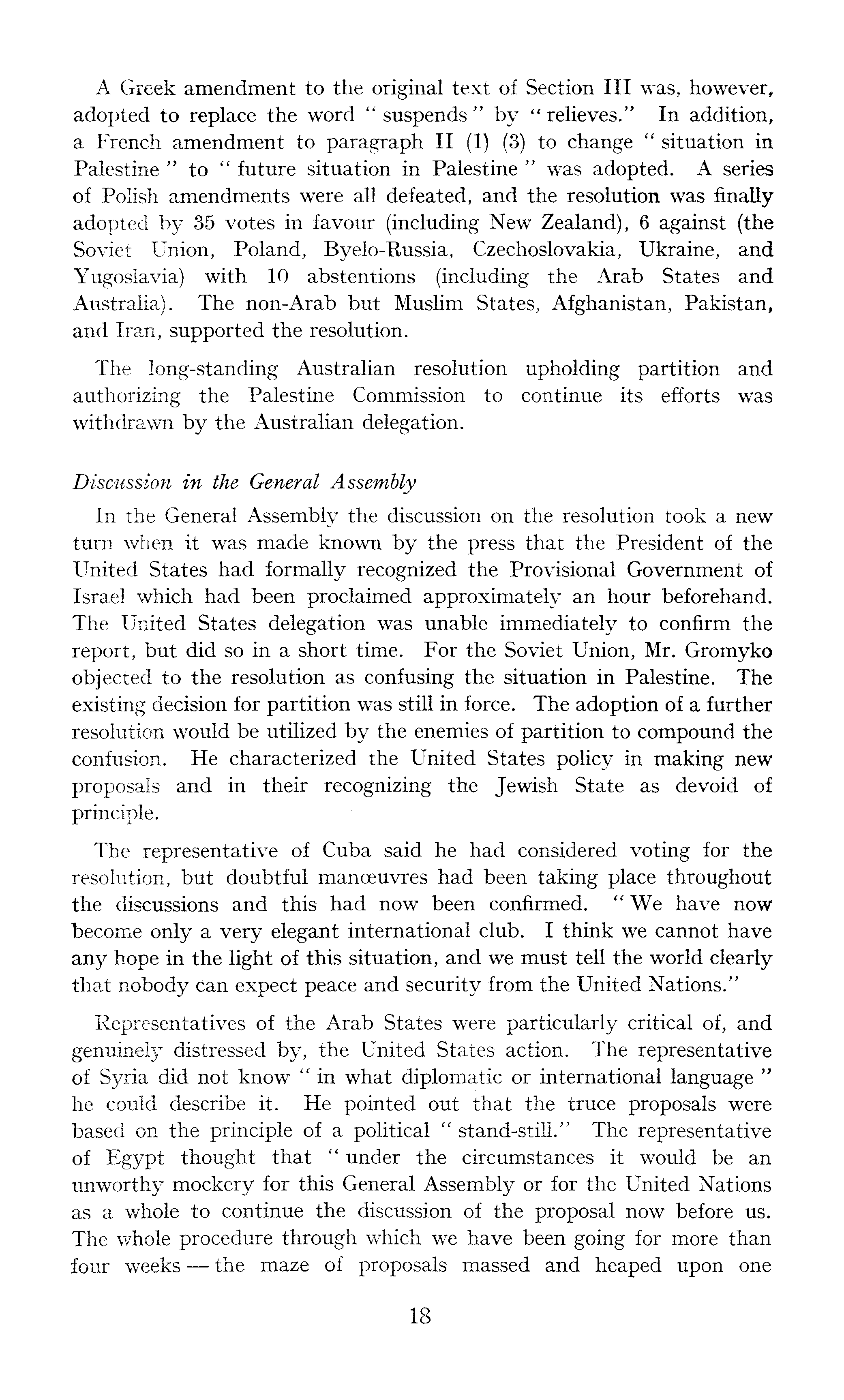 A Greek amendment to the original text of Section 111 was, however, adopted to replace the word "suspends" by "relieves." In addition, a French amendment to paragraph II (1) (3) to change " situation in Palestine " to " future situation in Palestine " was adopted. A series of Polish amendments were all defeated, and the resolution was finally adopted by 35 votes in favour (including New Zealand), 6 against (the Soviet Union, Poland, Byelo-Russia, Czechoslovakia, Ukraine, and Yugoslavia) with 10 abstentions (including the Arab States and Australia). The non-Arab but Muslim States, Afghanistan, Pakistan, and Iran, supported the resolution. The long-standing Australian resolution upholding partition and authorizing the Palestine Commission to continue its efforts was withdrawn by the Australian delegation. Discussion in the General Assembly In the General Assembly the discussion on the resolution took a new turn when it was made known by the press that the President of the United States had formally recognized the Provisional Government of Israel which had been proclaimed approximately an hour beforehand. The United States delegation was unable immediately to confirm the report, but did so in a short time. For the Soviet Union, Mr. Gromyko objected to the resolution as confusing the situation in Palestine. The existing decision for partition was still in force. The adoption of a further resolution would be utilized by the enemies of partition to compound the confusion. He characterized the United States policy in making new proposals and in their recognizing the Jewish State as devoid of principle. The representative of Cuba said he had considered voting for the resolution, but doubtful manoeuvres had been taking place throughout the discussions and this had now been confirmed. "We have now become only a very elegant international club. I think we cannot have any hope in the light of this situation, and we must tell the world clearly that nobody can expect peace and security from the United Nations." Representatives of the Arab States were particularly critical of, and genuinely distressed by, the United States action. The representative of Syria did not know " in what diplomatic or international language " he could describe it. He pointed out that the truce proposals were based on the principle of a political " stand-still." The representative of Egypt thought that " under the circumstances it would be an unworthy mockery for this General Assembly or for the United Nations as a whole to continue the discussion of the proposal now before us. The whole procedure through which we have been going for more than four weeks the maze of proposals massed and heaped upon one