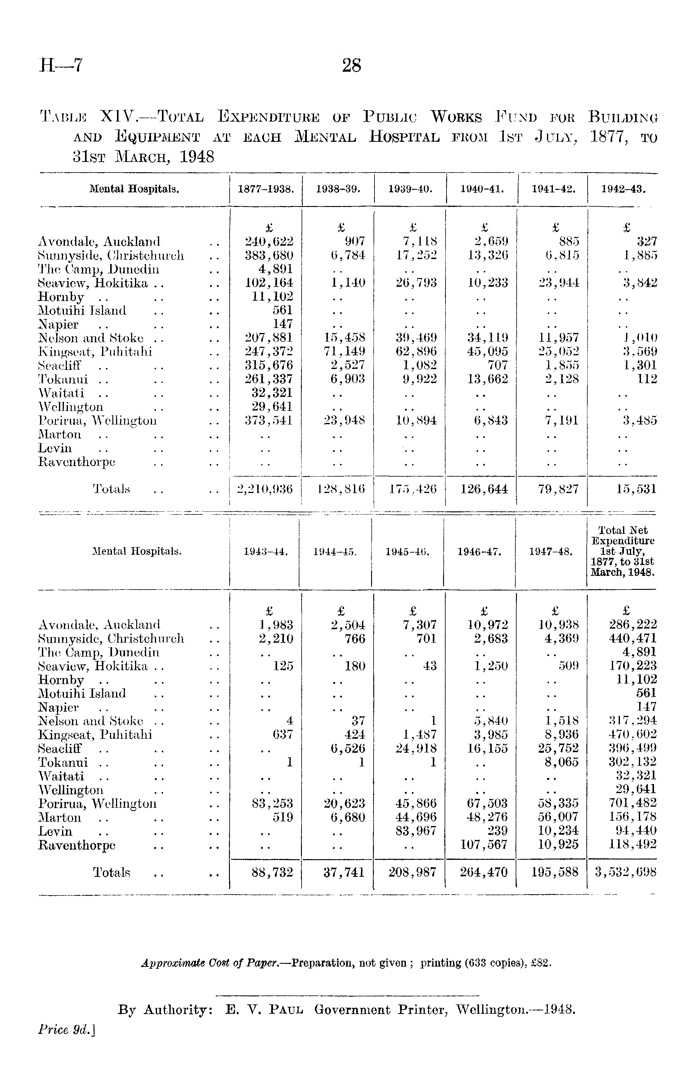 Table XIV. —Total Expenditure of Public Works Fund for Building and Equipment at each Mental Hospital from 1st July, 1877, to 31st March, 1948
