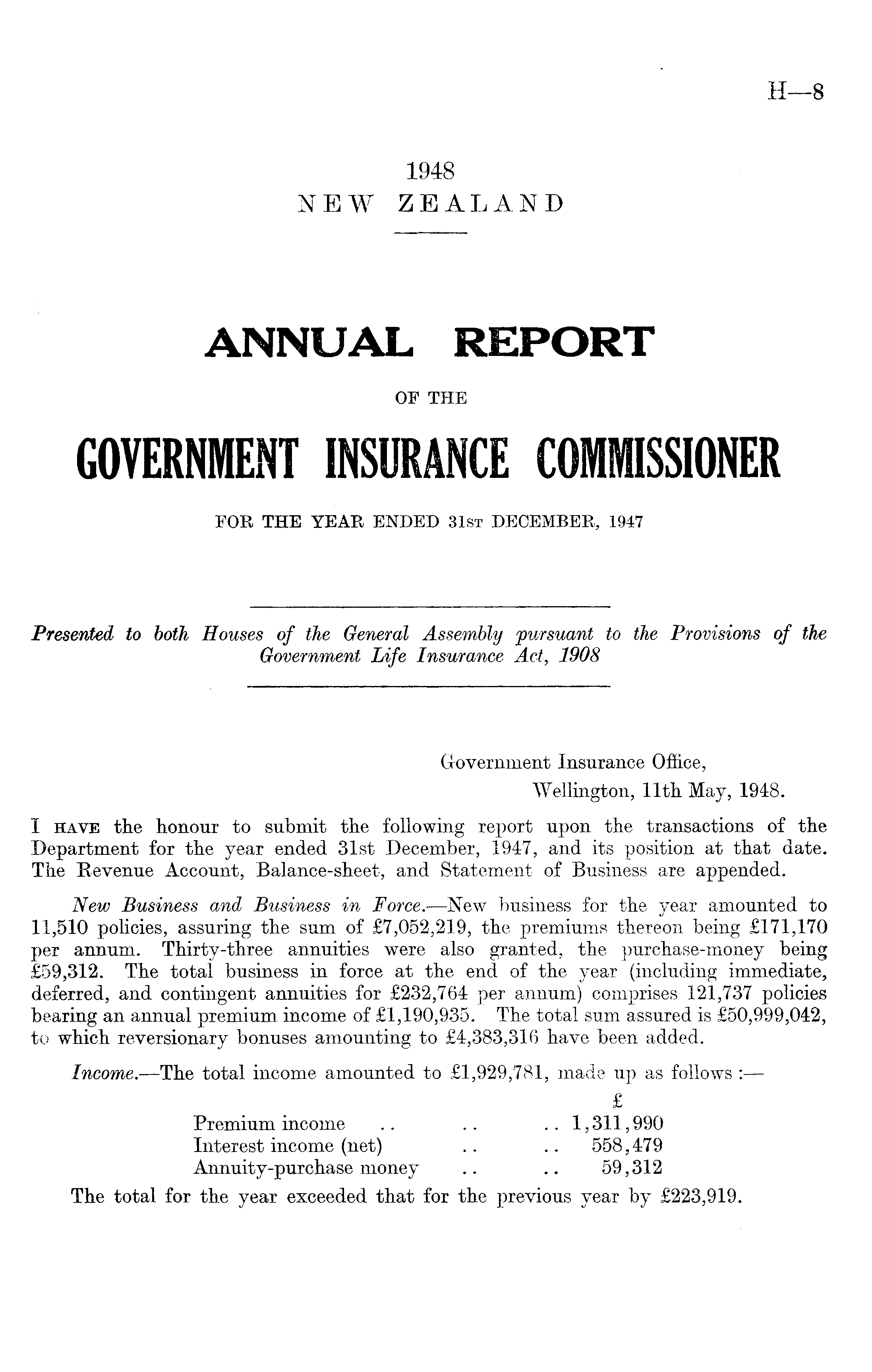 Government Insurance Office, Wellington, 11th May, 1948. I have the honour to submit the following report upon the transactions of the Department for the year ended 31st December, 1947, and its position at that date. The Revenue Account, Balance-sheet, and Statement of Business are appended. New Business and Business in Force.—New business for the year amounted to 11,510 policies, assuring the sum of £7,052,219, the premiums thereon being £171,170 per annum. Thirty-three annuities were also granted, the purchase-money being £59,312. The total business in force at the end of the year (including immediate, deferred, and contingent annuities for £232,764 per annum) comprises 121,737 policies bearing an annual premium income of £1,190,935. The total sum assured is £50,999,042, to which reversionary bonuses amounting to £4,383,316 have been added. Income. —The total income amounted to £1,929,781, made up as follows: £ Premium income .. .. .. 1,311,990 Interest income (net) .. .. 558,479 Annuity-purchase money .. .. 59,312 The total for the year exceeded that for the previous year by £223,919.