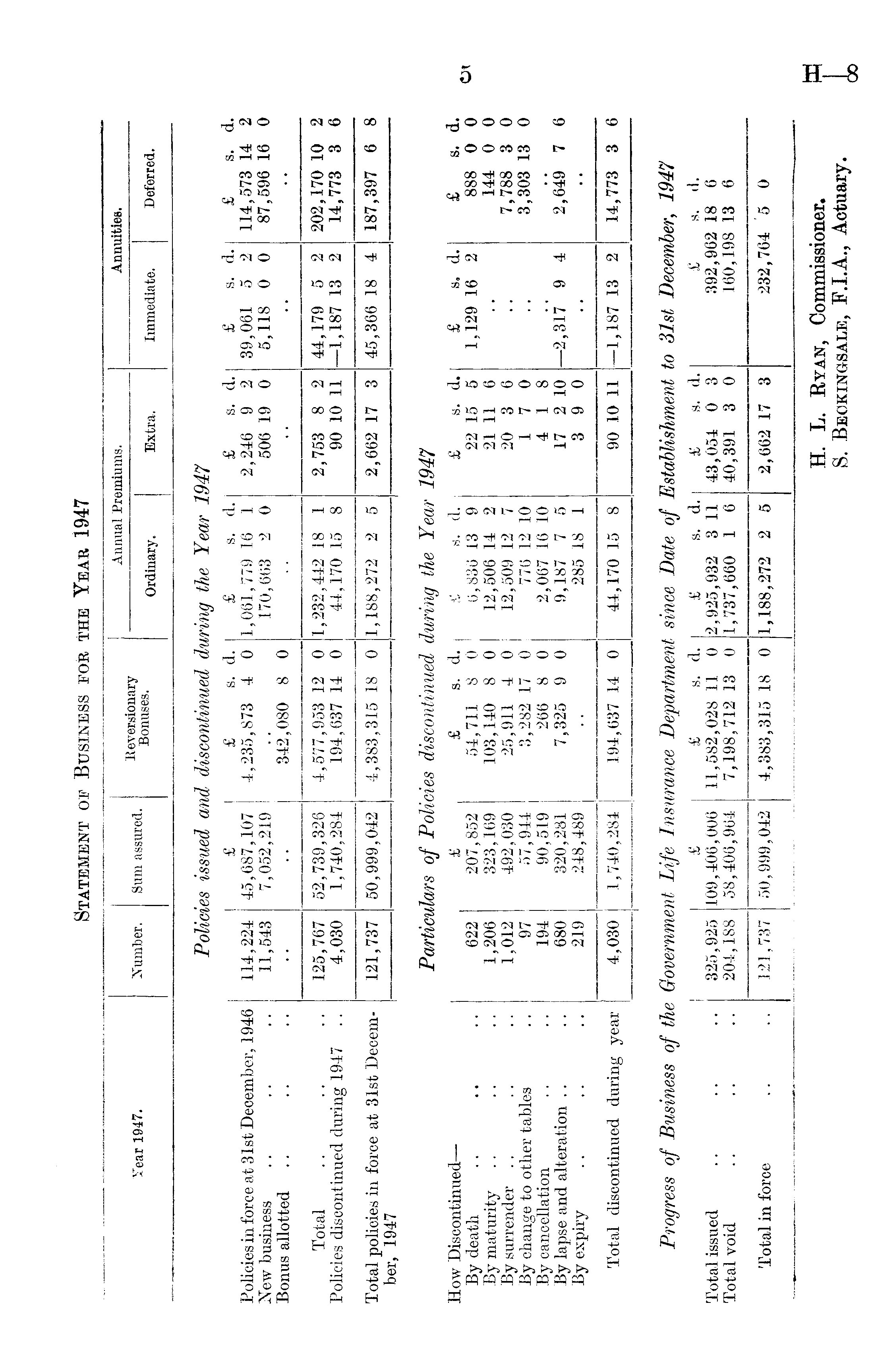 Year 1947. Number. Sum assured. Reversionary Bonuses. Annual Premiums. Annuities. Ordinary. Extra. Immediate. Deferred. Policies in force at 31st December, 1946 New business Bonus allotted Total Policies discontinued during 1947 .. Total policies in force at 31st December, 1947 How Discontinued — By death By maturity By surrender By change to other tables By cancellation By lapse and alteration By expiry Total discontinued during year Progress of Business of the Total issued Total void Total in force Polici 114,224 11,543 'es issued ar £ 45,687,107 7,052,219 id discontinued du £ s. d. 4,235,873 4 0 342,080 8 0 ring the Year 1 £ s. d. 1,061,779 16 1 170,663 2 0 947 £ s. d. 2,246 9 2 506 19 0 £ s. d. 39,061 5 2 5,118 0 0 £ s. d. 114,573 14 2 87,596 16 0 125,767 4,030 52,739,326 1,740,284 4,577,953 12 0 194,637 14 0 1,232,442 18 1 44,170 15 8 2,753 8 2 90 10 11 44,179 5 2 —1,187 13 2 202,170 10 2 14,773 3 6 121,737 50,999,042 4,383,315 18 0 1,188,272 2 5 2,662 17 3 45,366 18 4 187,397 6 8 Particu 622 1,206 1,012 97 194 680 219 lars of Poli £ 207,852 323,169 492,030 57,944 90,519 320,281 248,489 cies discontinued c £ s. d. 54,711 8 0 103,140 8 0 25,911 4 0 3,282 17 0 266 8 0 7,325 9 0 luring the Year £ s. d. 6,836 13 9 12,506 14 2 12,509 12 7 776 12 10 2,067 16 10 9,187 7 5 285 18 1 1947 £ s. d. 22 15 5 21 11 6 20 3 6 17 0 4 1 8 17 2 10 3 9 0 £ s. d. 1,129 16 2 —2,317* 9 4 £ s. d. 888 0 0 144 0 0 7,788 3 0 3,303 13 0 2,649 7 6 4,030 1,740,284 194,637 14 0 44,170 15 8 90 10 11 —1,187 13 2 14,773 3 6 Govemme 325,925 204,188 nt Life Insi £ 109,406,006 58,406,964trance Department £ s. d. 11,582,028 11 0 7,198,712 13 0 ; since Date of j £ s. d. 2,925,932 3 11 1,737,660 1 6 Establishment £ s. d. 43,054 0 3 40,391 3 0 to 31st December, 1947 £ s. d. 392,962 18 6 160,198 13 6 121,737 50,999,042 4,383,315 18 0 1,188,272 2 5 2,662 17 3 232,764 '5 0