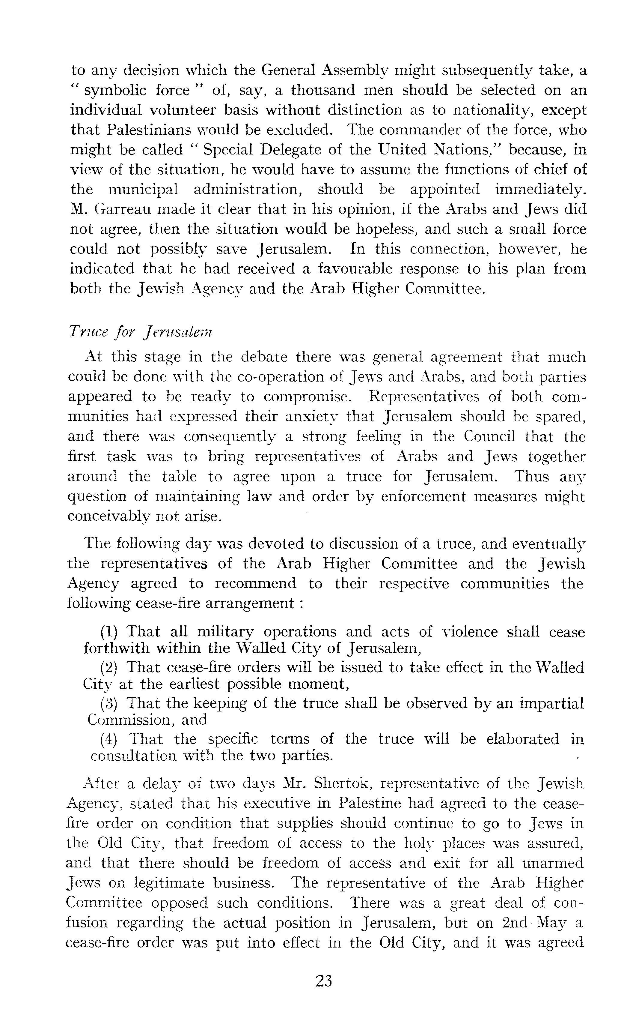 to any decision which the General Assembly might subsequently take, a " symbolic force " of, say, a thousand men should be selected on an individual volunteer basis without distinction as to nationality, except that Palestinians would be excluded. The commander of the force, who might be called " Special Delegate of the United Nations/' because, in view of the situation, he would have to assume the functions of chief of the municipal administration, should be appointed immediately. M. Garreau made it clear that in his opinion, if the Arabs and Jews did not agree, then the situation would be hopeless, and such a small force could not possibly save Jerusalem. In this connection, however, he indicated that he had received a favourable response to his plan from both the Jewish Agency and the Arab Higher Committee. Truce for Jerusalem At this stage in the debate there was general agreement that much could be done with the co-operation of Jews and Arabs, and both parties appeared to be ready to compromise. Representatives of both communities had expressed their anxiety that Jerusalem should be spared, and there was consequently a strong feeling in the Council that the first task was to bring representatives of Arabs and Jews together around the table to agree upon a truce for Jerusalem. Thus any question of maintaining law and order by enforcement measures might conceivably not arise. The following day was devoted to discussion of a truce, and eventually the representatives of the Arab Higher Committee and the Jewish Agency agreed to recommend to their respective communities the following cease-fire arrangement: (1) That all military operations and acts of violence shall cease forthwith within the Walled City of Jerusalem, (2) That cease-fire orders will be issued to take effect in the Walled City at the earliest possible moment, (3) That the keeping of the truce shall be observed by an impartial Commission, and (4) That the specific terms of the truce will be elaborated in consultation with the two parties. After a delay of two days Mr. Shertok, representative of the Jewish Agency, stated that his executive in Palestine had agreed to the ceasefire order on condition that supplies should continue to go to Jews in the Old City, that freedom of access to the holy places was assured, and that there should be freedom of access and exit for all unarmed Jews on legitimate business. The representative of the Arab Higher Committee opposed such conditions. There was a great deal of confusion regarding the actual position in Jerusalem, but on 2nd May a cease-fire order was put into effect in the Old City, and it was agreed