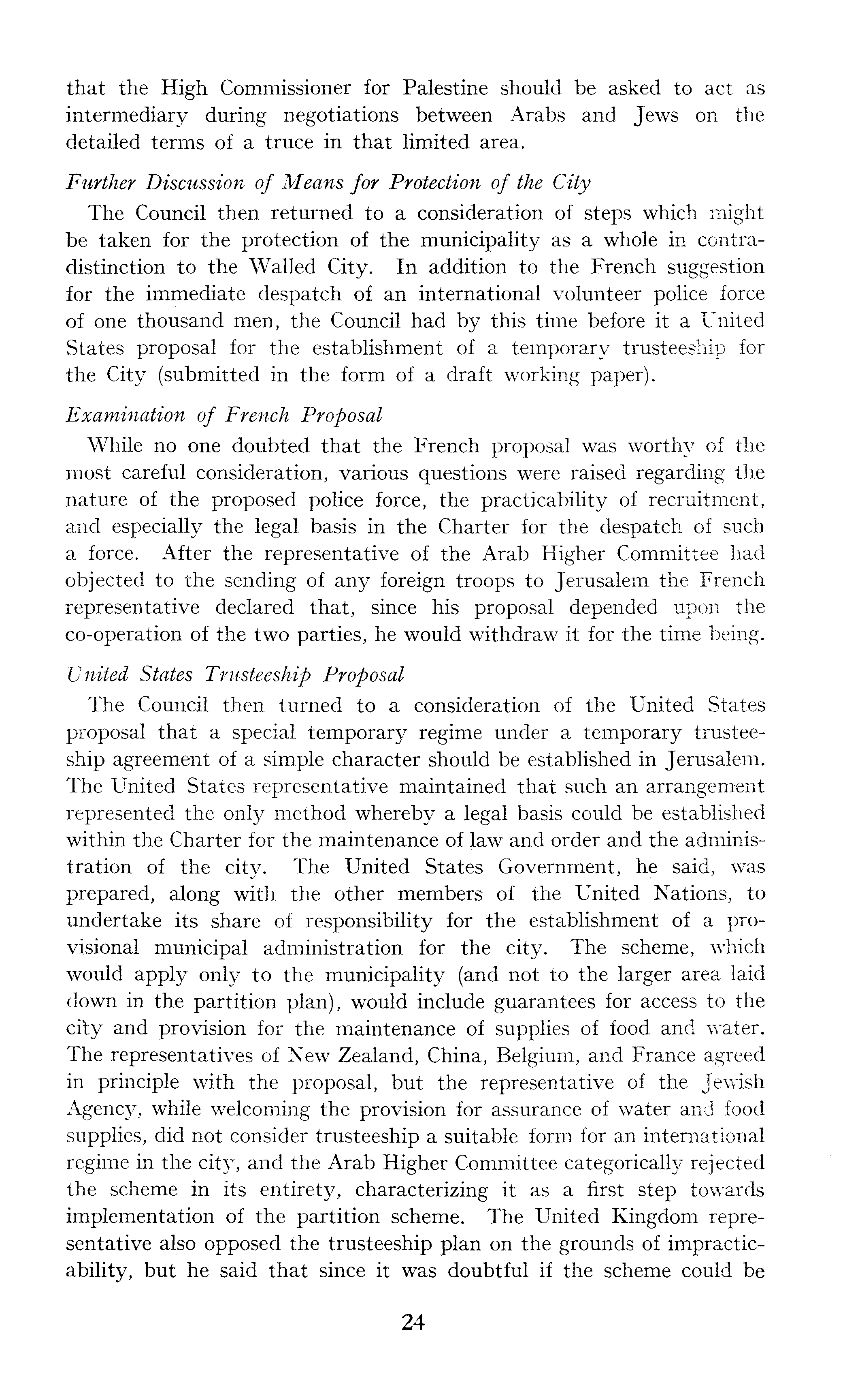 that the High Commissioner for Palestine should be asked to act as intermediary during negotiations between Arabs and Jews on the detailed terms of a truce in that limited area. Further Discussion of Means for Protection of the City The Council then returned to a consideration of steps which might be taken for the protection of the municipality as a whole in contradistinction to the Walled City. In addition to the French suggestion for the immediate despatch of an international volunteer police force of one thousand men, the Council had by this time before it a United States proposal for the establishment of a temporary trusteeship for the City (submitted in the form of a draft working paper). Examination of French Proposal While no one doubted that the French proposal was worthy of the most careful consideration, various questions were raised regarding the nature of the proposed police force, the practicability of recruitment, and especially the legal basis in the Charter for the despatch of such a force. After the representative of the Arab Higher Committee had objected to the sending of any foreign troops to Jerusalem the French representative declared that, since his proposal depended upon the co-operation of the two parties, he would withdraw it for the time being. United States Trusteeship Proposal The Council then turned to a consideration of the United States proposal that a special temporary regime under a temporary trusteeship agreement of a simple character should be established in Jerusalem. The United States representative maintained that such an arrangement represented the only method whereby a legal basis could be established within the Charter for the maintenance of law and order and the administration of the city. The United States Government, he said, was prepared, along with the other members of the United Nations, to undertake its share of responsibility for the establishment of a provisional municipal administration for the City. The scheme, which would apply only to the municipality (and not to the larger area laid down in the partition plan), would include guarantees for access to the city and provision for the maintenance of supplies of food and water. The representatives of New Zealand, China, Belgium, and France agreed in principle with the proposal, but the representative of the Jewish Agency, while welcoming the provision for assurance of water and food supplies, did not consider trusteeship a suitable form for an international regime in the city, and the Arab Higher Committee categorically rejected the scheme in its entirety, characterizing it as a first step towards implementation of the partition scheme. The United Kingdom representative also opposed the trusteeship plan on the grounds of impracticability, but he said that since it was doubtful if the scheme could be