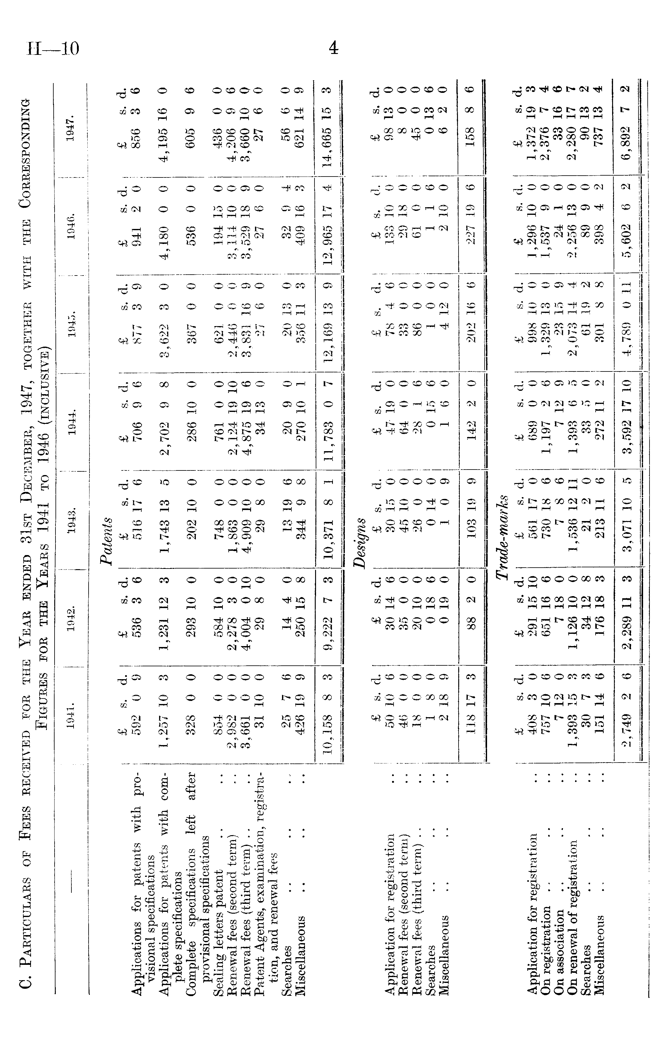 — 1941. . 1942. 1943. 1 1944. 1945. j 1946. 1947. Patents £ s. d. £ s. d. £ s. d. £ s. d. £ s. d. £ s. d. | £ s. d. Applications for patents with pro592 0 9 536 3 6 516 17 6 706 9 6 877 3 9 941 2 0 856 3 6 visional specifications Applications for patents with com1,257 10 3 1,231 12 3 1,743 13 5 2,702 9 8 3,622 3 0 4,180 0 0 4,195 16 0 plete specifications 605 9 6 Complete specifications left after 328 0 0 293 10 0 202 10 0 286 .10 0 367 0 0 536 0 0 provisional specifications 436 0 0 Sealing letters patent 854 0 0 584 10 0 748 0 0 761 0 0 621 0 0 194 15 0 Renewal fees (second term) 2,982 0 0 2,278 3 0 1,863 0 0 2,124 19 10 2,446 0 0 3,114 10 0 4,206 9 6 Renewal fees (third term) 3,661 0 0 4,004 0 10 4,909 10 0 4,875 19 6 3,831 16 9 3,529 18 9 3,660 10 Q Patent Agents, examination, registra31 10 0 29 8 0 29 8 0 34 13 0 27 6 0 27 6 0 27 6 0 tion, and renewal fees Searches 25 7 6 14 4 0 13 19 6 20 9 0 20 13 0 32 9 4 56 6 0 Miscellaneous 426 19 9 250 15 8 344 9 8 270 10 1 356 11 3 409 16 3 621 14 9 10,158 8 3 9,222 7 3 10,371 8 1 11,783 0 7 12,169 13 9 12,965 17 4 14,665 15 3 Designs i £ s. d. £ s. d. £ s. d. £ s. d. £ s. d. £ s. d. £ s. d. Application for registration 50 10 6 30 14 6 30 15 0 47 19 0 78 4 6 133 10 0 98 13 0 Renewal fees (second term) 46 0 0 35 0 0 45 10 0 64 0 0 33 0 0 29 18 0 8 0 0 Renewal fees (third term) 18 0 0 20 10 0 26 0 0 28 1 6 86 0 0 61 0 0 45 0 0 Searches 1 8 0 0 18 6 0 14 0 0 15 6 1 0 0 1 1 6 0 13 6 Miscellaneous 2 18 9 0 19 0 10 9 16 0 4 12 0 2 10 0 6 2 0 118 17 3 88 2 0 103 19 9 142 2 0 202 16 6 227 19 6 158 8 6 Trade-marks £ s. d. £ 8. d. £ s. d. £ s. d. £ s. d. £ s. d. £ s. d. Application for registration 408 3 0 291 15 10 561 17 0 689 0 0 998 10 0 1,296 10 0 1,372 19 3 On registration 757 10 6 651 16 6 730 18 6 1,197 2 6 1,329 13 0 1,537 9 0 2,376 7 4 On association 7 12 0 7 18 0 7 8 6 7 12 9 23 15 9 24 1 0 33 16 6 On renewal of registration 1,393 15 3 1,126 10 0 1,536 12 11 1,393 6 5 2,073 14 4 2,256 13 0 2,280 17 7 Searches 30 7 3 34 12 8 21 2 0 33 5 0 61 19 2 89 9 0 90 13 2 Miscellaneous 151 14 6 176 18 3 213 11 6 272 11 2 301 8 8 398 4 2 737 13 4 2,749 2 6 2,289 11 3 3,071 10 5 3,592 17 10 4,789 0 11 5,602 6 2 6,892 7 2