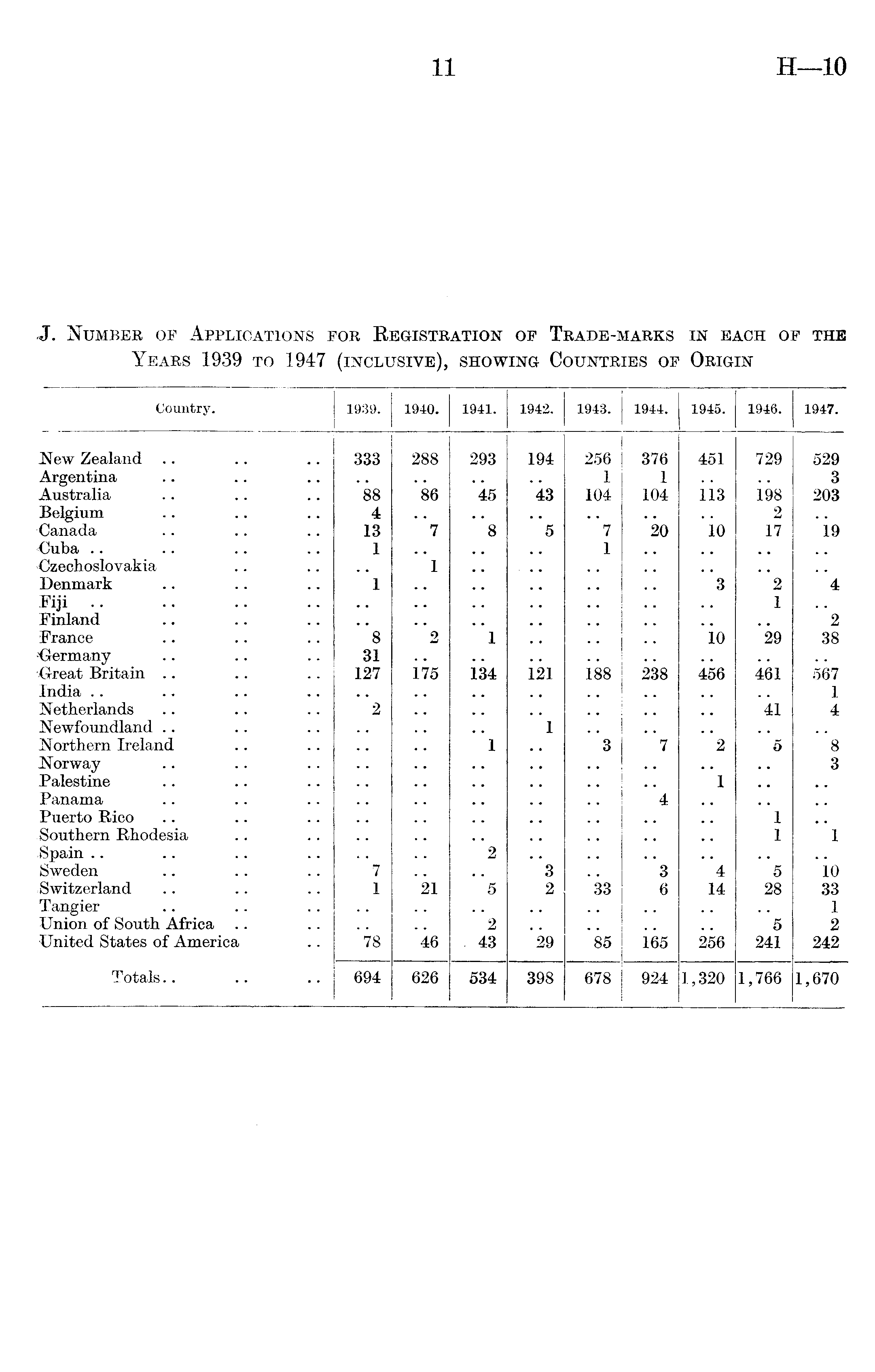 J. Number of Applications for Registration of Trade-marks in each of the Years 1939 to 1947 (inclusive), showing Countries of Origin
