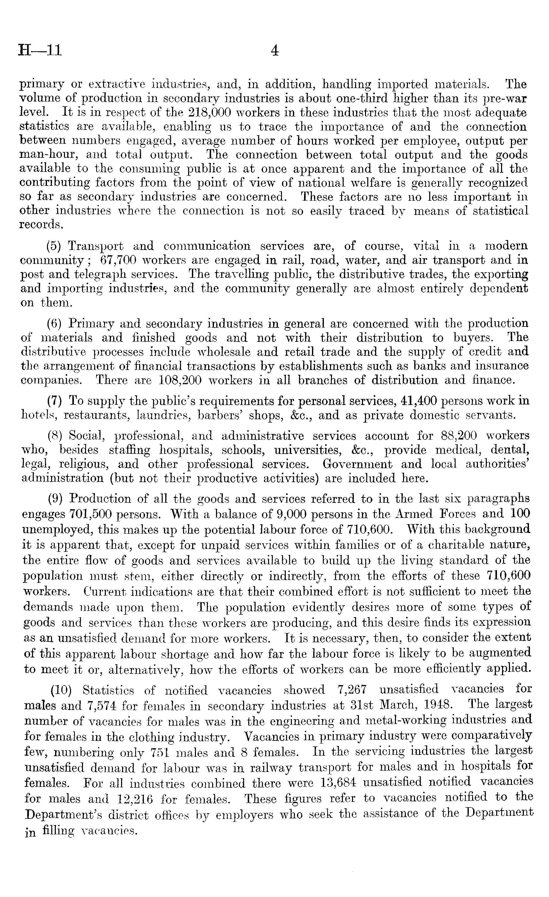 primary or extractive industries, and, in addition, handling imported materials. The volume of production in secondary industries is about one-third higher than its pre-war level. It is in respect of the 218,000 workers in these industries that the most adequate statistics are available, enabling us to trace the importance of and the connection between numbers engaged, average number of hours worked per employee, output per man-hour, and total output. The connection between total output and the goods available to the consuming public is at once apparent and the importance of all the contributing factors from the point of view of national welfare is generally recognized so far as secondary industries are concerned. These factors are no less important in other industries where the connection is not so easily traced by means of statistical records. (5) Transport and communication services are, of course, vital in a modern community; 67,700 workers are engaged in rail, road, water, and air transport and in post and telegraph services. The travelling public, the distributive trades, the exporting and importing industries, and the community generally are almost entirely dependent on them. (6) Primary and secondary industries in general are concerned with the production of materials and finished goods and not with their distribution to buyers. The distributive processes include wholesale and retail trade and the supply of credit and the arrangement of financial transactions by establishments such as banks and insurance companies. There are 108,200 workers in all branches of distribution and finance. (7) To supply the public's requirements for personal services, 41,400 persons work in hotels, restaurants, laundries, barbers' shops, &c, and as private domestic servants. (8) Social, professional, and administrative services account for 88,200 workers who, besides staffing hospitals, schools, universities, &c, provide medical, dental, legal, religious, and other professional services. Government and local authorities' administration (but not their productive activities) are included here. (9) Production of all the goods and services referred to in the last six paragraphs engages 701,500 persons. With a balance of 9,000 persons in the Armed Forces and 100 unemployed, this makes up the potential labour force of 710,600. With this background it is apparent that, except for unpaid services within families or of a charitable nature, the entire flow of goods and services available to build up the living standard of the population must stem, either directly or indirectly, from the efforts of these 710,600 workers. Current indications are that their combined effort is not sufficient to meet the demands made upon them. The population evidently desires more of some types of goods and services than these workers are producing, and this desire finds its expression as an unsatisfied demand for more workers. It is necessary, then, to consider the extent of this apparent labour shortage and how far the labour force is likely to be augmented to meet it or, alternatively, how the efforts of workers can be more efficiently applied. (10) Statistics of notified vacancies showed 7,267 unsatisfied vacancies for males and 7,574 for females in secondary industries at 31st March, 1948. The largest number of vacancies for males was in the engineering and metal-working industries and for females in the clothing industry. Vacancies in primary industry were comparatively few, numbering only 751 males and 8 females. In the servicing industries the largest unsatisfied demand for labour was in railway transport for males and in hospitals for females. For all industries combined there were 13,684 unsatisfied notified vacancies for males and 12,216 for females. These figures refer to vacancies notified to the Department's district offices by employers who seek the assistance of the Department in filling vacancies.