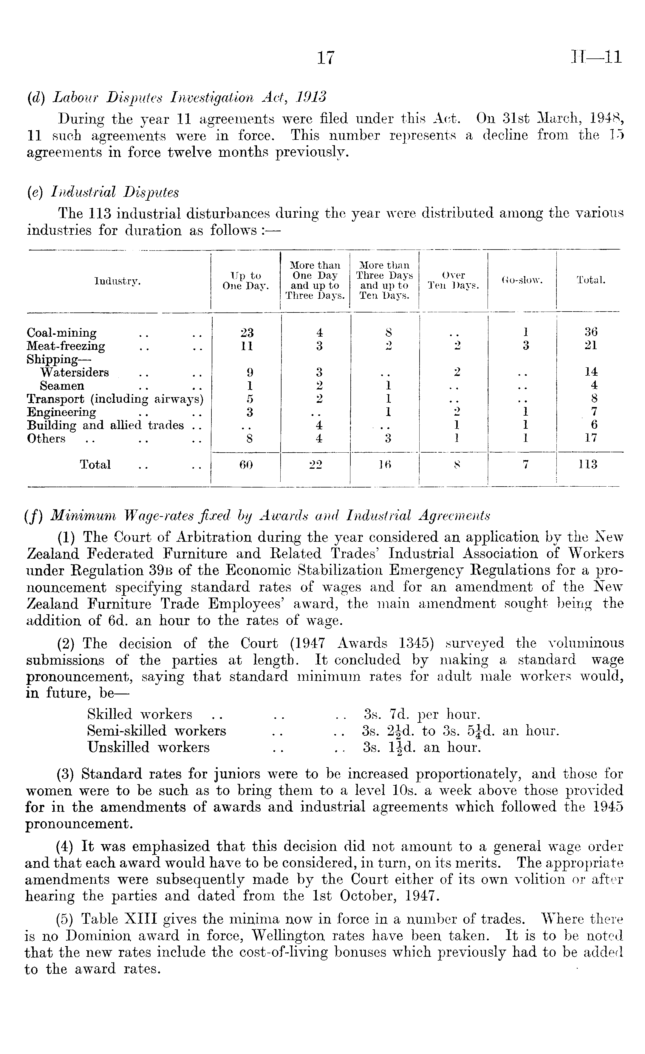 (d) Labour Disputes Investigation Act, 1913 During the year 11 agreements were filed under this Act. On 31st March, 1948, 11 such agreements were in force. This number represents a decline from the 15 agreements in force twelve months previously. (e) Industrial Disputes The 113 industrial disturbances during the year were distributed among the various industries for duration as follows :