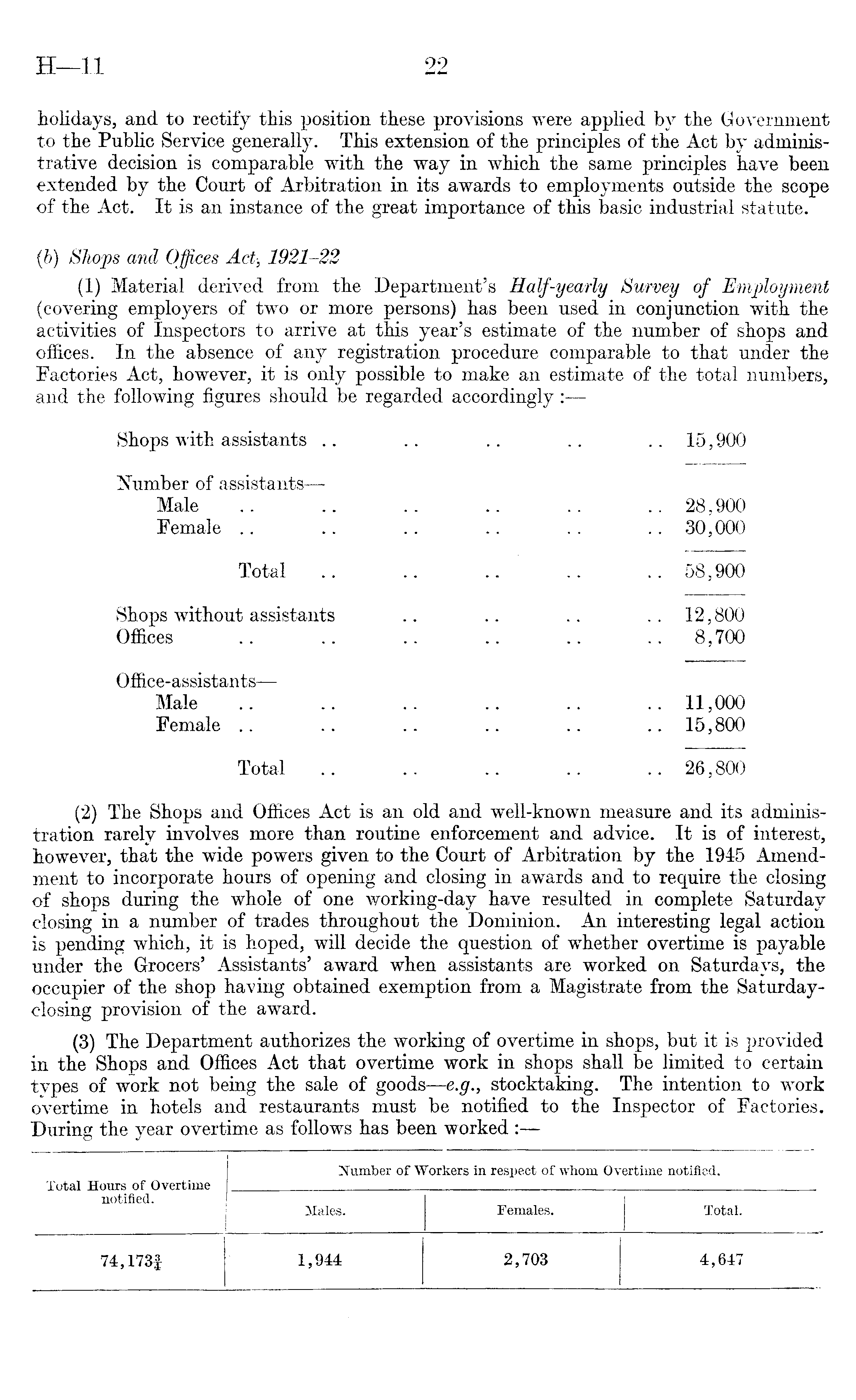holidays, and to rectify this position these provisions were applied by the Government to the Public Service generally. This extension of the principles of the Act by administrative decision is comparable with the way in which the same principles have been extended by the Court of Arbitration in its awards to employments outside the scope of the Act. It is an instance of the great importance of this basic industrial statute. (b) Shops and Offices Act; 1921-22 (1) Material derived from the Department's Half-yearly Survey of Employment (covering employers of two or more persons) has been used in conjunction with the activities of Inspectors to arrive at this year's estimate of the number of shops and offices. In the absence of any registration procedure comparable to that under the Factories Act, however, it is only possible to make an estimate of the total numbers, and the following figures should be regarded accordingly :- — Shops with assistants .. .. .. .. .. 15,900 Number of assistants— Male .. .. .. .. .. .. 28,900 Female .. .. .. .. .. .. 30,000 Total .. .. .. .. .. 58,900 Shops without assistants .. .. .. .. 12,800 Offices .. .. .. .. .. .. 8,700 ■ Office-assistants — Male .. .. .. .. .. .. 11,000 Female .. .. .. .. .. .. 15,800 Total .. .. .. .. .. 26,800 (2) The Shops and Offices Act is an old and well-known measure and its administration rarely involves more than routine enforcement and advice. It is of interest, however, that the wide powers given to the Court of Arbitration by the 1945 Amendment to incorporate hours of opening and closing in awards and to require the closing of shops during the whole of one working-day have resulted in complete Saturday closing in a number of trades throughout the Dominion. An interesting legal action is pending which, it is hoped, will decide the question of whether overtime is payable under the Grocers' Assistants' award when assistants are worked on Saturdays, the occupier of the shop having obtained exemption from a Magistrate from the Saturdayclosing provision of the award. (3) The Department authorizes the working of overtime in shops, but it is provided in the Shops and Offices Act that overtime work in shops shall be limited to certain types of work not being the sale of goods— e.g., stocktaking. The intention to work overtime in hotels and restaurants must be notified to the Inspector of Factories. During the year overtime as follows has been worked :