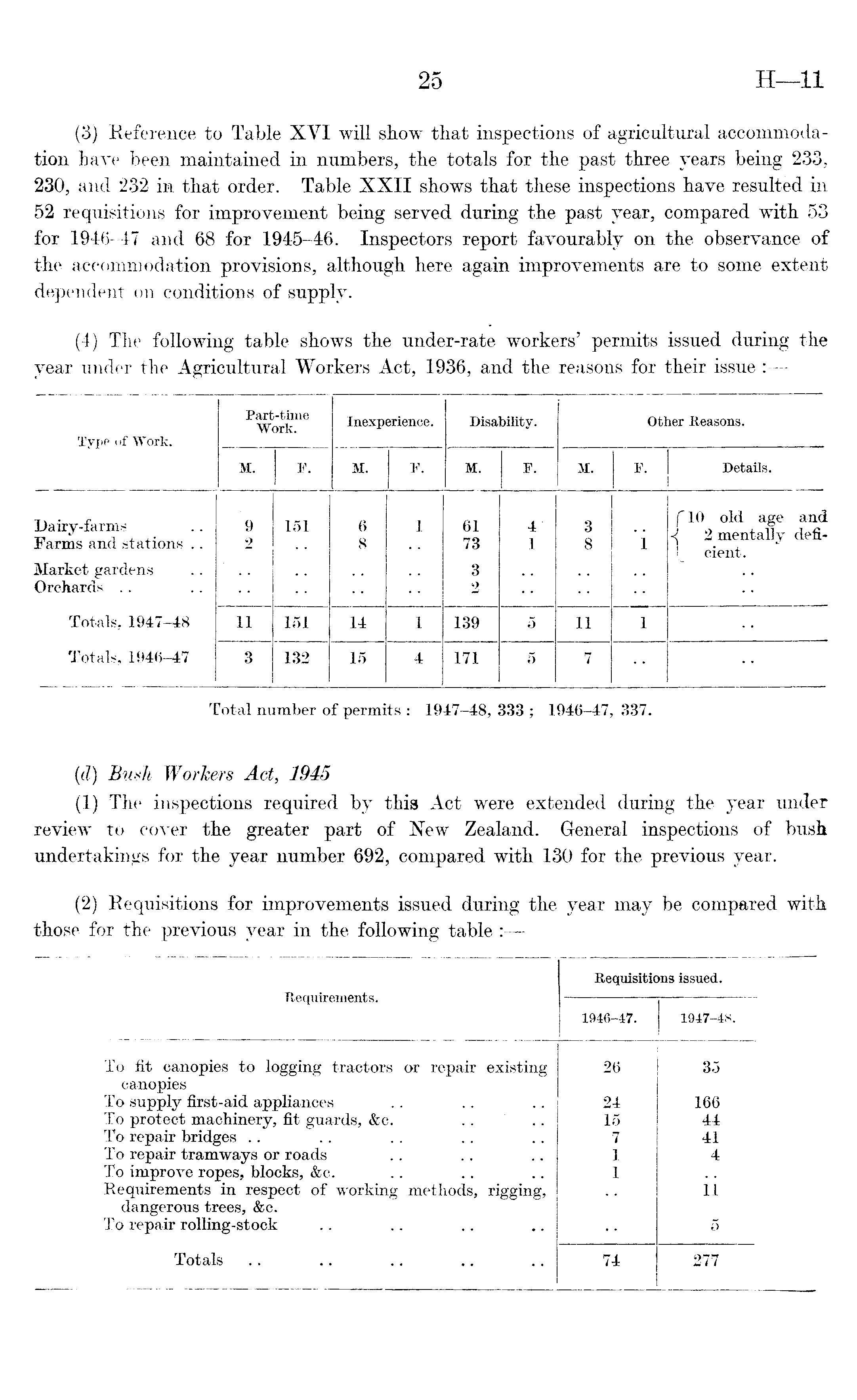 (3) Reference to Table XVI will show that inspections of agricultural accommodation have been maintained in numbers, the totals for the past three years being 233, 230, and 232 in that order. Table XXII shows that these inspections have resulted in 52 requisitions for improvement being served during the past year, compared with 53 for 1946-47 and 68 for 1945-46. Inspectors report favourably on the observance of the accommodation provisions, although here again improvements are to some extent dependent on conditions of supply. (4) The following table shows the under-rate workers' permits issued during the year under the Agricultural Workers Act, 1936, and the reasons for their issue :