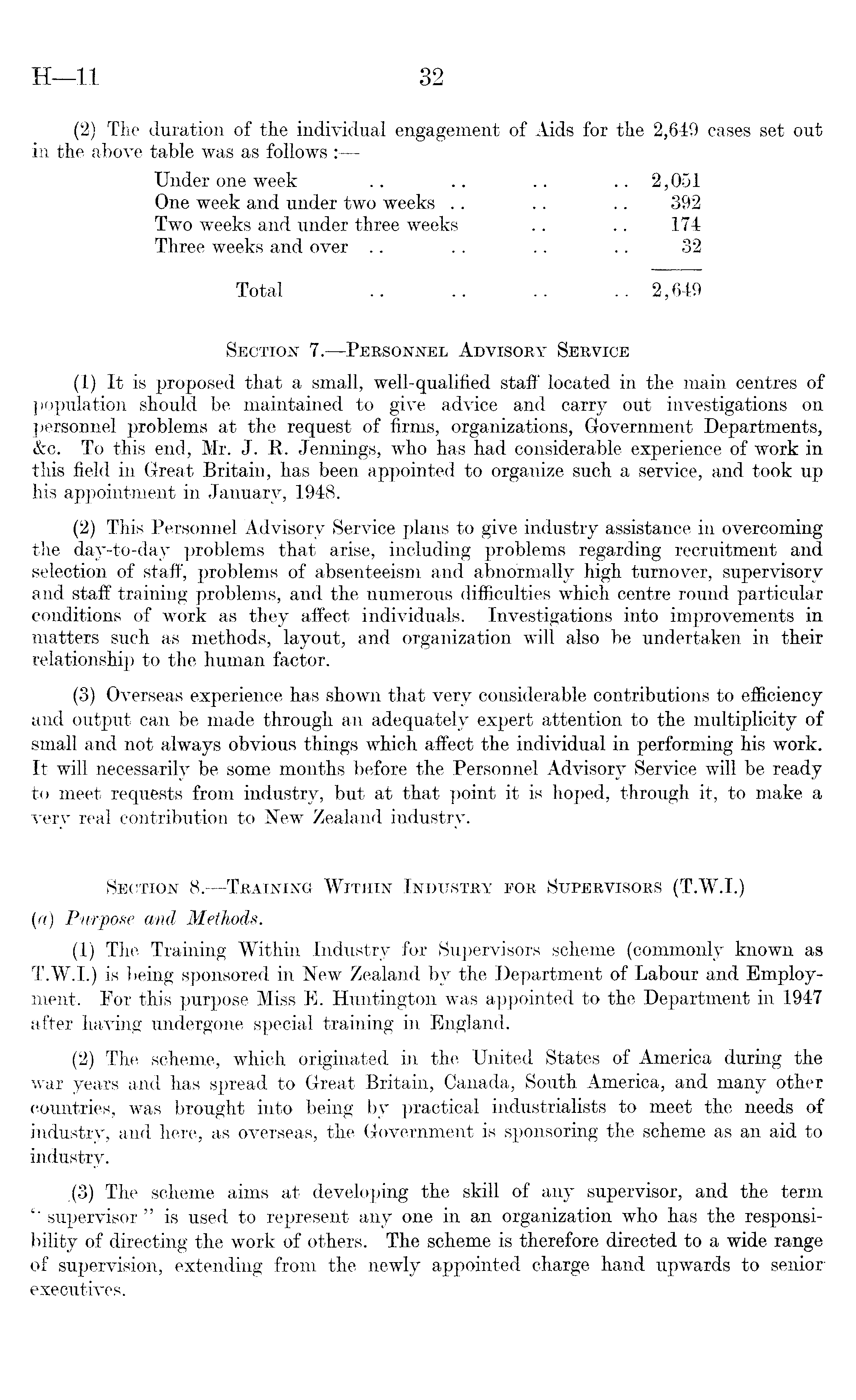 (2) The duration of the individual engagement of Aids for the 2,649 cases set out in the above table was as follows : Under one week .. .. .. .. 2,051 One week and under two weeks .. .. .. 392 Two weeks and under three weeks .. .. 174 Three weeks and over .. .. .. .. 32 Total .. .. .. .. 2,649 Section 7.—Personnel Advisory Service (1) It is proposed that a small, well-qualified staff located in the main centres of population should be maintained to give advice and carry out investigations on personnel problems at the request of firms, organizations, Government Departments, &c. To this end, Mr. J. P. Jennings, who has had considerable experience of work in this field in Great Britain, has been appointed to organize such a service, and took up his appointment in January, 1948. (2) This Personnel Advisory Service plans to give industry assistance in overcoming the day-to-day problems that arise, including problems regarding recruitment and selection of staff, problems of absenteeism and abnormally high turnover, supervisory and staff training problems, and the numerous difficulties which centre round particular conditions of work as they affect individuals. Investigations into improvements in matters such as methods, layout, and organization will also be undertaken in their relationship to the human factor. (3) Overseas experience has shown that very considerable contributions to efficiency and output can be made through an adequately expert attention to the multiplicity of small and not always obvious things which affect the individual in performing his work. It will necessarily be some months before the Personnel Advisory Service will be ready to meet requests from industry, but at that point it is hoped, through it, to make a very real contribution to New Zealand industry. Section 8. —Training Within Industry for Supervisors (T.W.1.) (a) Purpose and Methods. (1) The Training Within Industry for Supervisors scheme (commonly known as T.W.1.) is being sponsored in New Zealand by the Department of Labour and Employment. For this purpose Miss E. Huntington was appointed to the Department in 1947 after having undergone special training in England. (2) The scheme, which originated in the United States of America during the war years and has spread to Great Britain, Canada, South America, and many other countries, was brought into being by practical industrialists to meet the needs of industry, and here, as overseas, the Government is sponsoring the scheme as an aid to industry. (3) The scheme aims at developing the skill of any supervisor, and the term " supervisor " is used to represent any one in an organization who has the responsibility of directing the work of others. The scheme is therefore directed to a wide range of supervision, extending from the newly appointed charge hand upwards to senior executives.