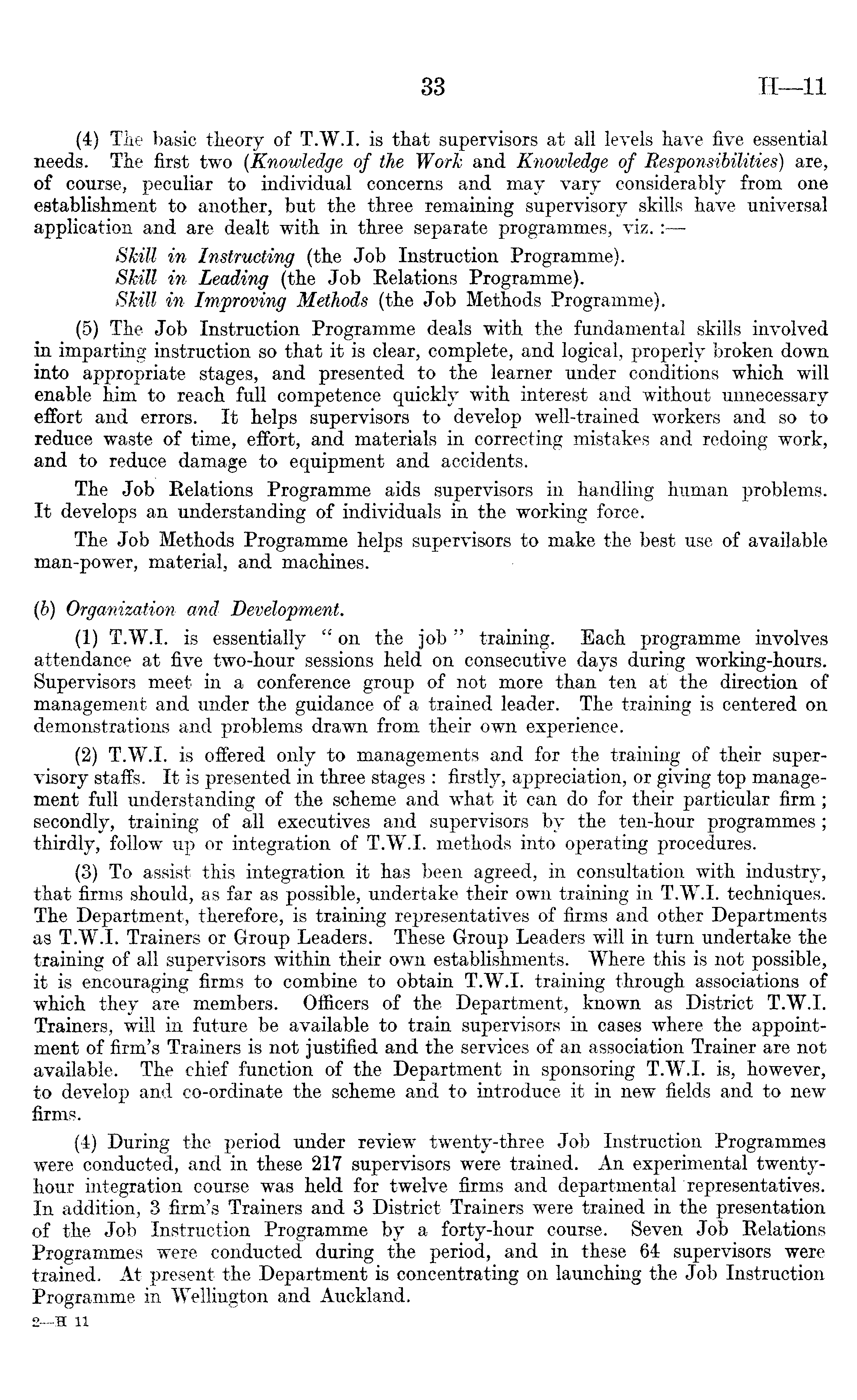 (4) The basic theory of T.W.I, is that supervisors at all levels have five essential needs. The first two (Knowledge of the Work and Knowledge of Responsibilities) are, of course, peculiar to individual concerns and may vary considerably from one establishment to another, but the three remaining supervisory skills have universal application and are dealt with in three separate programmes, viz. : Skill in Instructing (the Job Instruction Programme). Skill in Leading (the Job Relations Programme). Skill in Improving Methods (the Job Methods Programme). (5) The Job Instruction Programme deals with the fundamental skills involved in imparting instruction so that it is clear, complete, and logical, properly broken down into appropriate stages, and presented to the learner under conditions which will enable him to reach full competence quickly with interest and without unnecessary effort and errors. It helps supervisors to develop well-trained workers and so to reduce waste of time, effort, and materials in correcting mistakes and redoing work, and to reduce damage to equipment and accidents. The Job Relations Programme aids supervisors in handling human problems. It develops an understanding of individuals in the working force. The Job Methods Programme helps supervisors to make the best use of available man-power, material, and machines. (b) Organization and Development. (1) T.W.I, is essentially "on the job " training. Each programme involves attendance at five two-hour sessions held on consecutive days during working-hours. Supervisors meet in a conference group of not more than ten at the direction of management and under the guidance of a trained leader. The training is centered on demonstrations and problems drawn from their own experience. (2) T.W.I, is offered only to managements and for the training of their supervisory staffs. It is presented in three stages : firstly, appreciation, or giving top management full understanding of the scheme and what it can do for their particular firm; secondly, training of all executives and supervisors by the ten-hour programmes ; thirdly, follow up or integration of T.W.I, methods into operating procedures. (3) To assist this integration it has been agreed, in consultation with industry, that firms should, as far as possible, undertake their own training in T.W.I, techniques. The Department, therefore, is training representatives of firms and other Departments as T.W.I. Trainers or Group Leaders. These Group Leaders will in turn undertake the training of all supervisors within their own establishments. Where this is not possible, it is encouraging firms to combine to obtain T.W.I, training through associations of which they are members. Officers of the Department, known as District T.W.I. Trainers, will in future be available to train supervisors in cases where the appointment of firm's Trainers is not justified and the services of an association Trainer are not available. The chief function of the Department in sponsoring T.W.I, is, however, to develop and co-ordinate the scheme and to introduce it in new fields and to new firms. (4) During the period under review twenty-three Job Instruction Programmes were conducted, and in these 217 supervisors were trained. An experimental twentyhour integration course was held for twelve firms and departmental representatives. In addition, 3 firm's Trainers and 3 District Trainers were trained in the presentation of the Job Instruction Programme by a forty-hour course. Seven Job Relations Programmes were conducted during the period, and in these 64 supervisors were trained. At present the Department is concentrating on launching the Job Instruction Programme in Wellington and Auckland.