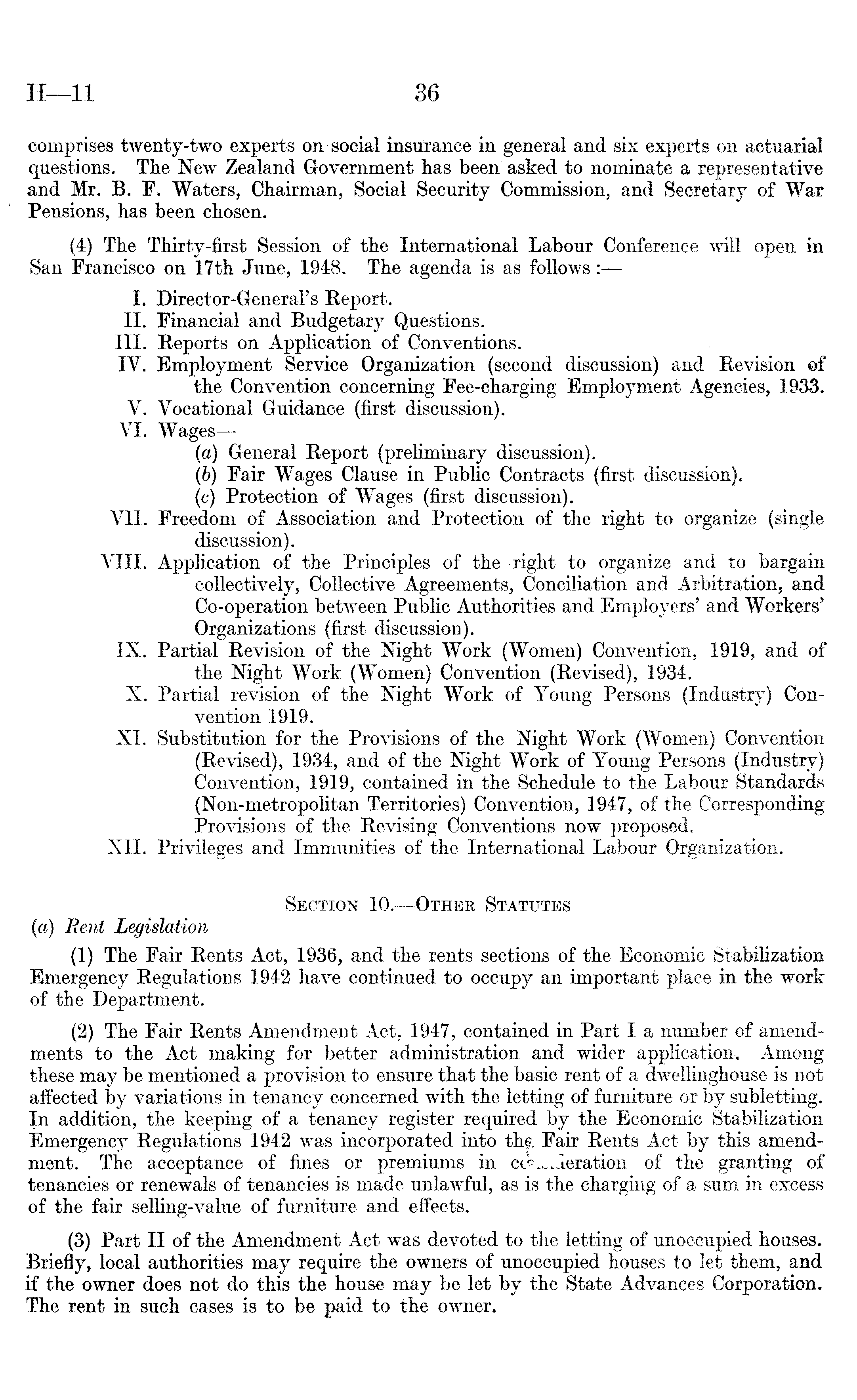 comprises twenty-two experts on social insurance in general and six experts on actuarial questions. The New Zealand Government has been asked to nominate a representative and Mr. B. F. Waters, Chairman, Social Security Commission, and Secretary of War Pensions, has been chosen. (4) The Thirty-first Session of the International Labour Conference will open in San Francisco on 17th June, 1948. The agenda is as follows : I. Director-General's Report. 11. Financial and Budgetary Questions. 111. Reports on Application of Conventions. IV. Employment Service Organization (second discussion) and Revision of the Convention concerning Fee-charging Employment Agencies, 1933. V. Vocational Guidance (first discussion). VI. Wages—(a) General Report (preliminary discussion). (b) Fair Wages Clause in Public Contracts (first discussion). (c) Protection of Wages (first discussion). VII. Freedom of Association and Protection of the right to organize (single discussion). VIII. Application of the Principles of the right to organize and to bargain collectively, Collective Agreements, Conciliation and Arbitration, and Co-operation between Public Authorities and Employers' and Workers' Organizations (first discussion). IX. Partial Revision of the Night Work (Women) Convention, 1919, and of the Night Work (Women) Convention (Revised), 1934. X. Partial revision of the Night Work of Young Persons (Industry) Convention 1919. XL Substitution for the Provisions of the Night Work (Women) Convention (Revised), 1934, and of the Night Work of Young Persons (Industry) Convention, 1919, contained in the Schedule to the Labour Standards (Non-metropolitan Territories) Convention, 1947, of the Corresponding Provisions of the Revising Conventions now proposed. XII. Privileges and Immunities of the International Labour Organization. Section 10.—Other Statutes (a) Bent Legislation (1) The Fair Rents Act, 1936, and the rents sections of the Economic Stabilization Emergency Regulations 1942 have continued to occupy an important place in the work of the Department. (2) The Fair Rents Amendment Act, 1947, contained in Part I a number of amendments to the Act making for better administration and wider application. Among these may be mentioned a provision to ensure that the basic rent of a dwellinghouse is not affected by variations in tenancy concerned with the letting of furniture or by subletting. In addition, the keeping of a tenancy register required by the Economic Stabilization Emergency Regulations 1942 was incorporated into tha Fair Rents Act by this amendment. The acceptance of fines or premiums in etc....aeration of the granting of tenancies or renewals of tenancies is made unlawful, as is the charging of a sum in excess of the fair selling-value of furniture and effects. (3) Part II of the Amendment Act was devoted to the letting of unoccupied houses. Briefly, local authorities may require the owners of unoccupied houses to let them, and if the owner does not do this the house may be let by the State Advances Corporation. The rent in such cases is to be paid to the owner.
