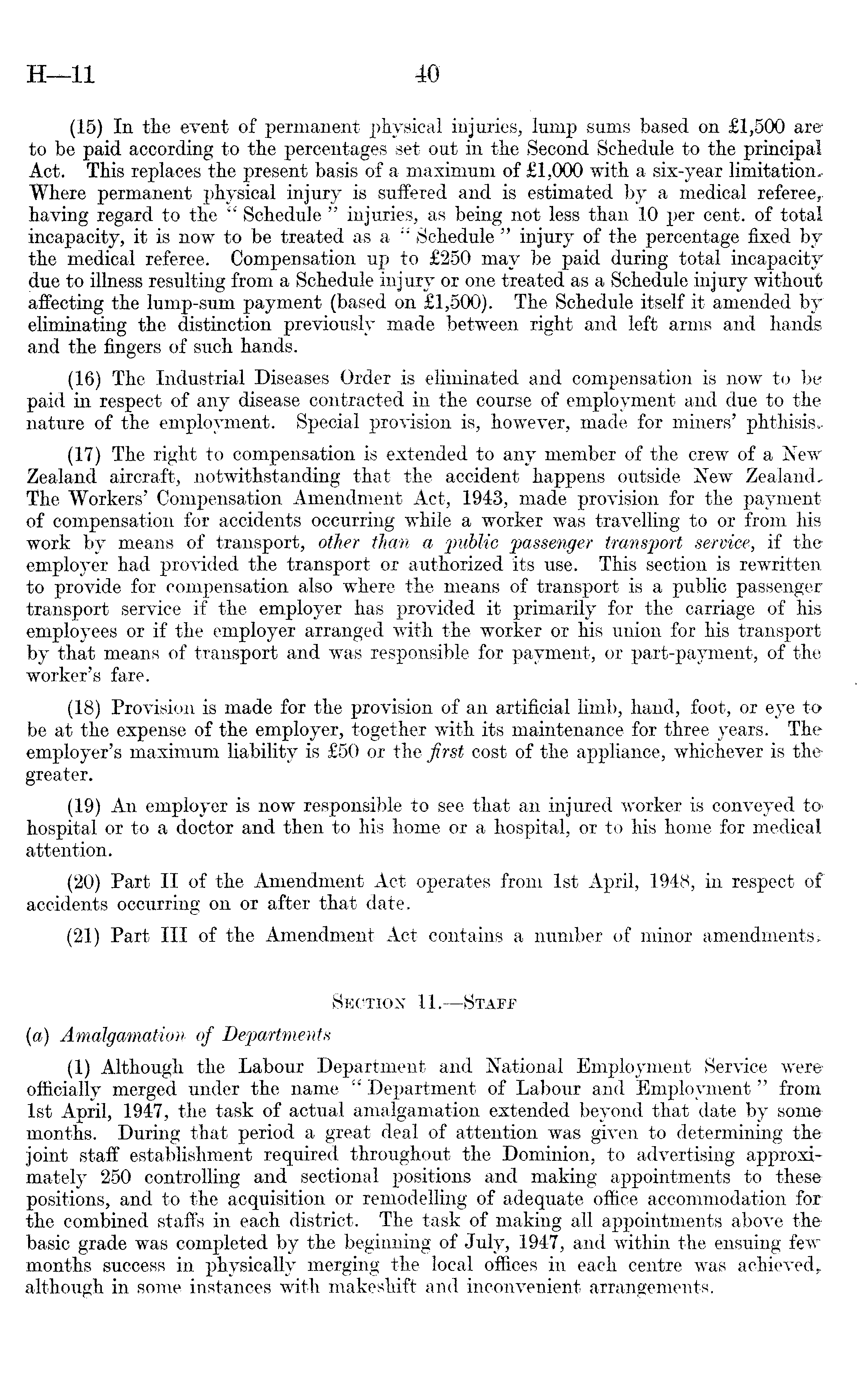 (15) In the event of permanent physical injuries, lump sums based on £1,500 are to be paid according to the percentages set out in the Second Schedule to the principal Act. This replaces the present basis of a maximum of £l,OOO with a six-year limitation. Where permanent physical injury is suffered and is estimated by a medical referee, having regard to the " Schedule " injuries, as being not less than 10 per cent, of total incapacity, it is now to be treated as a " Schedule " injury of the percentage fixed by the medical referee. Compensation up to £250 may be paid during total incapacity due to illness resulting from a Schedule injury or one treated as a Schedule injury without affecting the lump-sum payment (based on £1,500). The Schedule itself it amended by eliminating the distinction previously made between right and left arms and hands and the fingers of such hands. (16) The Industrial Diseases Order is eliminated and compensation is now to be paid in respect of any disease contracted in the course of employment and due to the nature of the employment. Special provision is, however, made for miners' phthisis .■- (17) The right to compensation is extended to any member of the crew of a New Zealand aircraft, notwithstanding that the accident happens outside New Zealand, The Workers' Compensation Amendment Act, 1943, made provision for the payment of compensation for accidents occurring while a worker was travelling to or from his work by means of transport, other than a public passenger transport service, if the employer had provided the transport or authorized its use. This section is rewritten to provide for compensation also where the means of transport is a public passenger transport service if the employer has provided it primarily for the carriage of his employees or if the employer arranged with the worker or his union for his transport by that means of transport and was responsible for payment, or part-payment, of the worker's fare. (18) Provision is made for the provision of an artificial limb, hand, foot, or eye to be at the expense of the employer, together with its maintenance for three years. The employer's maximum liability is £5O or the first cost of the appliance, whichever is the greater. (19) An employer is now responsible to see that an injured worker is conveyed to hospital or to a doctor and then to his home or a hospital, or to his home for medical attention. (20) Part II of the Amendment Act operates from Ist April, 1948, in respect of accidents occurring on or after that date. (21) Part 111 of the Amendment Act contains a number of minor amendments, Section 11.—Staff (a) Amalgamation of Departments (1) Although the Labour Department and National Employment Service were officially merged under the name " Department of Labour and Employment " from Ist April, 1947, the task of actual amalgamation extended beyond that date by some months. During that period a great deal of attention was given to determining the joint staff establishment required throughout the Dominion, to advertising approximately 250 controlling and sectional positions and making appointments to these positions, and to the acquisition or remodelling of adequate office accommodation for the combined staffs in each district. The task of making all appointments above the basic grade was completed by the beginning of July, 1947, and within the ensuing few months success in physically merging the local offices in each centre was achieved, although in some instances with makeshift and inconvenient arrangements.