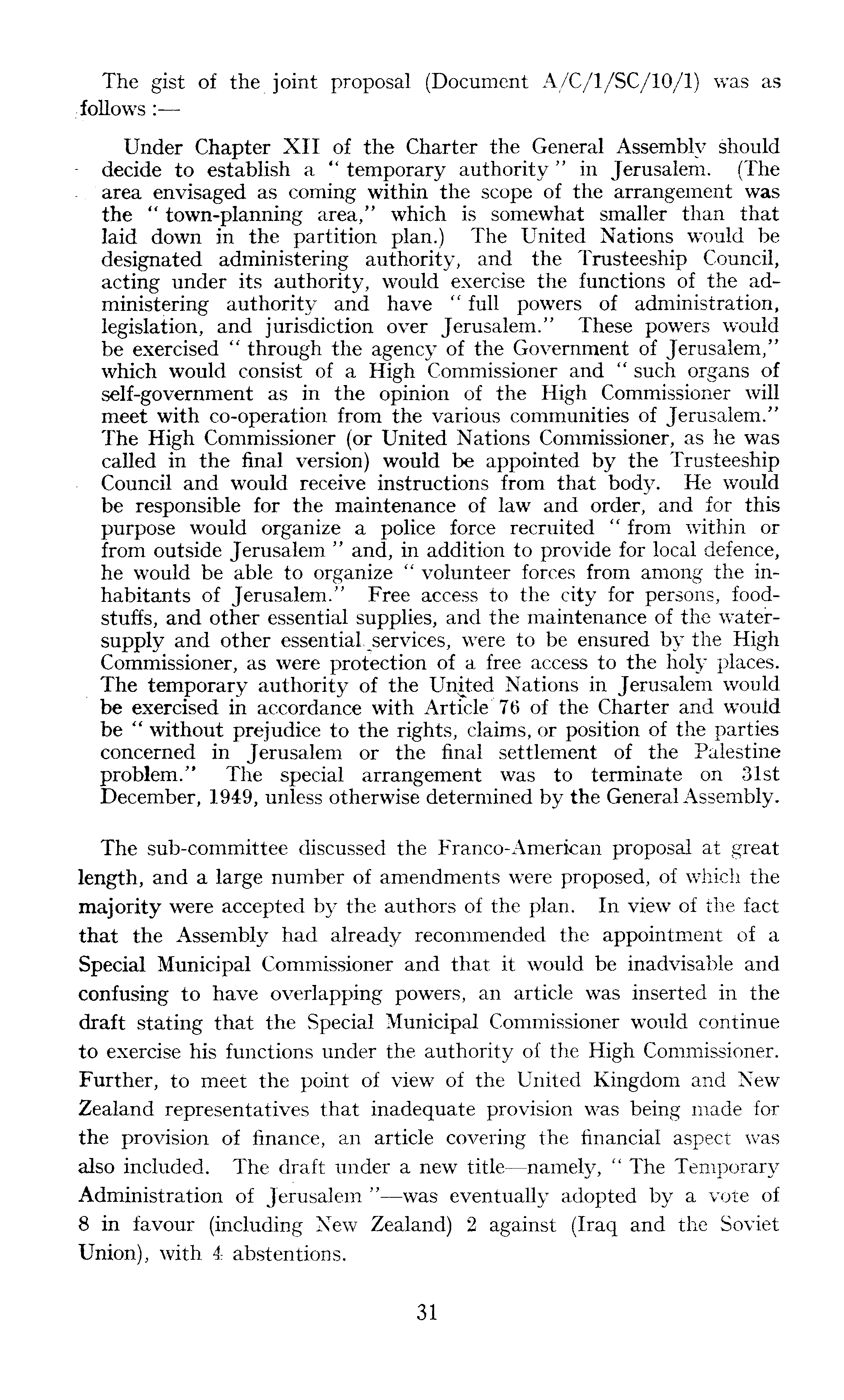 The gist of the joint proposal (Document A/C/l/SC/10/1) was as follows: Under Chapter XII of the Charter the General Assembly should - decide to establish a " temporary authority " in Jerusalem. (The area envisaged as coming within the scope of the arrangement was the " town-planning area," which is somewhat smaller than that laid down in the partition plan.) The United Nations would be designated administering authority, and the Trusteeship Council, acting under its authority, would exercise the functions of the administering authority and have " full powers of administration, legislation, and jurisdiction over Jerusalem." These powers would be exercised " through the agency of the Government of Jerusalem," which would consist of a High Commissioner and " such organs of self-government as in the opinion of the High Commissioner will meet with co-operation from the various communities of Jerusalem." The High Commissioner (or United Nations Commissioner, as he was called in the final version) would be appointed by the Trusteeship Council and would receive instructions from that body. He would be responsible for the maintenance of law and order, and for this purpose would organize a police force recruited " from within or from outside Jerusalem " and, in addition to provide for local defence, he would be able to organize " volunteer forces from among the inhabitants of Jerusalem." Free access to the city for persons, foodstuffs, and other essential supplies, and the maintenance of the watersupply and other essential, services, were to be ensured by the High Commissioner, as were protection of a free access to the holy places. The temporary authority of the United Nations in Jerusalem would be exercised in accordance with Article 76 of the Charter and wouid be " without prejudice to the rights, claims, or position of the parties concerned in Jerusalem or the final settlement of the Palestine problem." The special arrangement was to terminate on 31st December, 1949, unless otherwise determined by the General Assembly. The sub-committee discussed the Franco-American proposal at great length, and a large number of amendments were proposed, of which the majority were accepted by the authors of the plan. In view of the fact that the Assembly had already recommended the appointment of a Special Municipal Commissioner and that it would be inadvisable and confusing to have overlapping powers, an article was inserted in the draft stating that the Special Municipal Commissioner would continue to exercise his functions under the authority of the High Commissioner. Further, to meet the point of view of the United Kingdom and New Zealand representatives that inadequate provision was being made for the provision of finance, an article covering the financial aspect was also included. The draft under a new title —namely, " The Temporary Administration of Jerusalem " —was eventually adopted by a vote of 8 in favour (including New Zealand) 2 against (Iraq and the Soviet Union), with 4 abstentions.