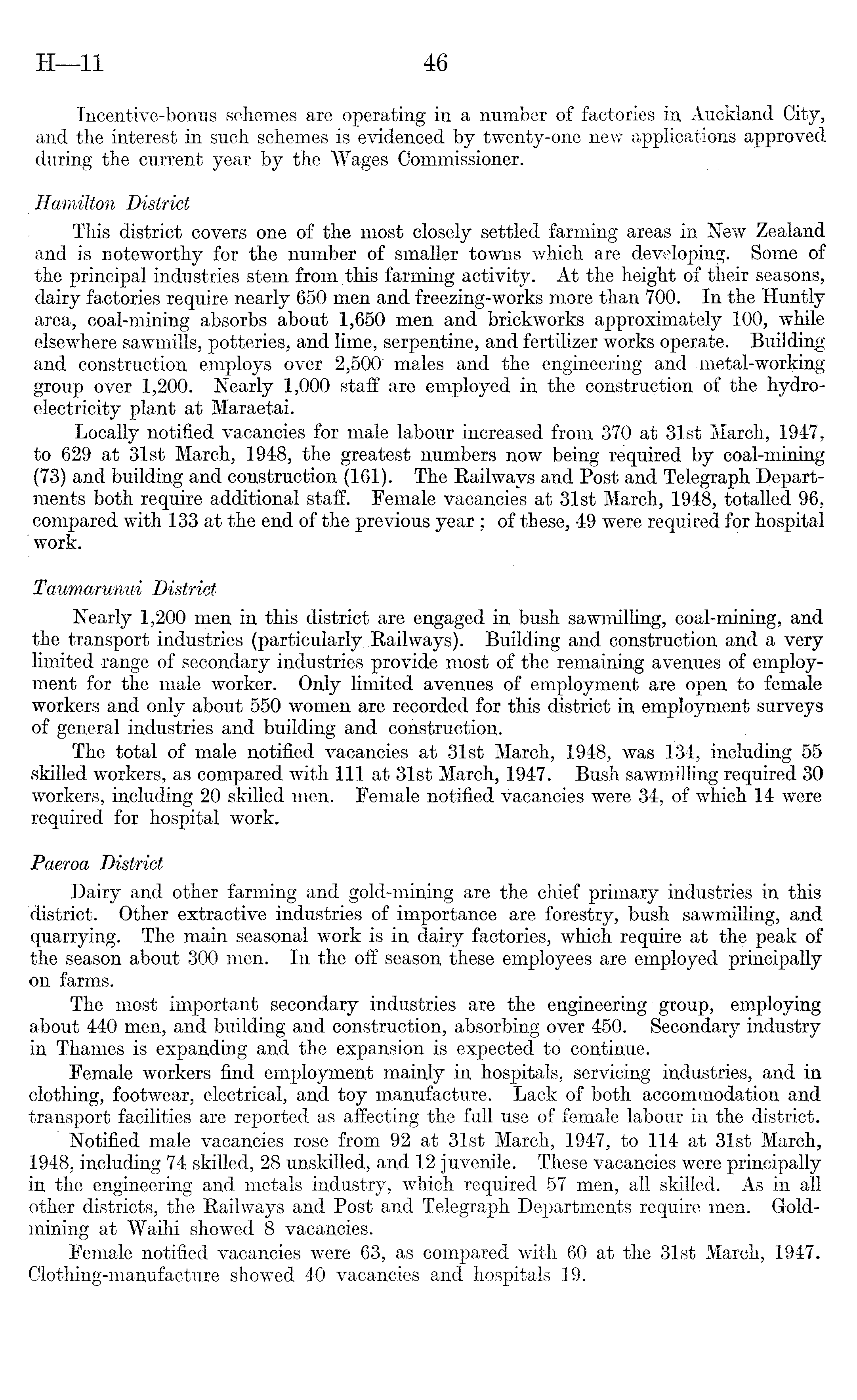 Incentive-bonus schemes are operating in a number of factories in Auckland City, and the interest in such schemes is evidenced by twenty-one new applications approved during the current year by the Wages Commissioner. Hamilton District This district covers one of the most closely settled farming areas in New Zealand and is noteworthy for the number of smaller towns which are developing. Some of the principal industries stem from this farming activity. At the height of their seasons, dairy factories require nearly 650 men and freezing-works more than 700. In the Huntly area, coal-mining absorbs about 1,650 men and brickworks approximately 100, while elsewhere sawmills, potteries, and lime, serpentine, and fertilizer works operate. Building and construction employs over 2,500 males and the engineering and metal-working group over 1,200. Nearly 1,000 staff are employed in the construction of the. hydroelectricity plant at Maraetai. Locally notified vacancies for male labour increased from 370 at 31st March, 1947, to 629 at 31st March, 1948, the greatest numbers now being required by coal-mining (73) and building and construction (161). The Eailways and Post and Telegraph Departments both require additional staff. Female vacancies at 31st March, 1948, totalled 96, compared with 133 at the end of the previous year: of these, 49 were required for hospital work. Taumarunui District Nearly 1,200 men in this district are engaged in bush sawmilling, coal-mining, and the transport industries (particularly Eailways). Building and construction and a very limited range of secondary industries provide most of the remaining avenues of employment for the male worker. Only limited avenues of employment are open to female workers and only about 550 women are recorded for this district in employment surveys of general industries and building and construction. The total of male notified vacancies at 31st March, 1948, was 134, including 55 skilled workers, as compared with 111 at 31st March, 1947. Bush sawmilling required 30 workers, including 20 skilled men. Female notified vacancies were 34, of which 14 were required for hospital work. Paeroa District Dairy and other farming and gold-mining are the chief primary industries in this district. Other extractive industries of importance are forestry, bush sawmilling, and quarrying. The main seasonal work is in dairy factories, which require at the peak of the season about 300 men. In the off season these employees are employed principally on farms. The most important secondary industries are the engineering' group, employing about 440 men, and building and construction, absorbing over 450. Secondary industry in Thames is expanding and the expansion is expected to continue. Female workers find employment mainly in hospitals, servicing industries, and in clothing, footwear, electrical, and toy manufacture. Lack of both accommodation and transport facilities are reported as affecting the full use of female labour in the district. Notified male vacancies rose from 92 at 31st March, 1947, to 114 at 31st March, 1948, including 74 skilled, 28 unskilled, and 12 juvenile. These vacancies were principally in the engineering and metals industry, which required 57 men, all skilled. As in all other districts, the Eailways and Post and Telegraph Departments require men. Goldmining at Waihi showed 8 vacancies. Female notified vacancies were 63, as compared with 60 at the 31st March, 1947. Clothing-manufacture showed 40 vacancies and hospitals 19.