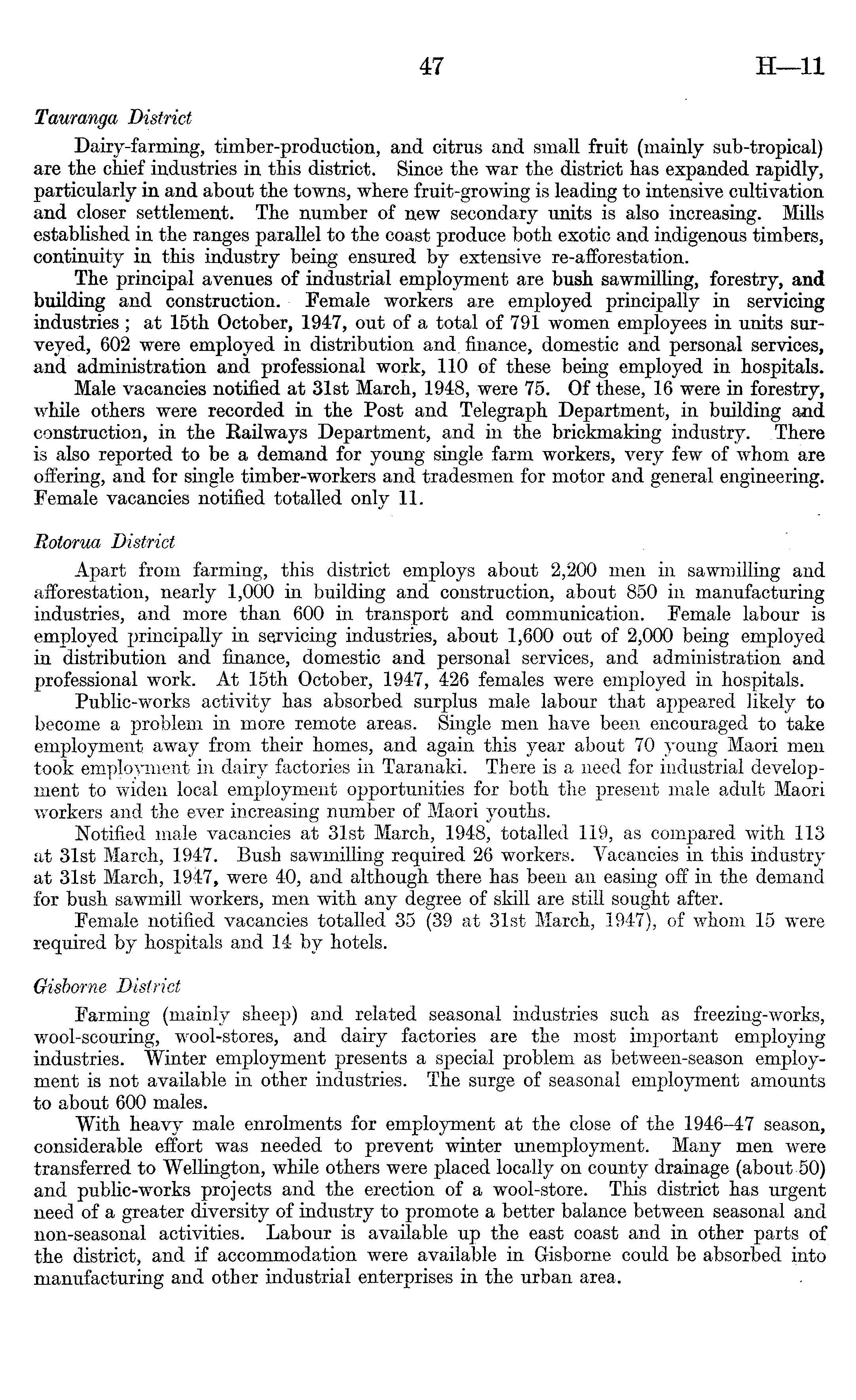 Tauranga District Dairy-farming, timber-production, and citrus and small fruit (mainly sub-tropical) are the chief industries in this district. Since the war the district has expanded rapidly, particularly in and about the towns, where fruit-growing is leading to intensive cultivation and closer settlement. The number of new secondary units is also increasing. Mills established in the ranges parallel to the coast produce both exotic and indigenous timbers, continuity in this industry being ensured by extensive re-afforestation. The principal avenues of industrial employment are bush sawmilling, forestry, and building and construction. Female workers are employed principally in servicing industries ; at 15th October, 1947, out of a total of 791 women employees in units surveyed, 602 were employed in distribution and finance, domestic and personal services, and administration and professional work, 110 of these being employed in hospitals. Male vacancies notified at 31st March, 1918, were 75. Of these, 16 were in forestry, while others were recorded in the Post and Telegraph Department, in building and construction, in the Kail ways Department, and in the brickmakmg industry. There is also reported to be a demand for young single farm workers, very few of whom are offering, and for single timber-workers and tradesmen for motor and general engineering. Female vacancies notified totalled only 11. Rolorua District Apart from farming, this district employs about 2,200 men in sawmilling and afforestation, nearly 1,000 in building and construction, about 850 in manufacturing industries, and more than 600 in transport and communication. Female labour is employed principally in servicing industries, about 1,600 out of 2,000 being employed in distribution and finance, domestic and personal services, and administration and professional work. At 15th October, 1917, 426 females were employed in hospitals. Public-works activity has absorbed surplus male labour that appeared likely to become a problem in more remote areas. Single men have been eneouraged to take employment away from their homes, and again this year about 70 young Maori men took employment in dairy factories in Taranaki. There is a need for industrial development to widen local employment opportunities for both the present male adult Maori workers and the ever increasing number of Maori youths. Notified male vacancies at 31st March, 1948, totalled 119, as compared with 113 at 31st March, 1947. Bush sawmilling required 26 workers. Vacancies in this industry at 31st March, 1947, were 40, and although there has been an easing off in the demand for bush sawmill workers, men with any degree of skill are still sought after. Female notified vacancies totalled 35 (39 at 31st March, 1947), of whom 15 were required by hospitals and 14 by hotels. Gisborne District Farming (mainly sheep) and related seasonal industries such as freezing-works, wool-scouring, wool-stores, and dairy factories are the most important employing industries. Winter employment presents a special problem as between-season employment is not available in other industries. The surge of seasonal employment amounts to about 600 males. With heavy male enrolments for employment at the close of the 1946-47 season, considerable effort was needed to prevent winter unemployment. Many men were transferred to Wellington, while others were placed locally on county drainage (about 50) and public-works projects and the erection of a wool-store. This district has urgent need of a greater diversity of industry to promote a better balance between seasonal and non-seasonal activities. Labour is available up the east coast and in other parts of the district, and if accommodation were available in Gisborne could be absorbed into manufacturing and other industrial enterprises in the urban area.