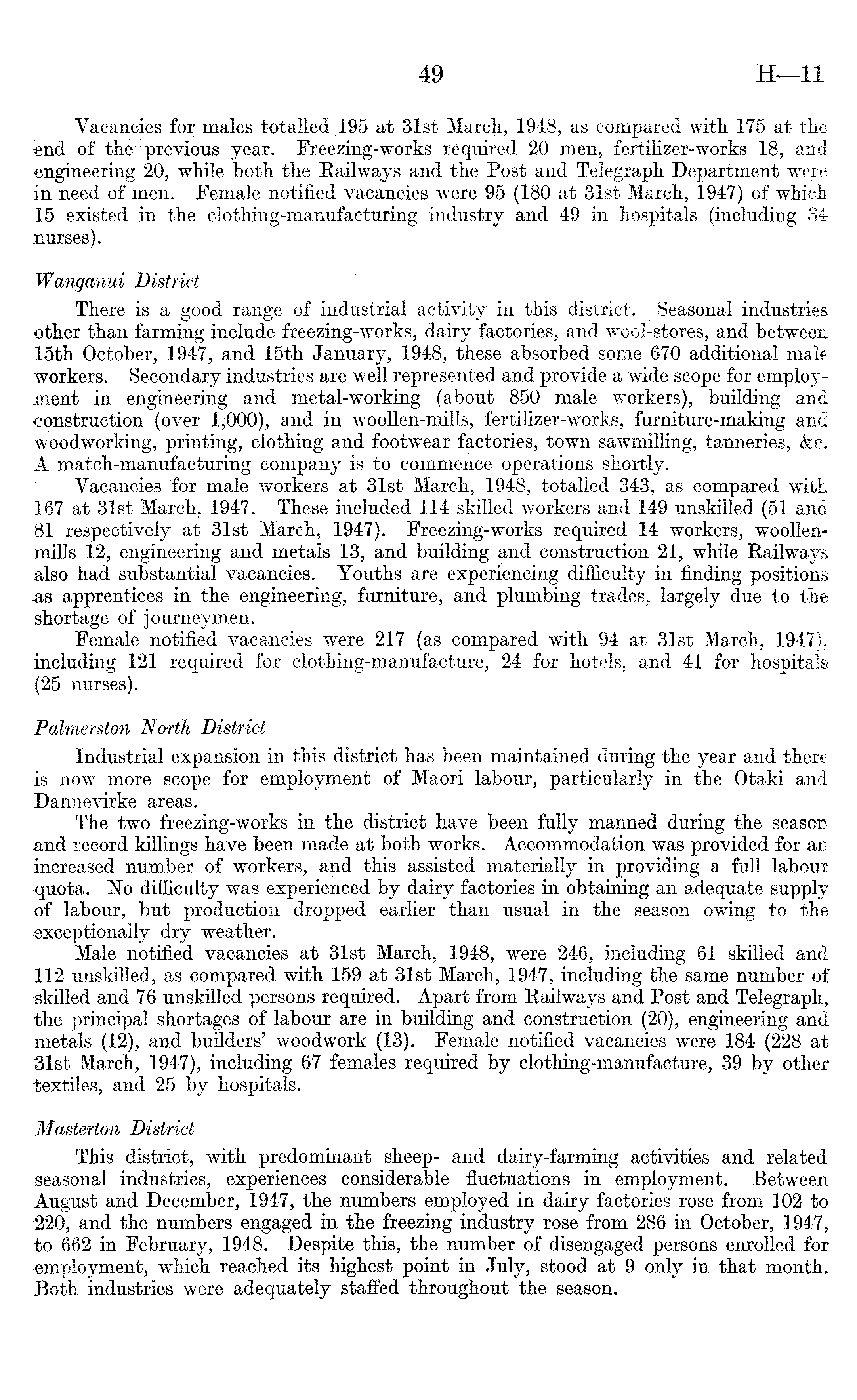 Vacancies for males totalled 195 at 31st March, 1948, as compared with 175 at the -end of the previous year. Freezing-works required 20 men, fertilizer-works 18, and engineering 20, while both the Railways and the Post and Telegraph Department were in need of men. Female notified vacancies were 95 (180 at 31st March, 1947) of which 15 existed in the clothing-manufacturing industry and 49 in hospitals (including 34 nurses). Wanganui District There is a good range of industrial activity in this district. Seasonal industries other than farming include freezing-works, dairy factories, and wool-stores, and between 15th October, 1947, and 15th January, 1948, these absorbed some 670 additional male workers. Secondary industries are well represented and provide a wide scope for employment in engineering and metal-working (about 850 male workers), building and construction (over 1,000), and in woollen-mills, fertilizer-works, furniture-making and woodworking, printing, clothing and footwear factories, town sawmilling, tanneries, &c. A match-manufacturing company is to commence operations shortly. Vacancies for male workers at 31st March, 1948, totalled 343, as compared with 167 at 31st March, 1947. These included 114 skilled workers and 149 unskilled (51 and 81 respectively at 31st March, 1947). Freezing-works required 14 workers, woollenmills 12, engineering and metals 13, and building and construction 21, while Railways a,lso had substantial vacancies. Youths are experiencing difficulty in finding positions as apprentices in the engineering, furniture, and plumbing trades, largely due to the shortage of journeymen. Female notified vacancies were 217 (as compared with 94 at 31st March, 1947), including 121 required for clothing-manufacture, 24 for hotels, and 41 for hospitals (25 nurses). Palmerston North District Industrial expansion in this district has been maintained during the year and there is now more scope for employment of Maori labour, particularly in the Otaki and Dannevirke areas. The two freezing-works in the district have been fully manned during the season and record killings have been made at both works. Accommodation was provided for an increased number of workers, and this assisted materially in providing a full labour quota. No difficulty was experienced by dairy factories in obtaining an adequate supply of labour, but production dropped earlier than usual in the season owing to the •exceptionally dry weather. Male notified vacancies at 31st March, 1948, were 246, including 61 skilled and 112 unskilled, as compared with 159 at 31st March, 1947, including the same number of skilled and 76 unskilled persons required. Apart from Railways and Post and Telegraph, the principal shortages of labour are in building and construction (20), engineering and metals (12), and builders' woodwork (13). Female notified vacancies were 184 (228 at 31st March, 1947), including 67 females required by clothing-manufacture, 39 by other textiles, and 25 by hospitals. Masterton District This district, with predominant sheep- and dairy-farming activities and related seasonal industries, experiences considerable fluctuations in employment. Between August and December, 1947, the numbers employed in dairy factories rose from 102 to 220, and the numbers engaged in the freezing industry rose from 286 in October, 1947, to 662 in February, 1948. Despite this, the number of disengaged persons enrolled for employment, which reached its highest point in July, stood at 9 only in that month. Both industries were adequately staffed throughout the season.