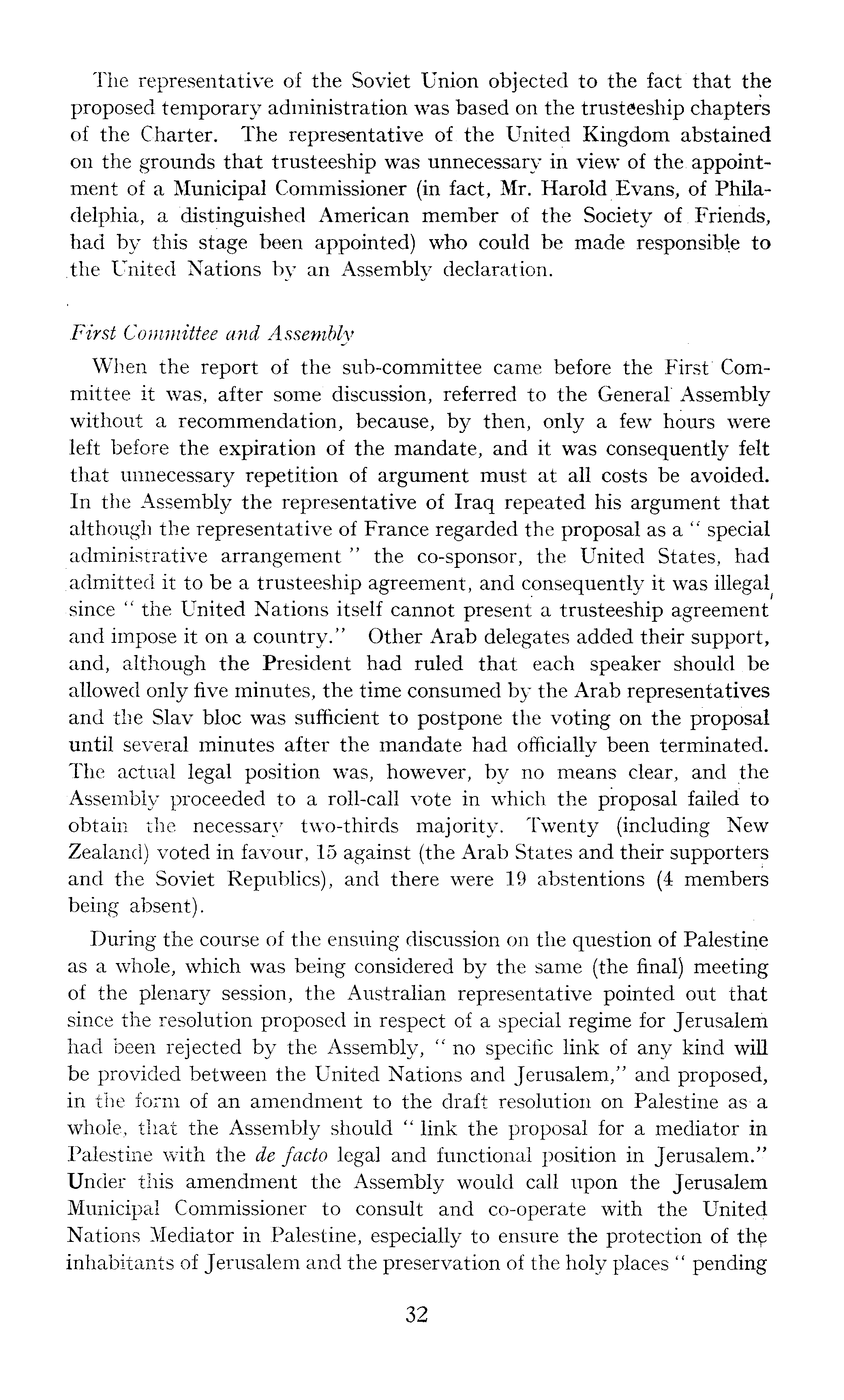 The representative of the Soviet Union objected to the fact that the proposed temporary administration was based on the trusteeship chapters of the Charter. The representative of the United Kingdom abstained on the grounds that trusteeship was unnecessary in view of the appointment of a Municipal Commissioner (in fact, Mr. Harold Evans, of Philadelphia, a distinguished American member of the Society of Friends, had by this stage been appointed) who could be made responsible to the United Nations by an Assembly declaration. First Committee and Assembly When the report of the sub-committee came before the First Committee it was, after some discussion, referred to the General Assembly without a recommendation, because, by then, only a few hours were left before the expiration of the mandate, and it was consequently felt that unnecessary repetition of argument must at all costs be avoided. In the Assembly the representative of Iraq repeated his argument that although the representative of France regarded the proposal as a " special administrative arrangement " the co-sponsor, the United States, had admitted it to be a trusteeship agreement, and consequently it was illegal since " the United Nations itself cannot present a trusteeship agreement and impose it on a country." Other Arab delegates added their support, and, although the President had ruled that each speaker should be allowed only five minutes, the time consumed by the Arab representatives and the Slav bloc was sufficient to postpone the voting on the proposal until several minutes after the mandate had officially been terminated. The actual legal position was, however, by no means clear, and the Assembly proceeded to a roll-call vote in which the proposal failed to obtain the necessary two-thirds majority. Twenty (including New Zealand) voted in favour, 15 against (the Arab States and their supporters and the Soviet Republics), and there were 19 abstentions (4 members being absent). During the course of the ensuing discussion on the question of Palestine as a whole, which was being considered by the same (the final) meeting of the plenary session, the Australian representative pointed out that since the resolution proposed in respect of a special regime for Jerusalem had been rejected by the Assembly, " no specific link of any kind will be provided between the United Nations and Jerusalem," and proposed, in the form of an amendment to the draft resolution on Palestine as a whole, that the Assembly should " link the proposal for a mediator in Palestine with the de facto legal and functional position in Jerusalem." Under this amendment the Assembly would call upon the Jerusalem Municipal Commissioner to consult and co-operate with the United Nations Mediator in Palestine, especially to ensure the protection of th£ inhabitants of Jerusalem and the preservation of the holy places " pending