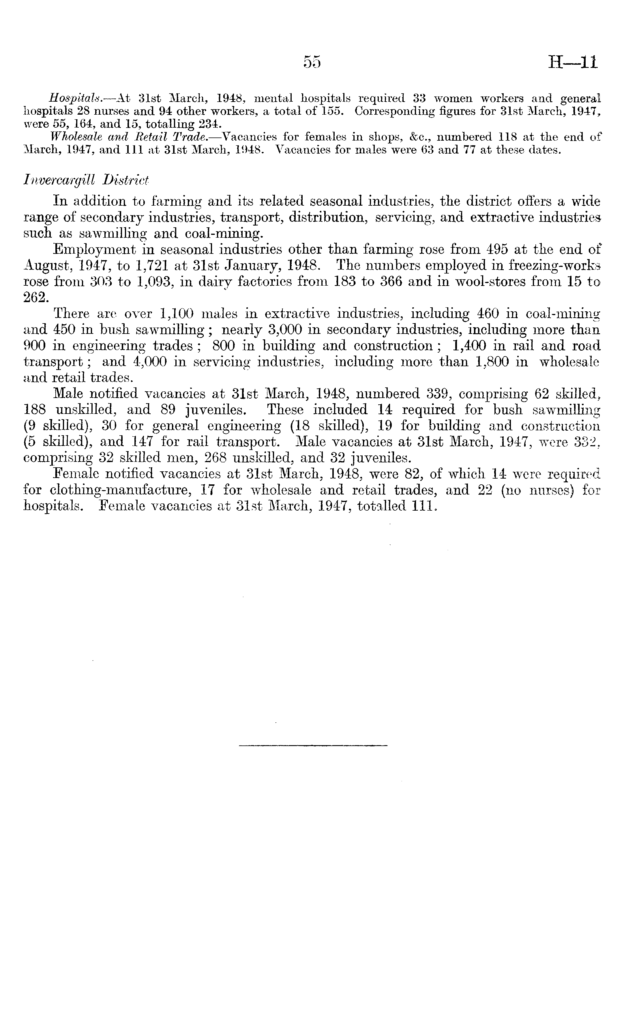 Hospitals. —At 31st March, 1948, mental hospitals required 33 women workers and general hospitals 28 nurses and 94 other workers, a total of 155. Corresponding figures for 31st March, 1947, were 55, 164, and 15, totalling 234. Wholesale and Retail Trade.— Vacancies for females in shops, &c, numbered 118 at the end of March, 1947, and 111 at 31st March, 1948. Vacancies for males were 63 and 77 at these dates. Invercargill District In addition to farming and its related seasonal industries, the district offers a wide range of secondary industries, transport, distribution, servicing, and extractive industries such as sawmilling and coal-mining. Employment in seasonal industries other than farming rose from 495 at the end of August, 1947, to 1,721 at 31st January, 1948. The numbers employed in freezing-works rose from 303 to 1,093, in dairy factories from 183 to 366 and in wool-stores from 15 to 262. There are over 1,100 males in extractive industries, including 460 in coal-mining and 450 in bush sawmilling; nearly 3,000 in secondary industries, including more than 900 in engineering trades; 800 in building and construction; 1,400 in rail and road transport; and 4,000 in servicing industries, including more than 1,800 in wholesale and retail trades. Male notified vacancies at 31st March, 1948, numbered 339, comprising 62 skilled, 188 unskilled, and 89 juveniles. These included 14 required for bush sawmilling (9 skilled), 30 for general engineering (18 skilled), 19 for building and construction (5 skilled), and 147 for rail transport. Male vacancies at 31st March, 1947, were 332, comprising 32 skilled men, 268 unskilled, and 32 juveniles. Female notified vacancies at 31st March, 1948, were 82, of which 14 were required for clothing-manufacture, 17 for wholesale and retail trades, and 22 (no nurses) for hospitals. Female vacancies at 31st March, 1947, totalled 111.
