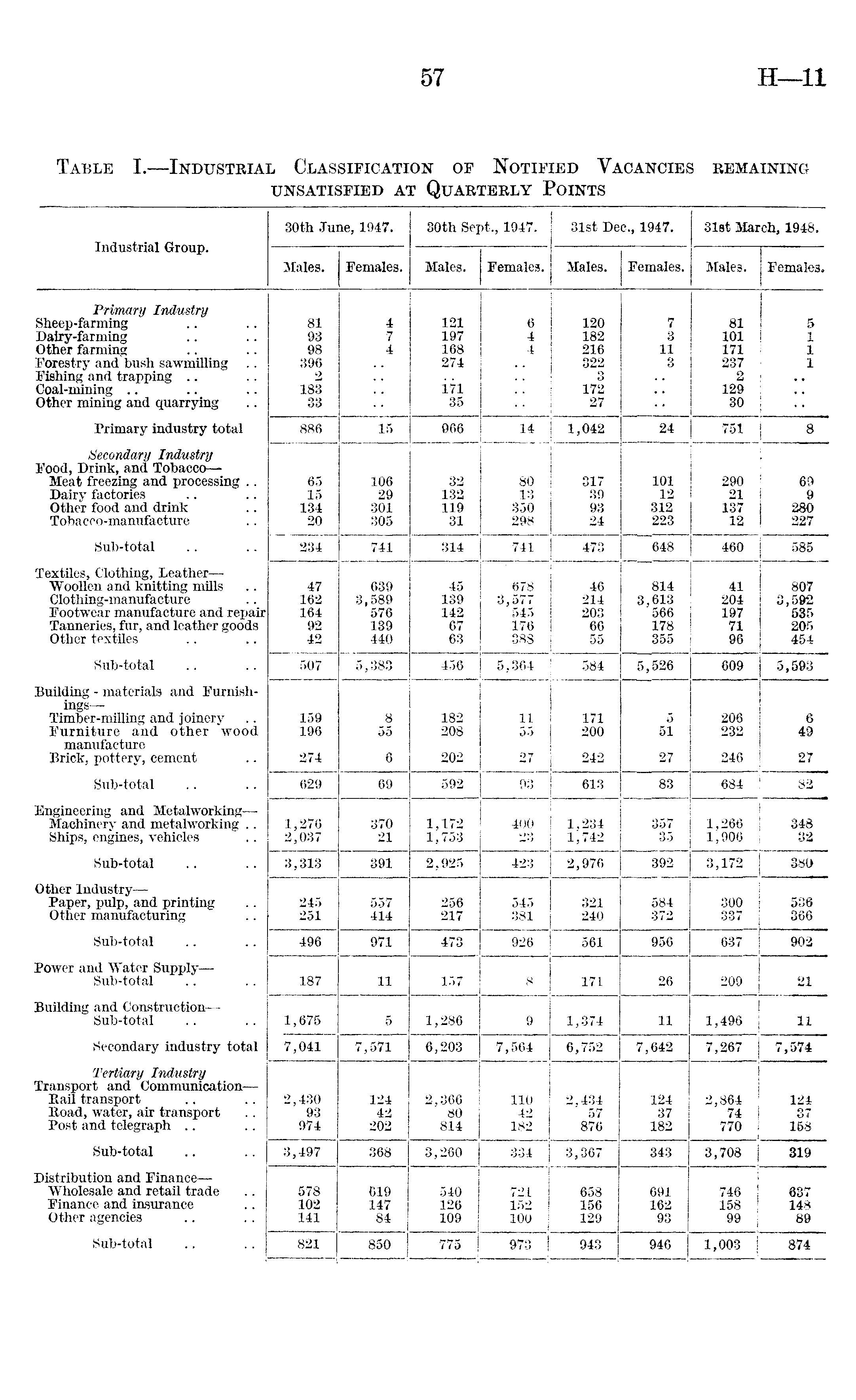 Industrial Group. 30th June, 1947. 30th Sept., 1947. 31st Dec, 1947. 31st March, 1948. Males. Females. Males. Females. Males. Females. Males. Females. Primary Industry Sheep-farming Dairy-farming Other farming Forestry and bush sawrnilling Fishing and trapping .. Coal-mining Other mining and quarrying 81 93 98 396 2 183 33 4 7 4 121 197 168 274 in 35 6 4 4 120 182 216 322 3 172 27 7 3 11 3 81 101 171 237 2 129 30 5 1 1 1 Primary industry total 886 15 966 14 1,042 24 751 8 Secondary Industry Food, Drink, and Tobacco— Meat freezing and processing Dairy factories Other food and drink Tobacco-manufacture 65 15 134 20 106 29 301 305 32 132 119 31 80 13 350 298 317 39 93 24 101 12 312 223 290 21 137 12 69 9 280 227 Sub-total 234 741 314 741 473 648 460 585 Textiles, Clothing, Leather — Woollen and knitting mills Clothing-manufacture Footwear manufacture and rep Tanneries, fur, and leather goo< Other textiles 47 162 air 164 Is 92 42 639 3,589 576 139 440 45 139 142 67 63 678 3,577 545 176 388 46 214 203 66 55 814 3,613 566 178 355 41 204 197 71 96 807 3,592 535 205 454 Sub-total 507 5,383 456 5,364 584 5,526 609 5,593 Building - materials and Furnis ings— Timber-milling and joinery Furniture and other woe manufacture Brick, pottery, cement l159 d 196 274 55 6 182 208 202 11 55 27 171 200 242 5 51 27 206 232 246 6 49 27 Sub-total 629 69 592 93 613 83 684 82 Engineering and MetalworkingMachinery and metalworking Ships, engines, vehicles 1,276 2,037 370 21 1,172 1,753 400 23 1,234 1,742 357 35 1,266 1,906 348 32 Sub-total 3,313 391 2,925 423 2,976 392 3,172 380 Other Industry— Paper, pulp, and printing Other manufacturing 245 251 557 414 256 217 545 381 321 240 584 372 300 337 536 366 Sub-total 496 971 473 926 561 956 637 902 Power and Water Supply— Sub-total 187 11 157 8 171 26 209 21 Building and Construction — Sub-total 1,675 5 1,286 9 1,374 11 1,496 11 Secondary industry tot al 7,041 7,571 6,203 7,564 6,752 7,642 7,267 7,574 Tertiary Industry Transport and CommunicationKail transport Boad, water, air transport Post and telegraph .. 2,430 93 974 124 42 202 2,366 80 814 110 42 182 2,434 57 876 124 37 182 2,864 74 770 124 37 168 Sub-total 3,497 368 3,260 334 3,367 343 3,708 319 Distribution and Finance— Wholesale and retail trade Finance and insurance Other agencies 578 102 141 619 147 84 540 126 109 721 152 100 658 156 129 691 162 93 746 158 99 637 148 89 Sub-total 821 850 775 973 943 946 1,003 874