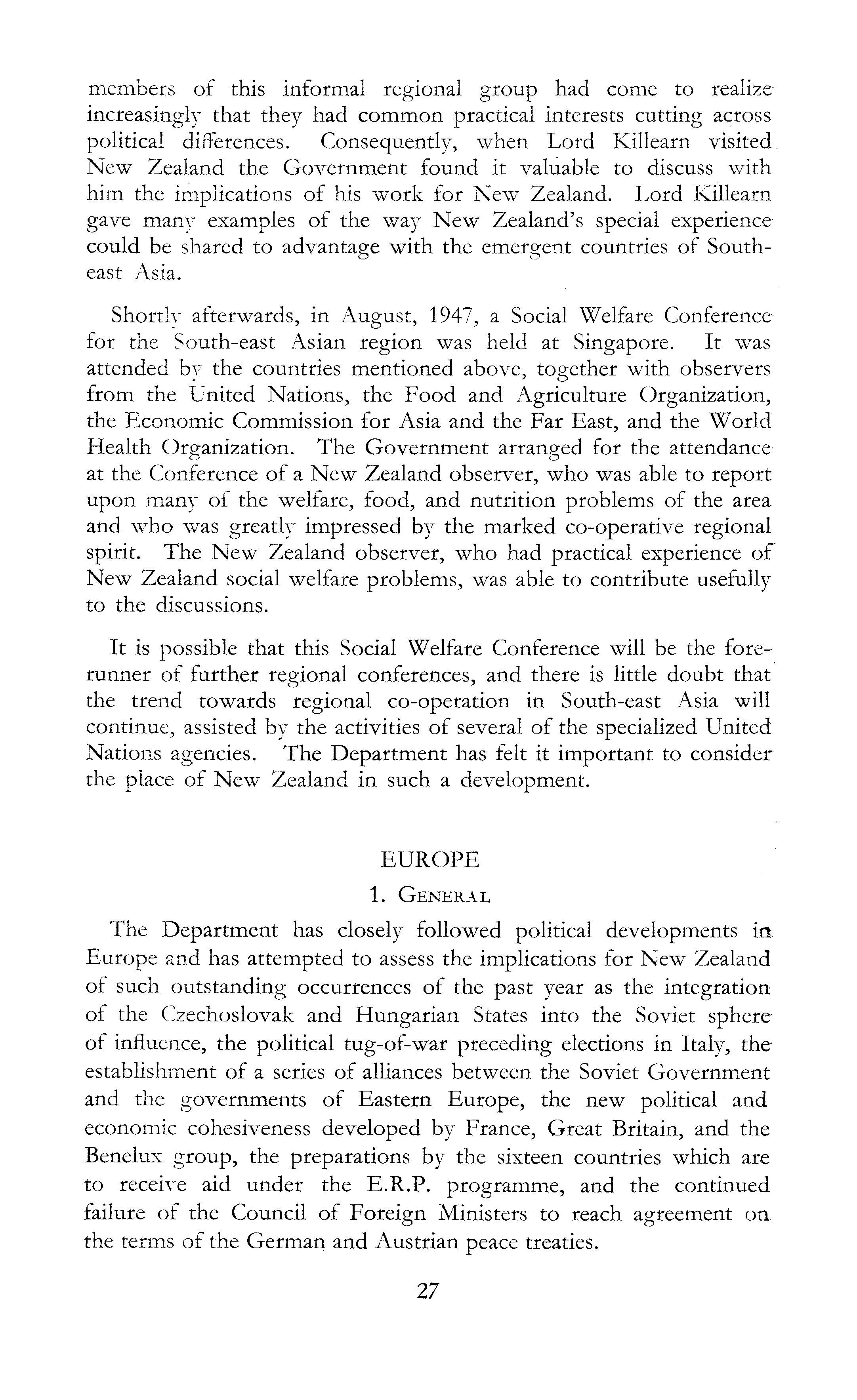members of this informal regional group had come to realizeincreasingly that they had common practical interests cutting across political differences. Consequently, when Lord Killearn visited. New Zealand the Government found it valuable to discuss with him the implications of his work for New Zealand. Lord Killearn gave many examples of the way New Zealand's special experience could be shared to advantage with the emergent countries of Southeast Asia. Shortly afterwards, in August, 1947, a Social Welfare Conference for the South-east Asian region was held at Singapore. It was attended by the countries mentioned above, together with observers; from the United Nations, the Food and Agriculture Organization, the Economic Commission for Asia and the Far East, and the World Health Organization. The Government arranged for the attendance at the Conference of a New Zealand observer, who was able to report upon many of the welfare, food, and nutrition problems of the area and who was greatly impressed by the marked co-operative regional spirit. The New Zealand observer, who had practical experience of New Zealand social welfare problems, was able to contribute usefully to the discussions. It is possible that this Social Welfare Conference will be the forerunner of further regional conferences, and there is little doubt that the trend towards regional co-operation in South-east Asia will continue, assisted by the activities of several of the specialized United Nations agencies. The Department has felt it important to consider the place of New Zealand in such a development. EUROPE 1. General The Department has closely followed political developments in Europe and has attempted to assess the implications for New Zealand of such outstanding occurrences of the past year as the integration of the Czechoslovak and Hungarian States into the Soviet sphere of influence, the political tug-of-war preceding elections in Italy, the establishment of a series of alliances between the Soviet Government and the governments of Eastern Europe, the new political and economic cohesiveness developed by France, Great Britain, and the Benelux group, the preparations by the sixteen countries which are to receive aid under the E.R.P. programme, and the continued failure of the Council of Foreign Ministers to reach agreement on the terms of the German and Austrian peace treaties.