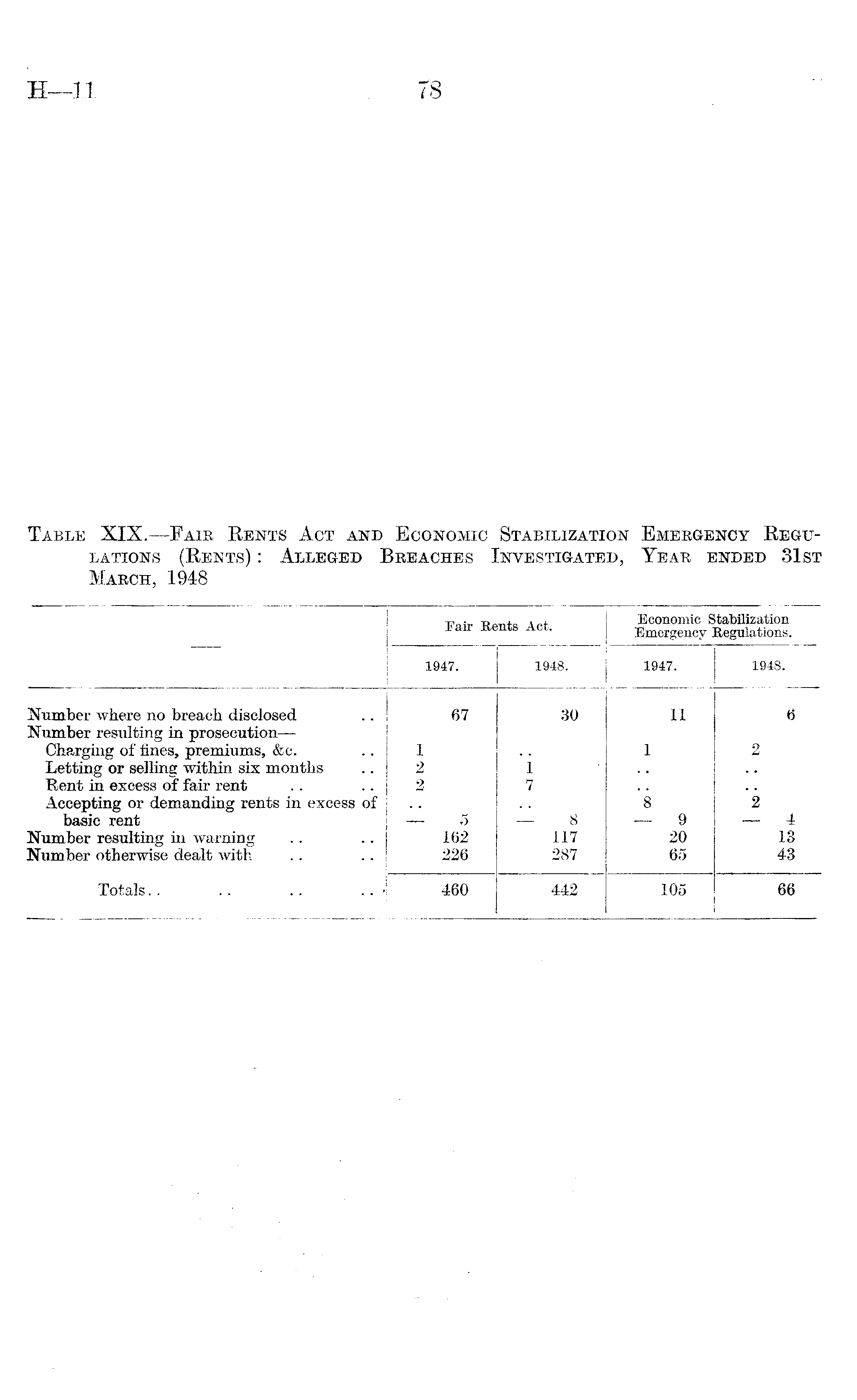 Table XIX.—Fair Rents Act and Economic Stabilization Emergency Regulations (Rents): Alleged Breaches Investigated, Year ended 31st March, 1948