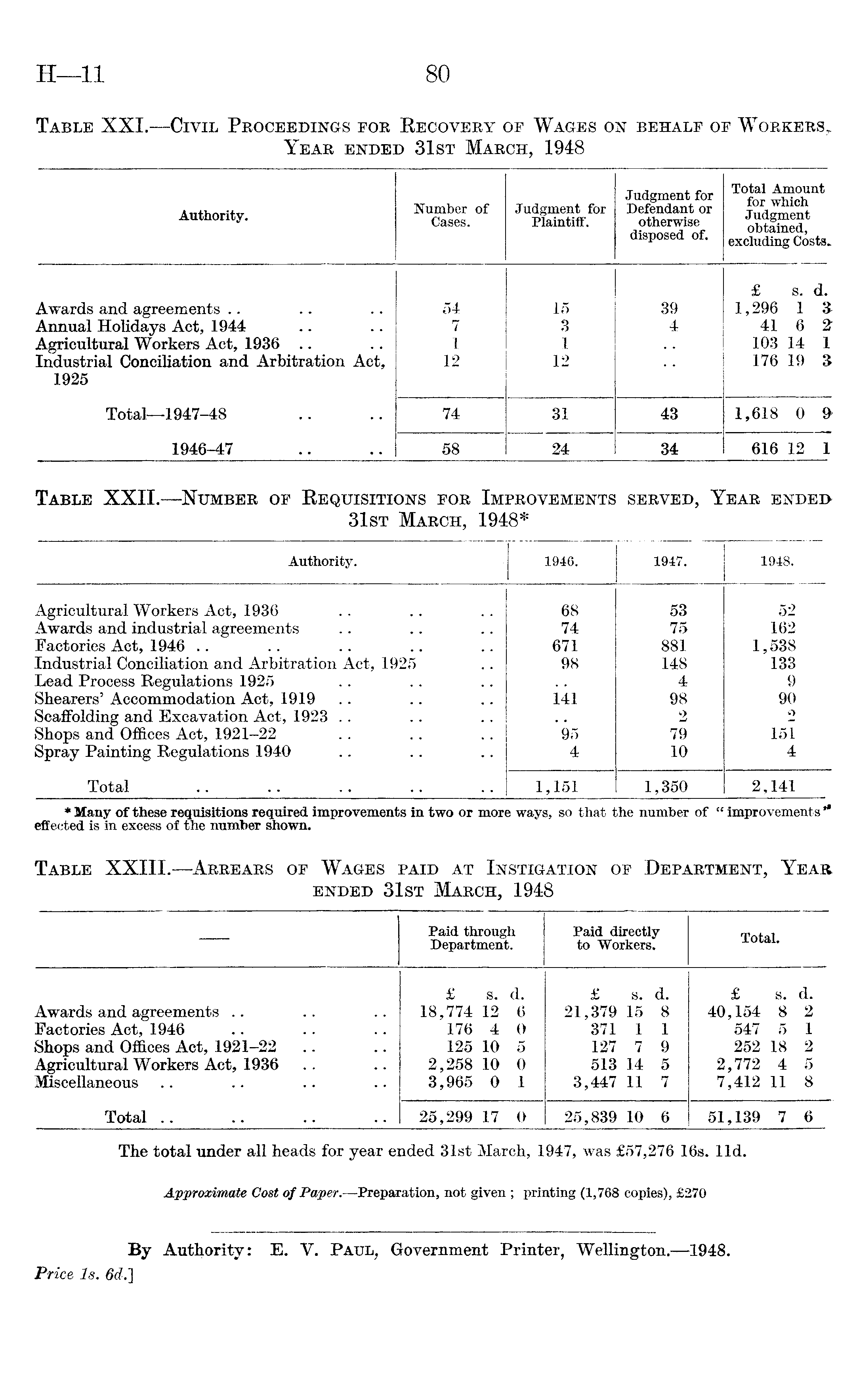 Table XXIII. —Arrears of Wages paid at Instigation of Department, Year ended 31st March, 1948