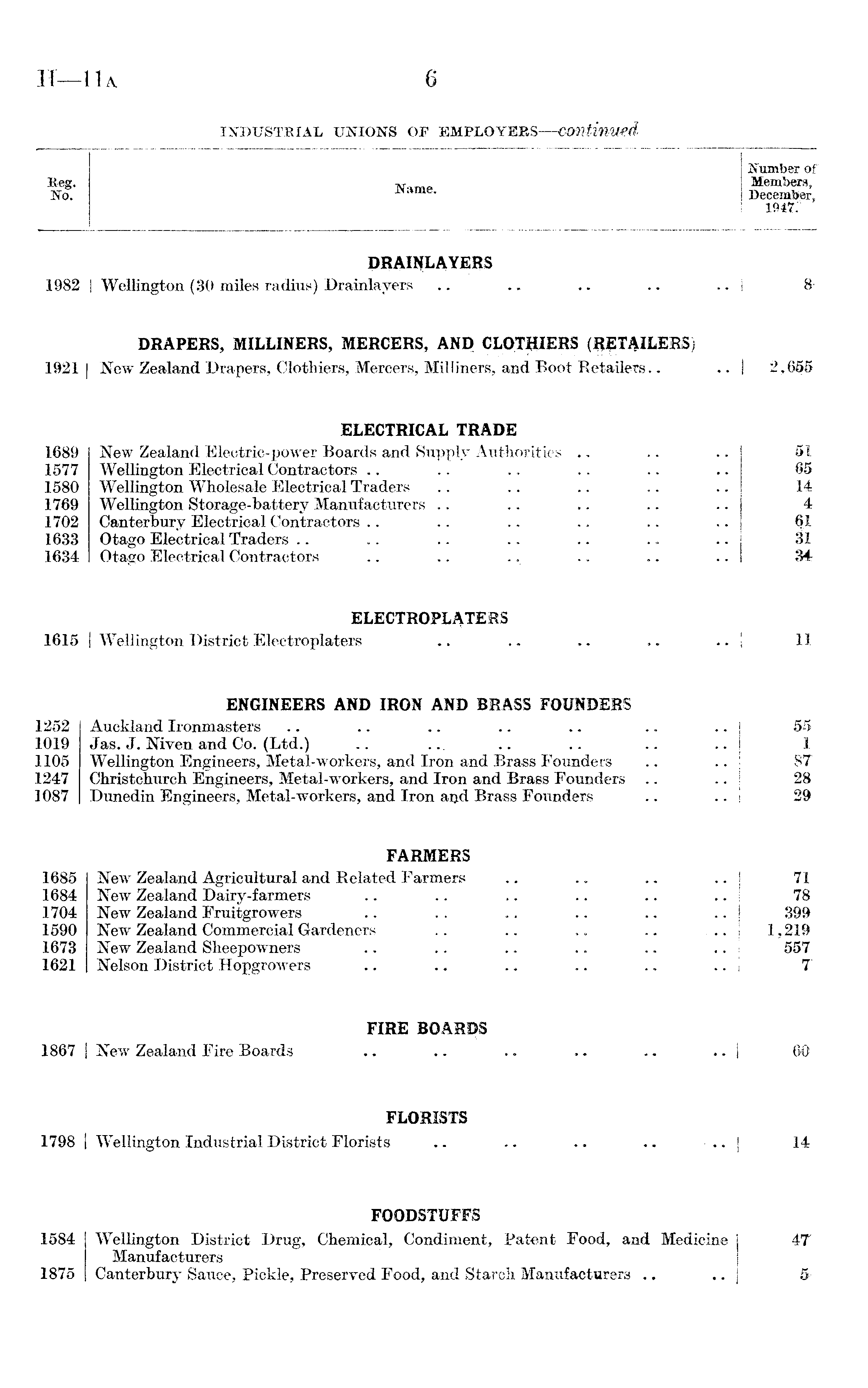 Keg. No. Name. Number of Members, December, 1982 DRAItfLAYERS I Wellington (30 miles radius) Drainlayers DRAPERS, MILLINERS, MERCERS, AND CLOTHIERS (RETAILERS) 1 81921 New Zealand Drapers, Clothiers, Mercers, Milliners, and Boot Retailers.. ELECTRICAL TRADE 1 2,655 1689 1577 1580 1769 1702 1633 1634 New Zealand Electric-power Boards and Supply Authorities Wellington Electrical Contractors Wellington Wholesale Electrical Traders Wellington Storage-battery Manufacturers Canterbury Electrical Contractors Otago Electrical Traders Otago Electrical Contractors ELECTR0PLATER5 51 65 14 4 61 31 34 1615 | Wellington District Electroplaters ENGINEERS AND IRON AND BRASS FOUNDERS 11 1252 1019 1105 1247 1087 Auckland Ironmasters Jas. J. Niven and Co. (Ltd.) Wellington Engineers, Metal-workers, and Iron and Brass Founders Christchurch Engineers, Metal-workers, and Iron and Brass Founders Dunedin Engineers, Metal-workers, and Iron and Brass Founders FARMERS 55 1 87 28 29 1685 1684 1704 1590 1673 1621 New Zealand Agricultural and Related Farmers New Zealand Dairy-farmers New Zealand Fruitgrowers New Zealand Commercial Gardeners New Zealand Sheepowners Nelson District Hopgrowers FIRE BOARDS 71 78 399 1,219 557 7 1867 New Zealand Fire Boards .. .. .. .. .. FLORISTS 60 1798 Wellington Industrial District Florists FOODSTUFFS 14 1584 1875 Wellington District Drug, Chemical, Condiment, Patent Food, and Medicine Manufacturers Canterbury Sauce, Pickle, Preserved Food, and Starch Manufacturers 47 5