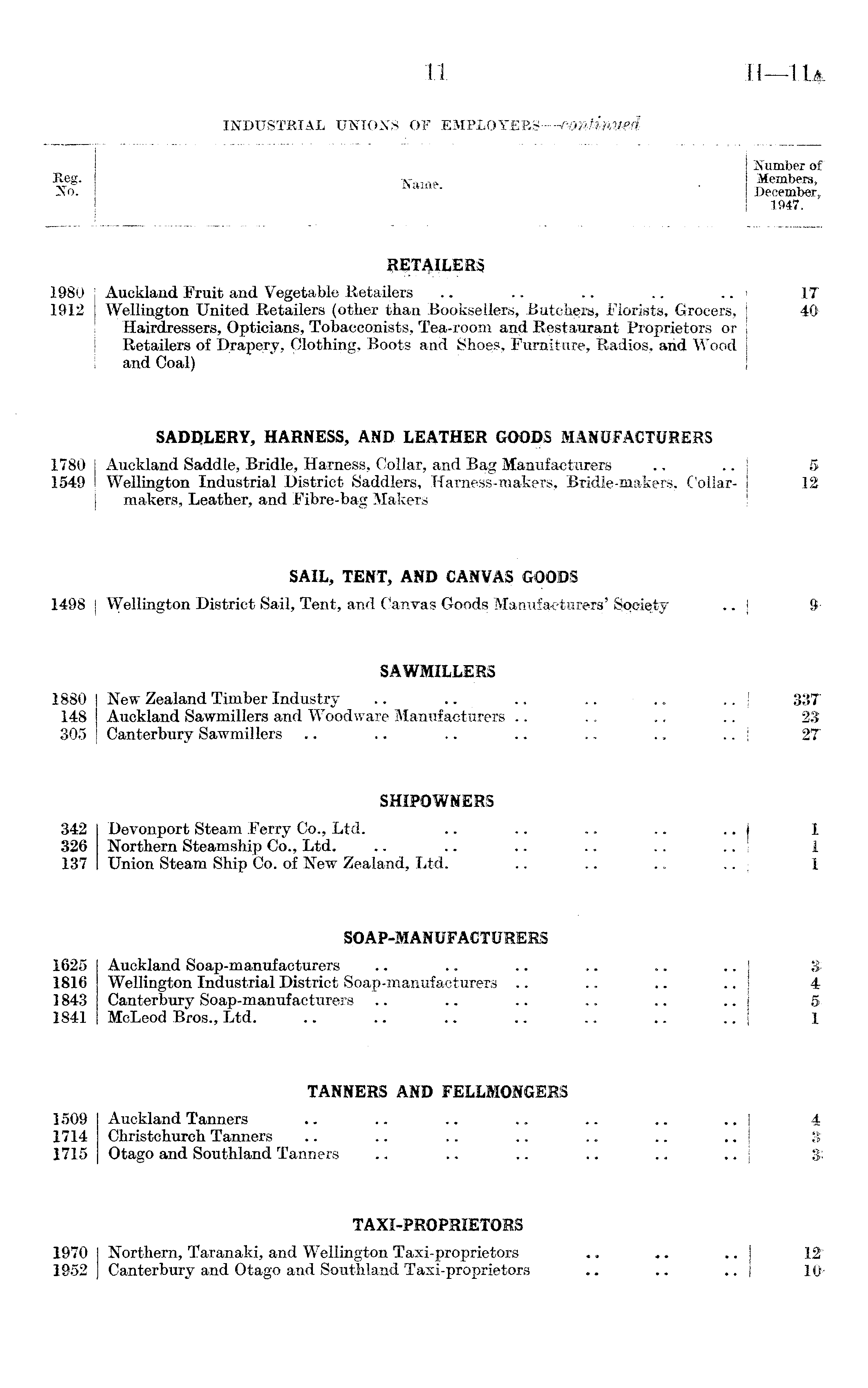 Beg. No. IS ame. jSTumber of Members, December, 1947. RETAILERS 1980 1912 Auckland Fruit and Vegetable Retailers Wellington United Retailers (other than Booksellers, Butchers, Florists, Grocers, Hairdressers, Opticians, Tobacconists, Tea-room and Restaurant Proprietors or Retailers of Drapery, Clothing, Boots and Shoes, Furniture, Radios, and Wood and Coal) SADDLERY, HARNESS, AND LEATHER GOODS MANUFACTURERS IT 40' 1780 1549 Auckland Saddle, Bridle, Harness, Collar, and Bag Manufacturers Wellington Industrial District Saddlers, Harness-makers, Bridle-makers, Collarmakers, Leather, and Fibre-bag Makers SAIL, TENT, AND CANVAS GOODS 5 12 1498 Wellington District Sail, Tent, and Canvas Goods Manufacturers' Society SAWMILLERS 91880 148 305 New Zealand Timber Industry .. .. .. .. Auckland Sawmillers and Woodware Manufacturers Canterbury Sawmillers SHIPOWNERS 337 23 2T 342 326 137 Devonport Steam Ferry Co., Ltd. Northern Steamship Co., Ltd. Union Steam Ship Co. of New Zealand, Ltd. SOAP-MANUFACTURERS I 1 1625 1816 1843 1841 Auckland Soap-manufacturers Wellington Industrial District Soap-manufacturers Canterbury Soap-manufacturers McLeod Bros., Ltd. TANNERS AND FELLMONGERS 3 4 ft 1 1509 1714 1715 Auckland Tanners Christchurch Tanners Otago and Southland Tanners TAXI-PROPRIETORS 4 3 i 3. 1970 1952 Northern, Taranaki, and Wellington Taxi-proprietors Canterbury and Otago and Southland Taxi-proprietors 1 12' 1 10>