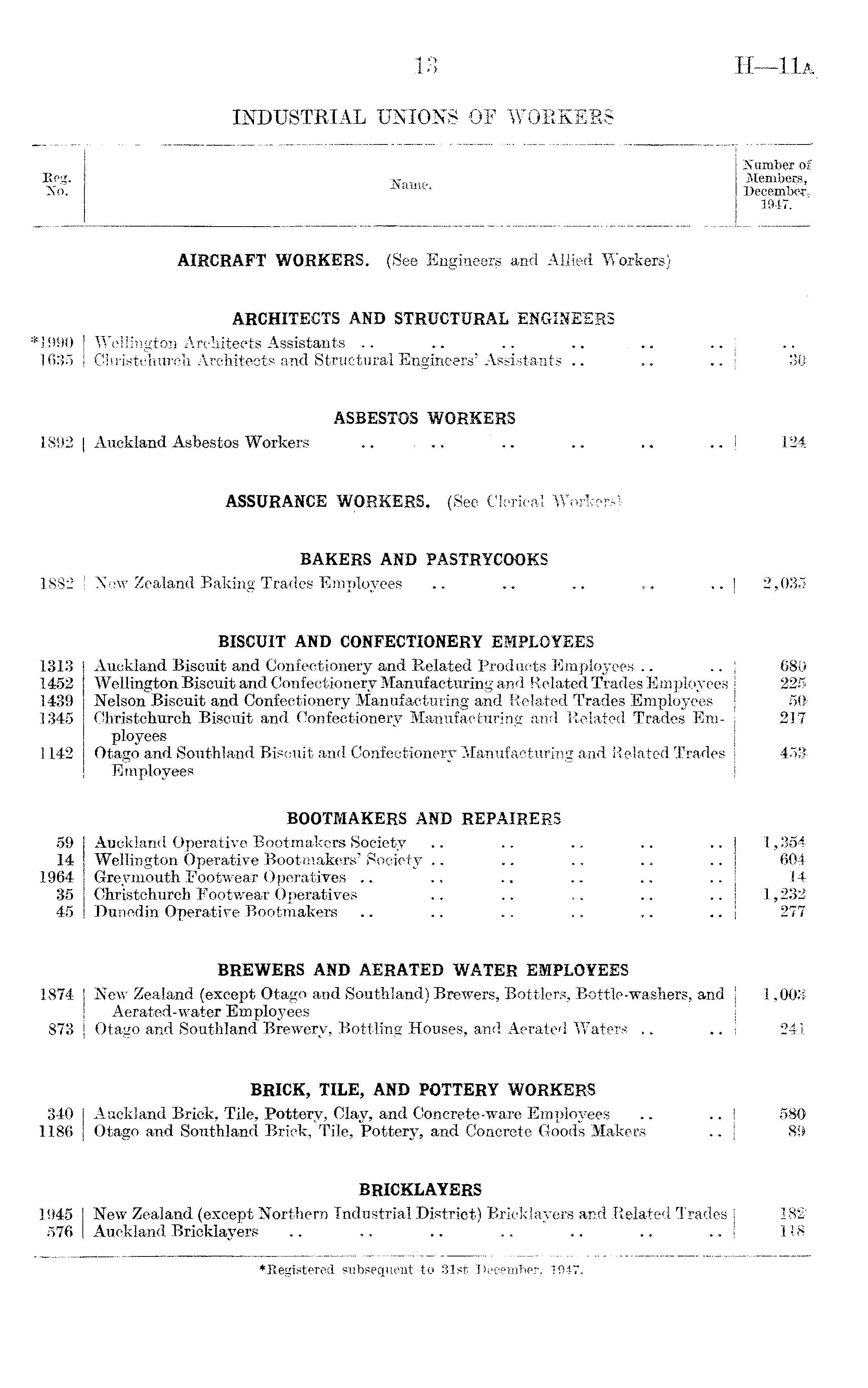 Beg. No. Name. Number of Members, 19-17. AIRCRAFT WORKERS. (See Engineers and Allied Workers) ARCHITECTS AND STRUCTURAL ENGINEERS *1990 1635 Wellington Areliiteets Assistants .. .. .. .. , .. .. Christchurch Architects and Structural Engineers' Assistants .. .. ASBESTOS WORKERS *30 a 00 Auckland Asbestos Workers .. ASSURANCE WORKERS. (See Clerical Workers) BAKERS AND PASTRYCOOKS I 124 1882 New Zealand Baking Trades Employees .. .. .. .. .. | BISCUIT AND CONFECTIONERY EMPLOYEES 2,035 1313 1452 1439 1345 Auckland Biscuit and Confectionery and Related Products Employees Wellington Biscuit and Confectionery Manufacturing and Related Trades Employees Nelson Biscuit and Confectionery Manufacturing and Related Trades Employees Christchurch Biscuit and Confectionery Manufacturing and Related Trades Employees Otago and Southland Biscuit and Confectionery Manufacturing and Related Trades Employees BOOTMAKERS AND REPAIRERS 680 225 50 217 1142 45359 14 1964 35 45 Auckland Operative Bootmakers Society Wellington Operative Bootmakers' Society Greymouth Footwear Operatives Christchurch Footwear Operatives Dunedin Operative Bootmakers .. .. .. .. BREWERS AND AERATED WATER EMPLOYEES 1,354 604 14 1,232 277 1874 873 New Zealand (except Otago and Southland) Brewers, Bottlers, Bottle-washers, and Aerated-water Employees Otago and Southland Brewery, Bottling Houses, and Aerated Waters .. • .. BRICK, TILE, AND POTTERY WORKERS 1,003 241 340 1186 k Auckland Brick, Tile, Pottery, Clay, and Concrete-ware Employees .. .. 1 Otago and Southland Brick, Tile, Pottery, and Concrete Goods Makers .. | BRICKLAYERS 580 89 1945 1 576 I New Zealand (except Northern Industrial District) Bricklayers and Related Trades I i Auckland Bricklayers .. .. .. .. .. .. .. j 182 118 ♦Registered subsequent to 31st December, 1947.