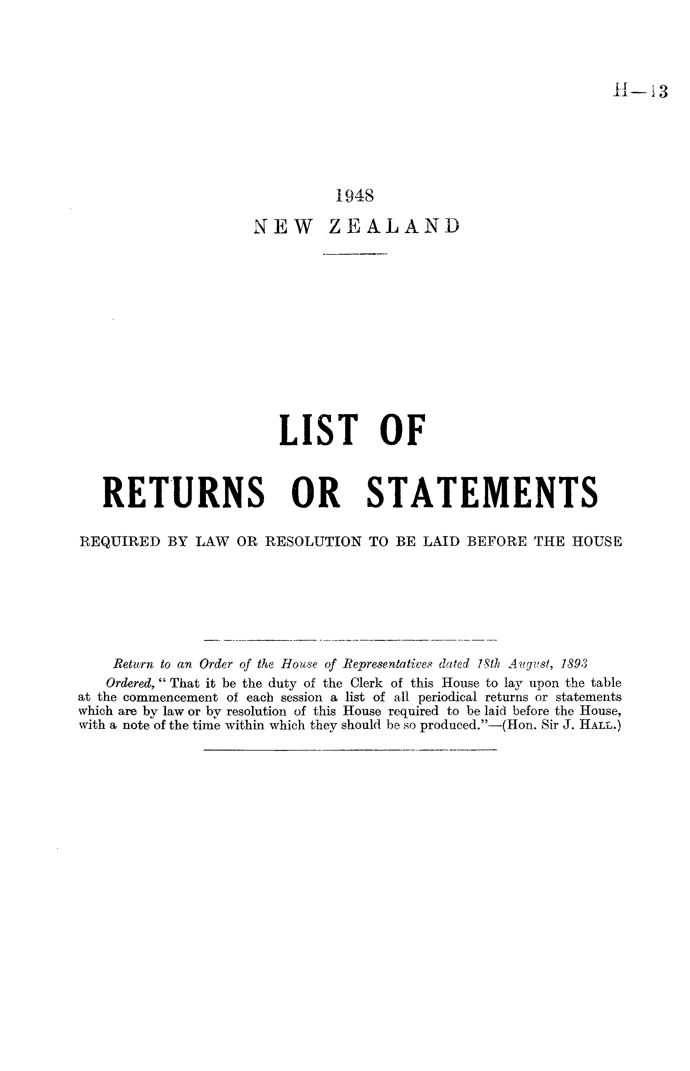 Return to an Order of the House of Representatives dated 18th August, 1893 Ordered, " That it be the duty of the Clerk of this House to lay upon the table at the commencement of each session a list of all periodical returns or statements which are by law or by resolution of this House required to be laid before the House, with a note of the time within which they should be so produced."—(Hon. Sir J. Hall.)