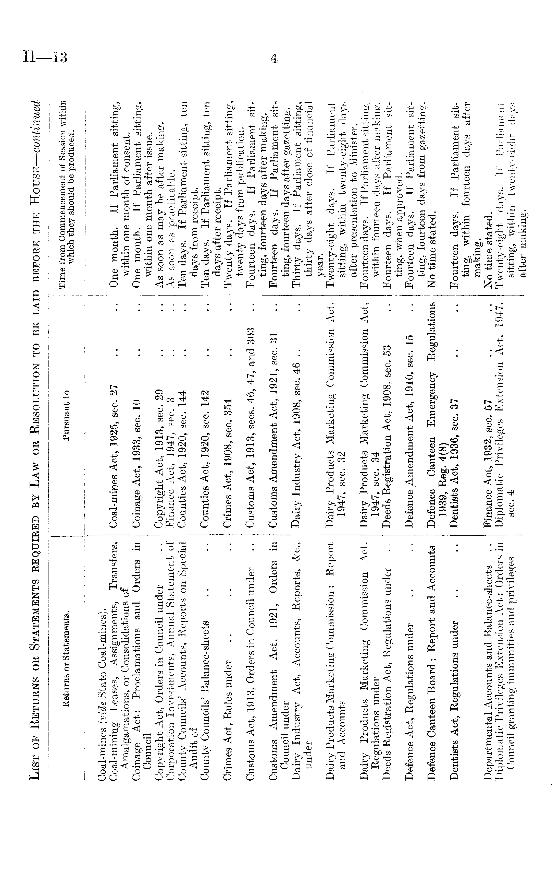 Returns or Statements. Pursuant to Time from Commencement of Session within which they should be produced. Ooal-mines (vide State Coal-mines). Coal-mining Leases, Assignments, Transfers, Coal-mines Act, 1925, sec. 27 One month. If Parliament sitting, Amalgamations, or Consolidations of within one month of consent. Coinage Act: Proclamations and Orders in Coinage Act, 1933, see. 10 One month. If Parliament sitting, Council within one month after issue. Copyright Act, Orders in Council under Copyright Act, 1913, sec. 29 As soon as may be after making. Corporation Investments, Annual Statement of Finance Act, 1947, sec. 3 As soon as practicable. County Councils' Accounts, Reports on Special Counties Act, 1920, sec. 144 Ten days. If Parliament sitting, ten Audit of days from receipt. County Councils' Balance-sheets Counties Act, 1920, sec. 142 Ten days. If Parliament sitting, ten Crimes Act, 1908, sec. 354 days after receipt. Crimes Act, Rules under Twenty days. If Parliament sitting, twenty days from publication. Customs Act, 1913, Orders in Council under Customs Act, 1913, sees. 46, 47, and 303 Fourteen days. If Parliament sitting, fourteen days after making. Customs Amendment Act, 1921, Orders in Customs Amendment Act, 1921, sec. 31 Fourteen days. If Parliament sitCouncil under Dairy Industry Act, 1908, sec. 46 . . ting, fourteen days after gazetting. Dairy Industry Act, Accounts, Reports, &c., Thirty days. If Parliament sitting, under thirty days after close of financial Dairy Products Marketing Commission : Report Dairy Products Marketing Commission Act, year. Twenty-eight days. If Parliament and Accounts 1947, sec. 32 sitting, within twenty-eight days after presentation to Minister. Dairy Products Marketing Commission Act, Dairy Products Marketing Commission Act, Fourteen days. If Parli ament sitting, Regulations under 1947, sec. 34 within fourteen days after making. Deeds Registration Act, Regulations under Deeds Registration Act, 1908, sec. 53 Fourteen days. If Parliament sitting, when approved. Defence Act, Regulations under Defence Amendment Act, 1910, sec. 15 Fourteen days. If Parliament sitting, fourteen days from gazetting. Defence Canteen Board: Report and Accounts Defence Canteen Emergency Regulations No time stated. 1939, Reg. 4(8) Dentists Act, Regulations under Dentists Act, 1936, sec. 37 Fourteen days. If Parliament sitting, within fourteen days after making. Departmental Accounts and Balance-sheets Finance Act, 1932, sec. 57 No time stated. Diplomatic Privileges Extension Act: Orders in Diplomatic Privileges Extension Act, 1947, Twenty-eight days. If Parliament Council granting immunities and privileges sec. 4 sitting, within twenty- eight, days after making.