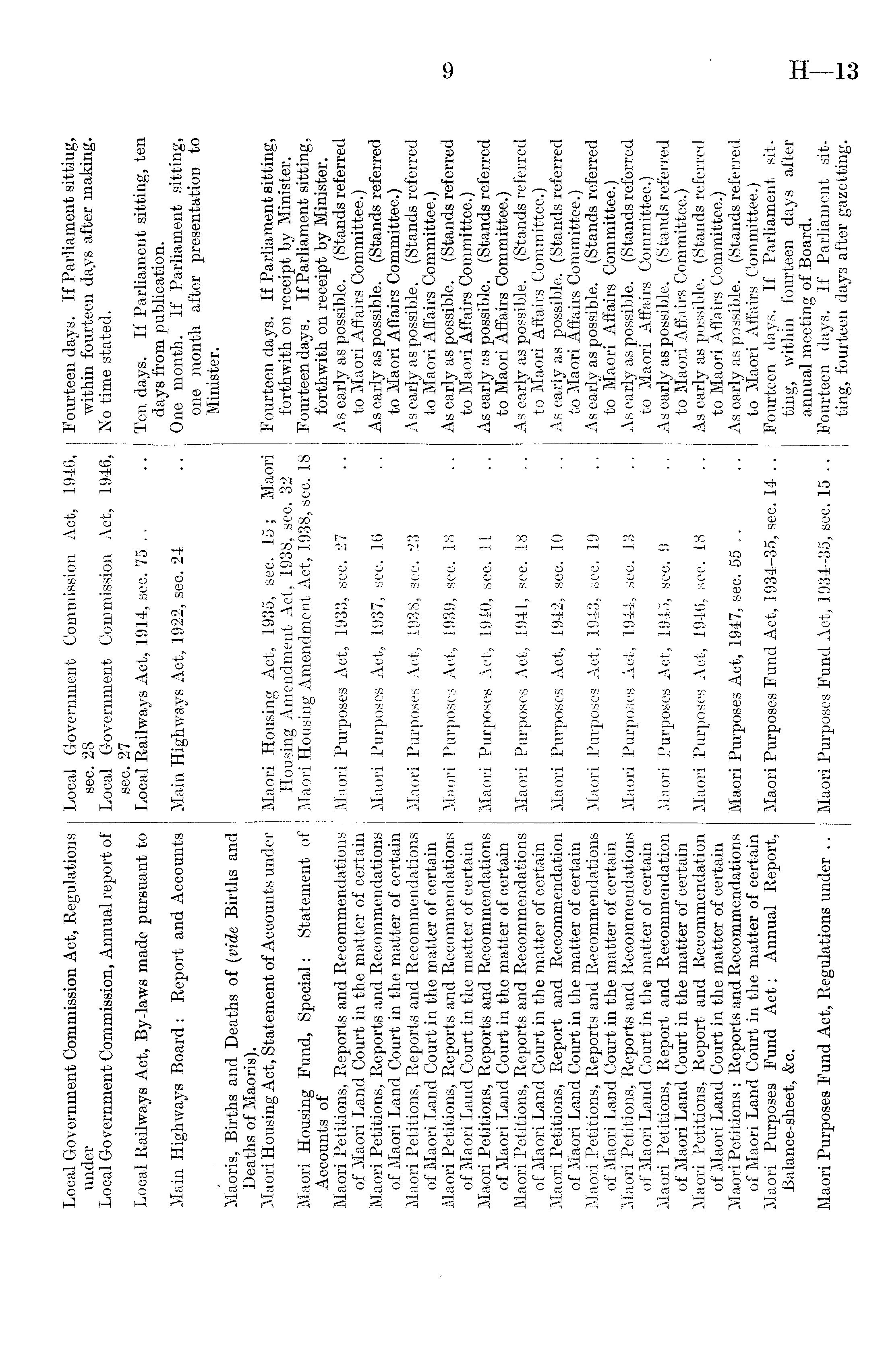 Local Government Commission Act, Regulations Local Government ( Commission Act, 1946, Fourteen days. If Parliament sitting, under sec. 28 within fourteen days after making. Local Government Commission, Annual report of Local Government < Commission Act, 1946, No time stated. Local Railways Act, By-laws made pursuant to btJt. A i Local Railways Act, 1914, sec. 75 .. Ten days. If Parliament sitting, ten days from publication. Main Highways Board : Report and Accounts Main Highways Act, 1922, sec. 24 One month. If Parliament sitting, one month after presentation to Minister. Maoris, Births and Deaths of (vide Births and Deaths of Maoris). Maori Housing Act, Statement of Accounts under Maori Housing Act, 1935, sec. 15; Maori Fourteen days. If Parliament sitting, Housing Amendment Act, 1938, sec. 32 forthwith on receipt by Minister. Maori Housing Fund, Special: Statement of Maori Housing Amendment Act, 1938, sec. 18 Fourteen days. If Parliament sitting, Accounts of forthwith on receipt by Minister. Maori Petitions, Reports and Recommendations Maori Purposes Act, 1933, sec. 27 As early as possible. (Stands referred of Maori Land Court in the matter of certain to Maori Affairs Committee.) Maori Petitions, Reports and Recommendations Maori Purposes Act, 1937, sec. 16 As early as possible. (Stands referred of Maori Land Court in the matter of certain to Maori Affairs Committee.) Maori Petitions, Reports and Recommendations Maori Purposes Act, 1938, sec. 23 As early as possible. (Stands referred of Maori Land Court in the matter of certain to Maori Affairs Committee.) Maori Petitions, Reports and Recommendations Maori Purposes Act, 1939, sec. 18 As early as possible. (Stands referred of Maori Land Court in the matter of certain to Maori Affairs Committee.) Maori Petitions, Reports and Recommendations Maori Purposes Act, 1940, sec. 11 As early as possible. (Stands referred of Maori Land Court in the matter of certain to Maori Affairs Committee.) Maori Petitions, Reports and Recommendations Maori Purposes Act, 1941, see. 18 As early as possible. (Stands referred of Maori Land Court in the matter of certain to Maori Affairs Committee.) Maori Petitions, Report and Recommendation Maori Purposes Act, 1942, sec. 10 As early as possible. (Stands referred of Maori Land Court in the matter of certain to Maori Affairs Committee.) Maori Petitions, Reports and Recommendations Maori Purposes Act, 1943, sec. 19 As early as possible. (Stands referred of Maori Land Court in the matter of certain to Maori Affairs Committee.) Maori Petitions, Reports and Recommendations Maori Purposes Act, 1944, sec. 13 As early as possible. (Stands referred of Maori Land Court in the matter of certain to Maori Affairs Committee.) Maori Petitions, Report and Recommendation Maori Purposes Act, 1945, sec. 9 As early as possible. (Stands referred of Maori Land Court in the matter of certain to Maori Affairs Committee.) Maori Petitions, Report and Recommendation Maori Purposes Act, 1946, sec. 18 As early as possible. (Stands referred of Maori Land Court in the matter of certain to Maori Affairs Committee.) Maori Petitions : Reports and Recommendations Maori Purposes Act, 1947, sec. 55 . . As early as possible. (Stands referred of Maori Land Court in the matter of certain to Maori Affairs Committee.) Maori Purposes Fund Act: Annual Report, Maori Purposes Fund Act, 1934-35, sec. 14 .. Fourteen days. If Parliament sit-Balance-sheet, &c. ting, within fourteen days after annual meeting of Board. Maori Purposes Fund Act, Regulations under .. Maori Purposes Fund Act, 1934-35, sec. 15 .. Fourteen days. If Parliament sitting, fourteen days after gazetting.