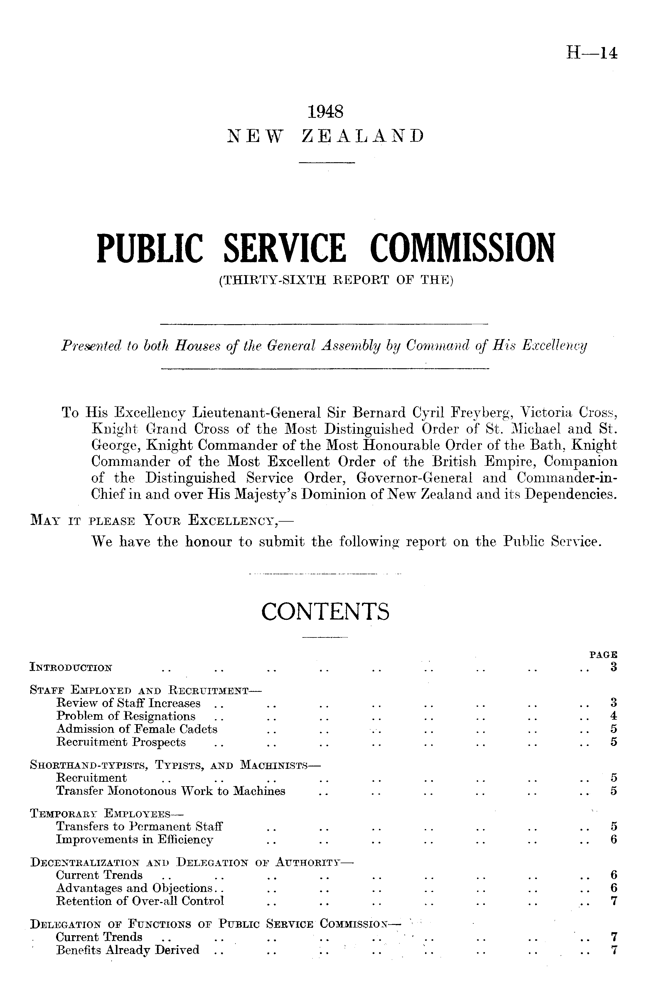 To His Excellency Lieutenant-General Sir Bernard Cyril Freyberg, Victoria Cross, Knight Grand Cross of the Most Distinguished Order of St. Michael and St. Knight Commander of the Most Honourable Order of the Bath, Knight Commander of the Most Excellent Order of the British Empire, Companion of the Distinguished Service Order, Governor-General and Commander-in-Chief in and over His Majesty's Dominion of New Zealand and its Dependencies. May it please Your Excellency,— We have the honour to submit the following report on the Public Service.