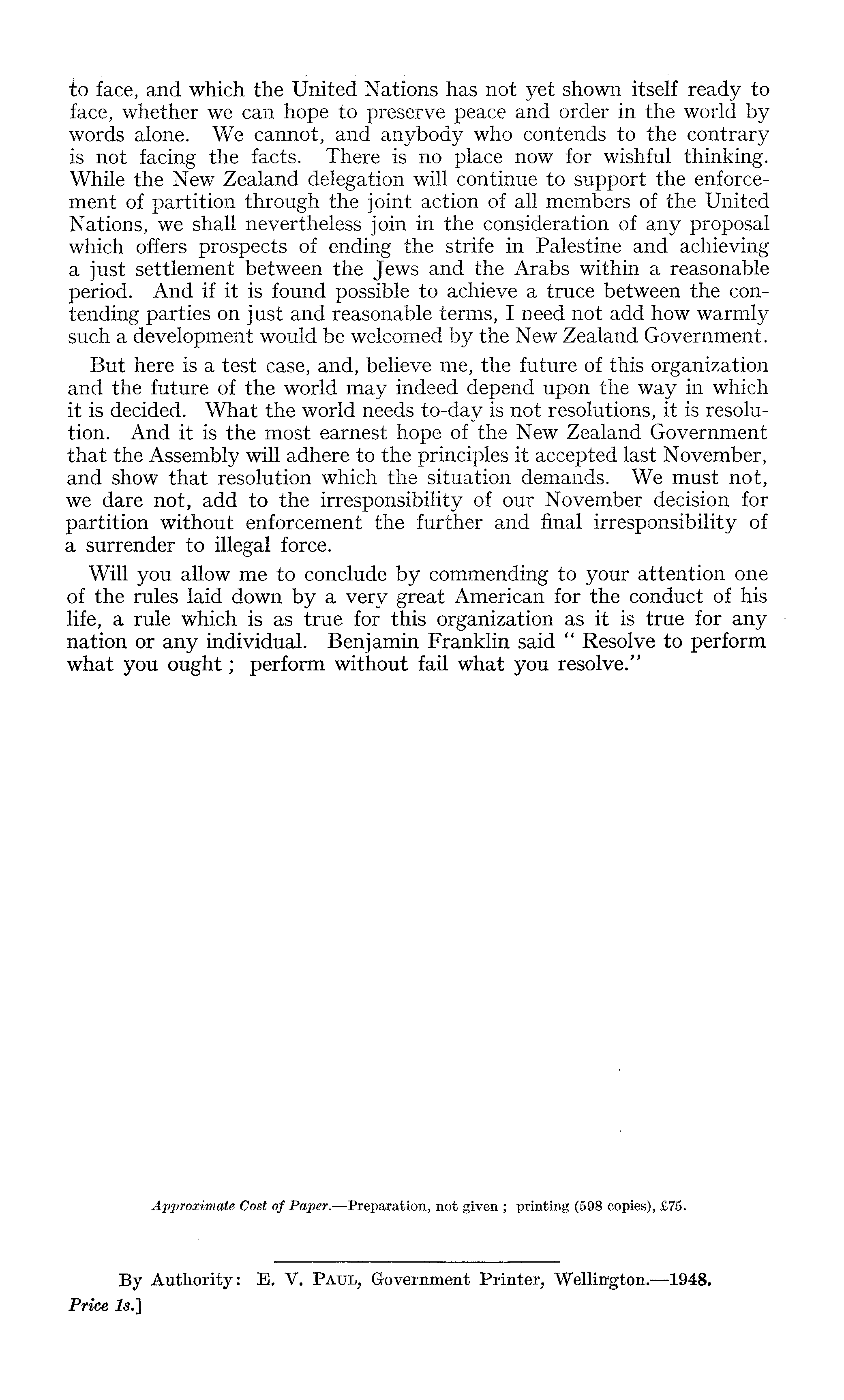 to face, and which the United Nations has not yet shown itself ready to face, whether we can hope to preserve peace and order in the world by words alone. We cannot, and anybody who contends to the contrary is not facing the facts. There is no place now for wishful thinking. While the New Zealand delegation will continue to support the enforcement of partition through the joint action of all members of the United Nations, we shall nevertheless join in the consideration of any proposal which offers prospects of ending the strife in Palestine and achieving a just settlement between the Jews and the Arabs within a reasonable period. And if it is found possible to achieve a truce between the contending parties on just and reasonable terms, I need not add how warmly such a development would be welcomed by the New Zealand Government. But here is a test case, and, believe me, the future of this organization and the future of the world may indeed depend upon the way in which it is decided. What the world needs to-day is not resolutions, it is resolution. And it is the most earnest hope of the New Zealand Government that the Assembly will adhere to the principles it accepted last November, and show that resolution which the situation demands. We must not, we dare not, add to the irresponsibility of our November decision for partition without enforcement the further and final irresponsibility of a surrender to illegal force. Will you allow me to conclude by commending to your attention one of the rules laid down by a very great American for the conduct of his life, a rule which is as true for this organization as it is true for any nation or any individual. Benjamin Franklin said " Resolve to perform what you ought; perform without fail what you resolve."