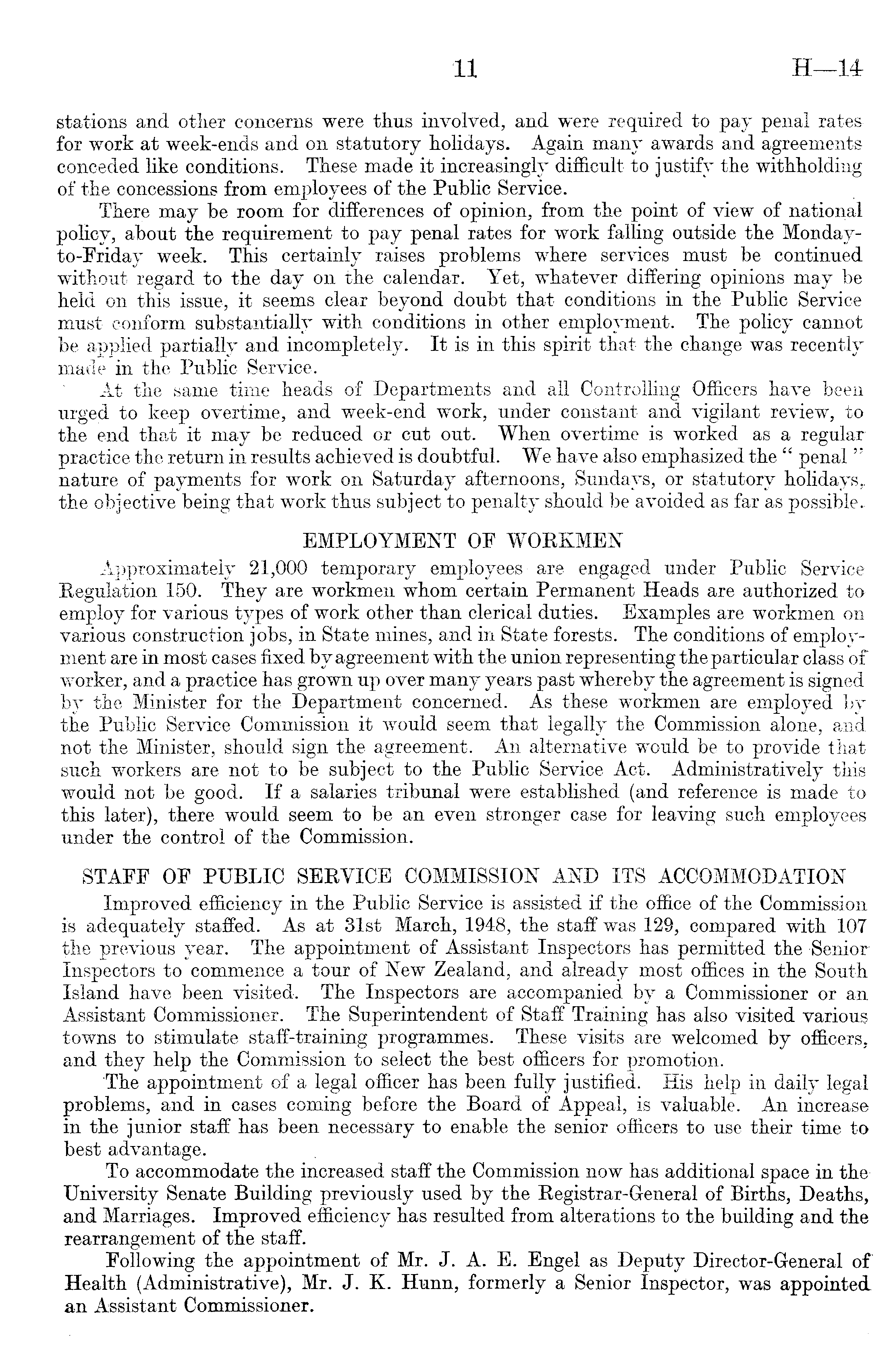stations and other concerns were thus involved, and were required to pay penal rates for work at week-ends and on statutory holidays. Again many awards and agreements conceded like conditions. These made it increasingly difficult to justify the withholding of the concessions from employees of the Public Service. There may be room for differences of opinion, from the point of view of national policy, about the requirement to pay penal rates for work falling outside the Monday-to-Friday week. This certainly raises problems where services must be continued without regard to the day on the calendar. Yet, whatever differing opinions may be held on this issue, it seems clear beyond doubt that conditions in the Public Service must conform substantially with conditions in other employment. The policy cannot be applied partially and incompletely. It is in this spirit that the change was recently made in the Public Service. At the same time heads of Departments and all Controlling Officers have been urged to keep overtime, and week-end work, under constant and vigilant review, to the end that it may be reduced or cut out. When overtime is worked as a regular practice the return in results achieved is doubtful. We have also emphasized the " penal " nature of payments for work on Saturday afternoons, Sundays, or statutory holidays, the objective being that work thus subject to penalty should be avoided as far as possible. EMPLOYMENT OP WORKMEN Approximately 21,000 temporary employees are engaged under Public Service Eegulation 150. .They are workmen whom certain Permanent Heads are authorized to employ for various types of work other than clerical duties. Examples are workmen on various construction jobs, in State mines, and in State forests. The conditions of employment are in most cases fixed by agreement with the union representing the particular class of worker, and a practice has grown up over many years past whereby the agreement is signed by the Minister for the Department concerned. As these workmen are employed by the Public Service Commission it would seem that legally the Commission alone, and not the Minister, should sign the agreement. An alternative would be to provide that such workers are not to be subject to the Public Service Act. Administratively this would not be good. If a salaries tribunal were established (and reference is made to this later), there would seem to be an even stronger case for leaving such employees under the control of the Commission. STAFF OF PUBLIC SERVICE COMMISSION AND ITS ACCOMMODATION Improved efficiency in the Public Service is assisted if the office of the Commission is adequately staffed. As at 31st March, 1948, the staff was 129, compared with 10T the previous year. The appointment of Assistant Inspectors has permitted the Senior Inspectors to commence a tour of New Zealand, and already most offices in the South Island have been visited. The Inspectors are accompanied by a Commissioner or an Assistant Commissioner. The Superintendent of Staff Training has also visited various towns to stimulate staff-training programmes. These visits are welcomed by officers, and they help the Commission to select the best officers for promotion. The appointment of a legal officer has been fully justified. His help in daily legal problems, and in cases coming before the Board of Appeal, is valuable. An increase in the junior staff has been necessary to enable the senior officers to use their time to best advantage. To accommodate the increased staff the Commission now has additional space in the University Senate Building previously used by the Registrar-General of Births, Deaths, and Marriages. Improved efficiency has resulted from alterations to the building and the rearrangement of the staff. Following the appointment of Mr. J, A. E. Engel as Deputy Director-General of Health (Administrative), Mr. J. K. Hunn, formerly a Senior Inspector, was appointed an Assistant Commissioner.