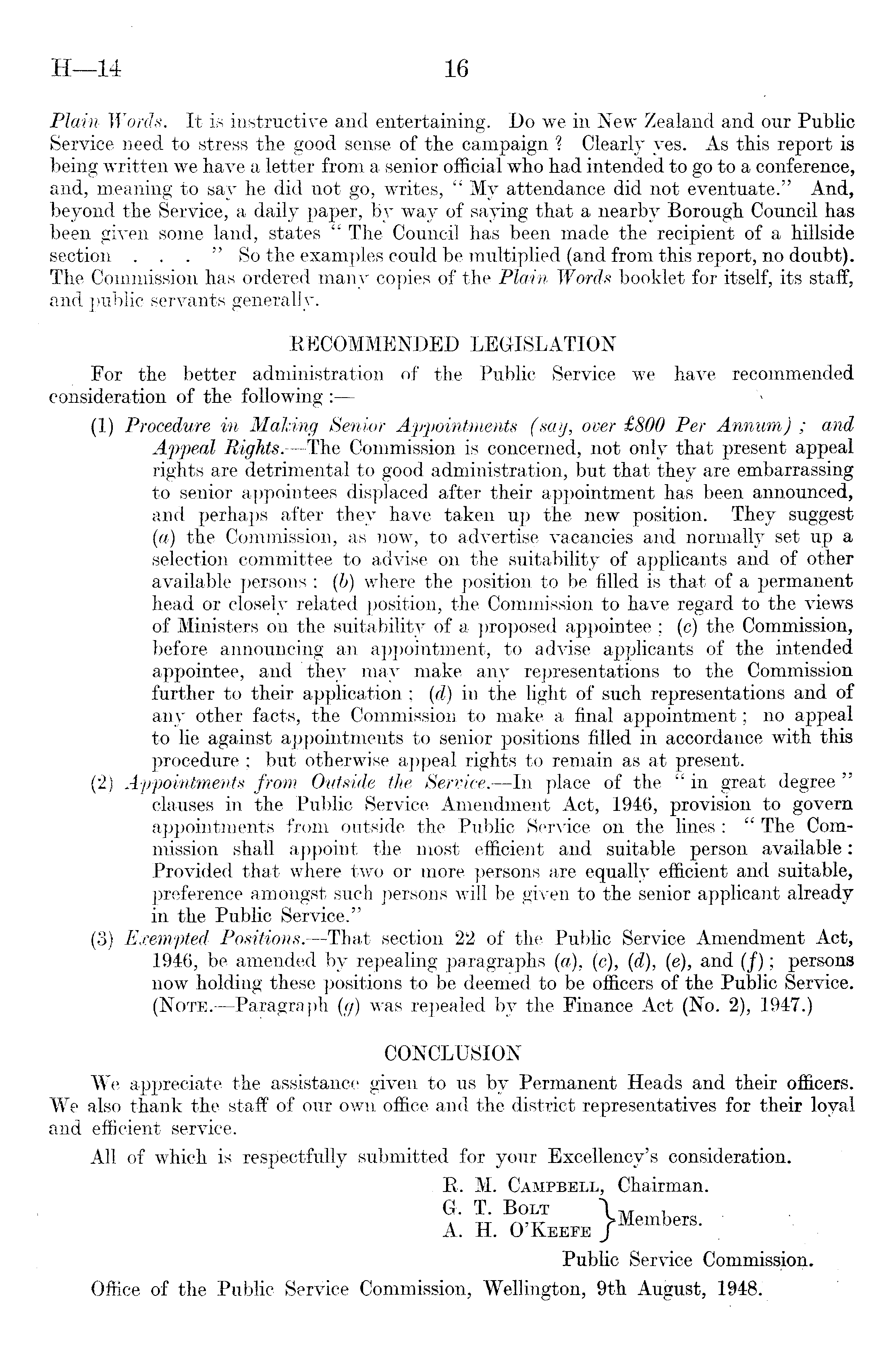 Plain Words. It is instructive and entertaining. Do we in New Zealand and our Public Service need to stress the good sense of the campaign ? Clearly yes. As this report is being written we have a letter from a senior official who had intended to go to a conference, and, meaning to say he did not go, writes, "My attendance did not eventuate." And, beyond the Service, a daily paper, by way of saying that a nearby Borough Council has been given some land, states " The Council has been made the recipient of a hillside section ..." So the examples could be multiplied (and from this report, no doubt). The Commission has ordered many copies of the Plain Words booklet for itself, its staff, and public servants generally. RECOMMENDED LEGISLATION For the better administration of the Public Service we have recommended consideration of the following : (1) Procedure in Making Senior Appointments (say, over £BOO Per Annum) ; and Appeal Rights. —The Commission is concerned, not only that present appeal rights are detrimental to good administration, but that they are embarrassing to senior appointees displaced after their appointment has been announced, and perhaps after they have taken up the new position. They suggest (a) the Commission, as now, to advertise vacancies and normally set up a selection committee to advise on the suitability of applicants and of other available persons ; (b) where the position to be filled is that of a permanent head or closely related position, the Commission to have regard to the views of Ministers on the suitability of a proposed appointee ; (c) the Commission, before announcing an appointment, to advise applicants of the intended appointee, and they may make any representations to the Commission further to their application ; (d) in the light of such representations and of any other facts, the Commission to make a final appointment; no appeal to lie against appointments to senior positions filled in accordance with this procedure ; but otherwise appeal rights to remain as at present. (2) Appointments from Outside the Service. —In place of the "in great degree " clauses in the Public Service Amendment Act, 1946, provision to govern appointments from outside the Public Service on the lines : " The Commission shall appoint the most efficient and suitable person available: Provided that where two or more persons are equally efficient and suitable, preference amongst such persons will be given to the senior applicant already in the Public Service." (3) Exempted Positions. —That section 22 of the Public Service Amendment Act, 1946, be amended by repealing paragraphs (a), (c), (d), (e), and (/); persons now holding these positions to be deemed to be officers of the Public Service. (Note. —Paragraph (g) was repealed by the Finance Act (No. 2), 1947.) CONCLUSION We appreciate the assistance given to us by Permanent Heads and their officers. We also thank the staff of our own office and the district representatives for their loyal and efficient service. All of which is respectfully submitted for your Excellency's consideration. R. M. Campbell, Chairman. G. T. Bolt , A. H. O'Keefe J MemberS - Public Service Commission. Office of the Public Service Commission, Wellington, 9th August, 1948.