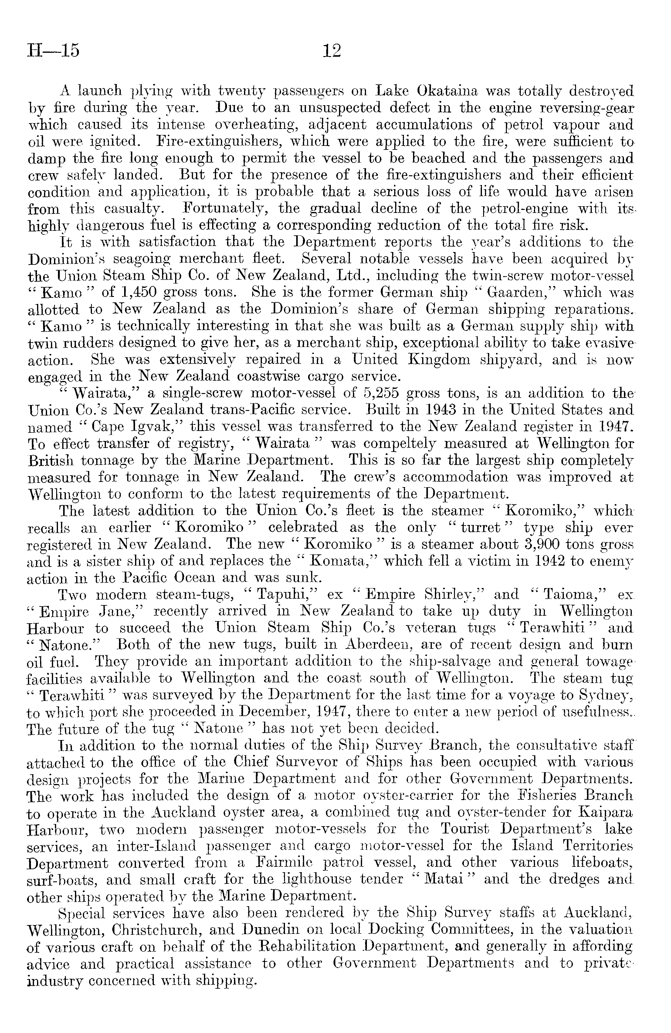 A launch plying with twenty passengers on Lake Okataina was totally destroyed by fire during the year. Due to an unsuspected defect in the engine reversing-gear which caused its intense overheating, adjacent accumulations of petrol vapour and oil were ignited. Fire-extinguishers, which were applied to the fire, were sufficient to damp the fire long enough to permit the vessel to be beached and the passengers and crew safely landed. But for the presence of the fire-extinguishers and their efficient condition and application, it is probable that a serious loss of life would have arisen from this casualty. Fortunately, the gradual decline of the petrol-engine with itshighly dangerous fuel is effecting a corresponding reduction of the total fire risk. It is with satisfaction that the Department reports the year's additions to the Dominion's seagoing merchant fleet. Several notable vessels have been acquired by the Union Steam Ship Co. of New Zealand, Ltd., including the twin-screw motor-vessel " Kamo " of 1,450 gross tons. She is the former German ship " Gaarden," which was allotted to New Zealand as the Dominion's share of German shipping reparations.. " Kamo " is technically interesting in that she was built as a German supply ship with twin rudders designed to give her, as a merchant ship, exceptional ability to take evasive action. She was extensively repaired in a United Kingdom shipyard, and is now engaged in the New Zealand coastwise cargo service. " Wairata," a single-screw motor-vessel of 5,255 gross tons, is an addition to the Union Co.'s New Zealand trans-Pacific service. Built in 1943 in the United States and named " Cape Igvak," this vessel was transferred to the New Zealand register in 1947. To effect transfer of registry, " Wairata " was compeltely measured at Wellington for British tonnage by the Marine Department. This is so far the largest ship completely measured for tonnage in New Zealand. The crew's accommodation was improved at Wellington to conform to the latest requirements of the Department. The latest addition to the Union Co.'s fleet is the steamer " Koromiko," which recalls an earlier " Koromiko" celebrated as the only " turret" type ship ever registered in New Zealand. The new " Koromiko "is a steamer about 3,900 tons grossand is a sister ship of and replaces the " Komata," which fell a victim in 1942 to enemy action in the Pacific Ocean and was sunk. Two modern steam-tugs, " Tapuhi," ex " Empire Shirley," and " Taioma," ex " Empire Jane," recently arrived in New Zealand to take up duty in Wellington Harbour to succeed the Union Steam Ship Co.'s veteran tugs " Terawhiti" and " Natone." Both of the new tugs, built in Aberdeen, are of recent design and burn oil fuel. They provide an important addition to the ship-salvage and general towage facilities available to Wellington and the coast south of Wellington. The steam tug " Terawhiti " was surveyed by the Department for the last time for a voyage to Sydney,, to which port she proceeded in December, 1947, there to enter a new period of usefulness.. The future of the tug " Natone " has not yet been decided. In addition to the normal duties of the Ship Survey Branch, the consultative staff' attached to the office of the Chief Surveyor of Ships has been occupied with various design projects for the Marine Department and for other Government Departments. The work has included the design of a motor oyster-carrier for the Fisheries Branch to operate in the Auckland oyster area, a combined tug and oyster-tender for Kaipara Harbour, two modern passenger motor-vessels for the Tourist Department's lake services, an inter-Island passenger and cargo motor-vessel for the Island Territories Department converted from a Fairmile patrol vessel, and other various lifeboats, surf-boats, and small craft for the lighthouse tender " Matai" and the dredges and other ships operated by the Marine Department. Special services have also been rendered by the Ship Survey staffs at Auckland, Wellington, Christchurch, and Dunedin on local Docking Committees, in the valuation of various craft on behalf of the Rehabilitation Department, and generally in affording advice and practical assistance to other Government Departments and to private' industry concerned with shipping.